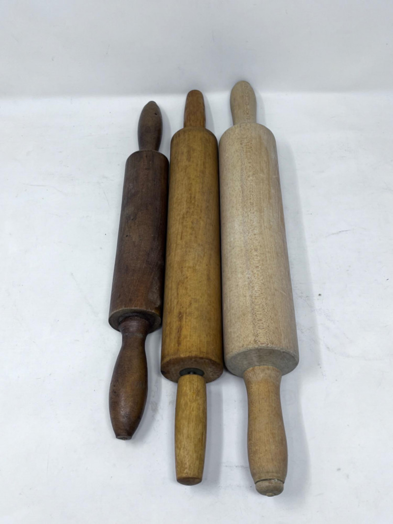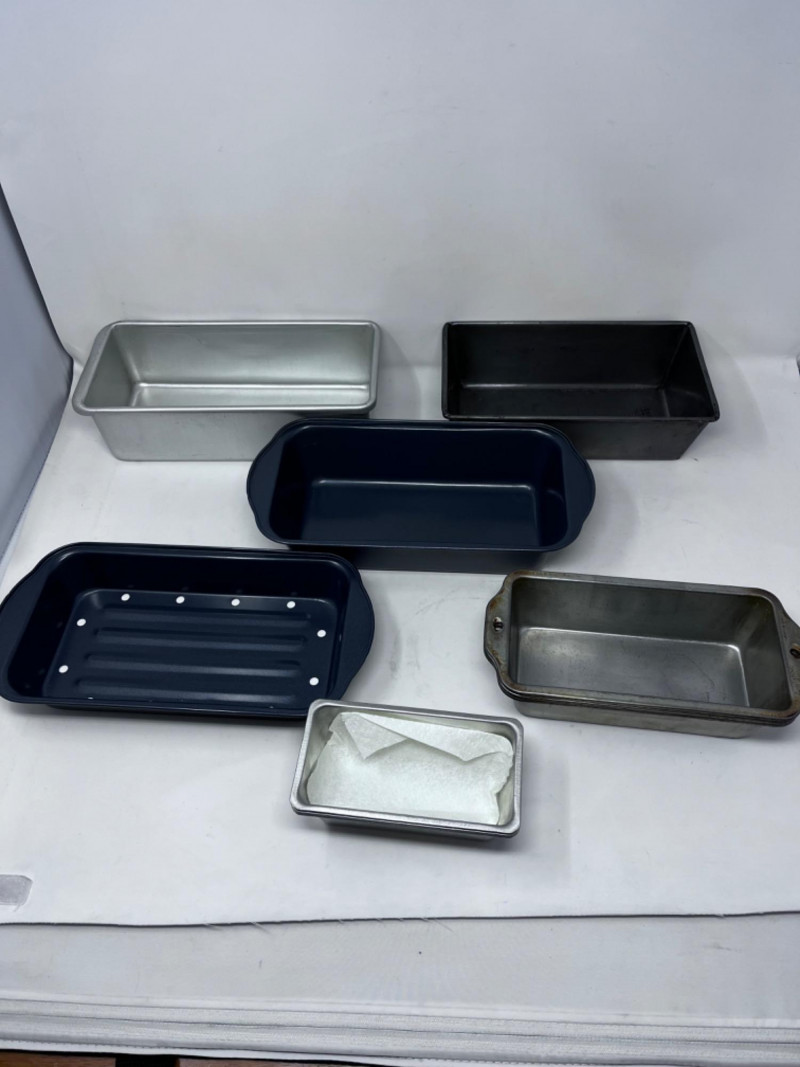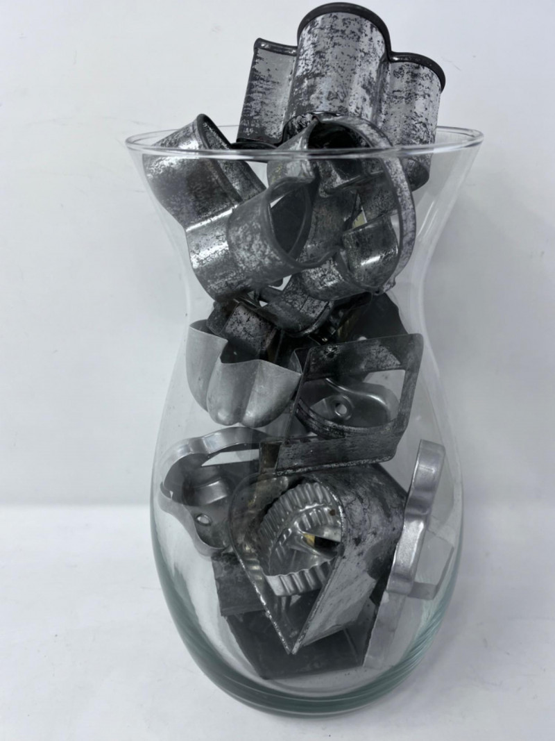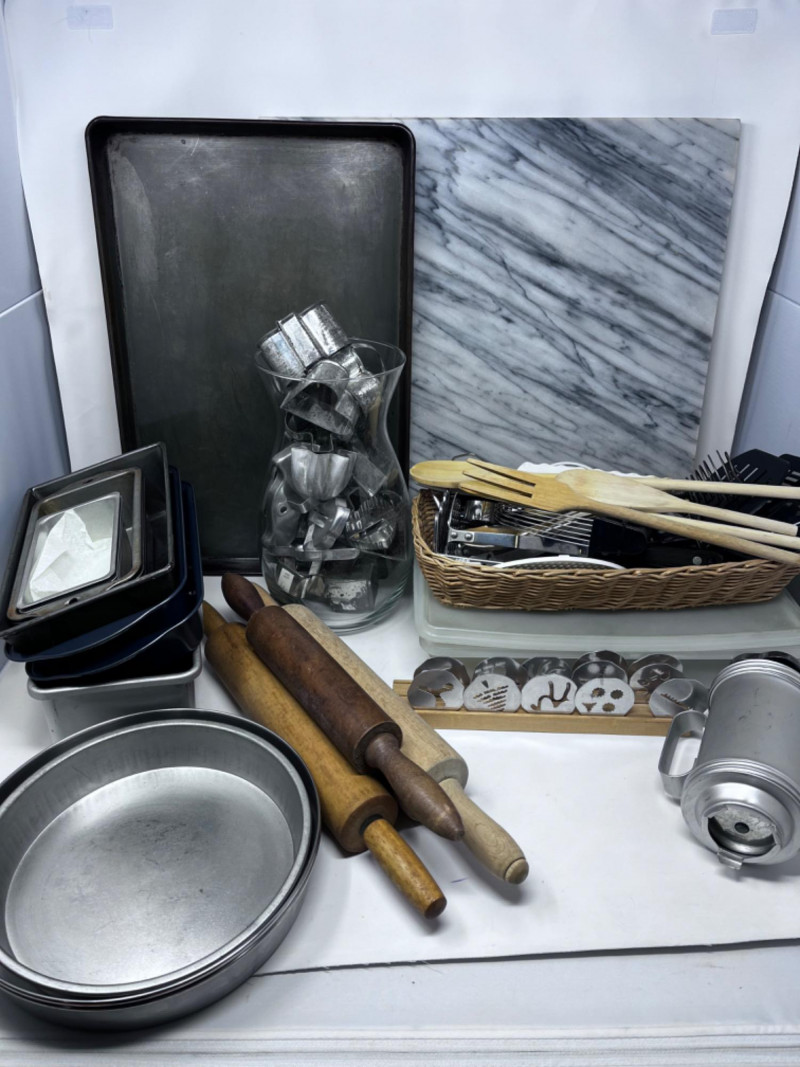 Marble Pastry Board & Baking Ware Marble board is 18”x18”. Eleven loaf pans. Biggest is 10.5”x5”. Basket and plastic container full of cooking/baking utensils. Three rolling pins. Smallest is warped. 18”x12” cookie sheet. Four cake pans. Biggest is 8.5” Cookie press with cookie discs. Some discs are missing. Glass vase full of vintage aluminum cookie cutters.