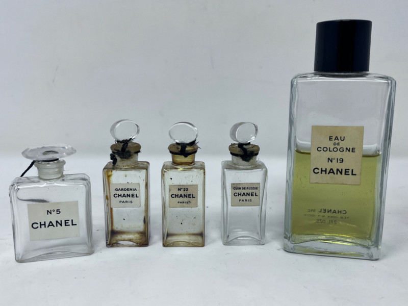 Vintage Chanel Perfumes Chanel No5 In the original box set: Chanel Gardenia Chanel No22 Paris Chanel Cuir De Russie Paris Eau De Cologne No19 with half bottle cologne
