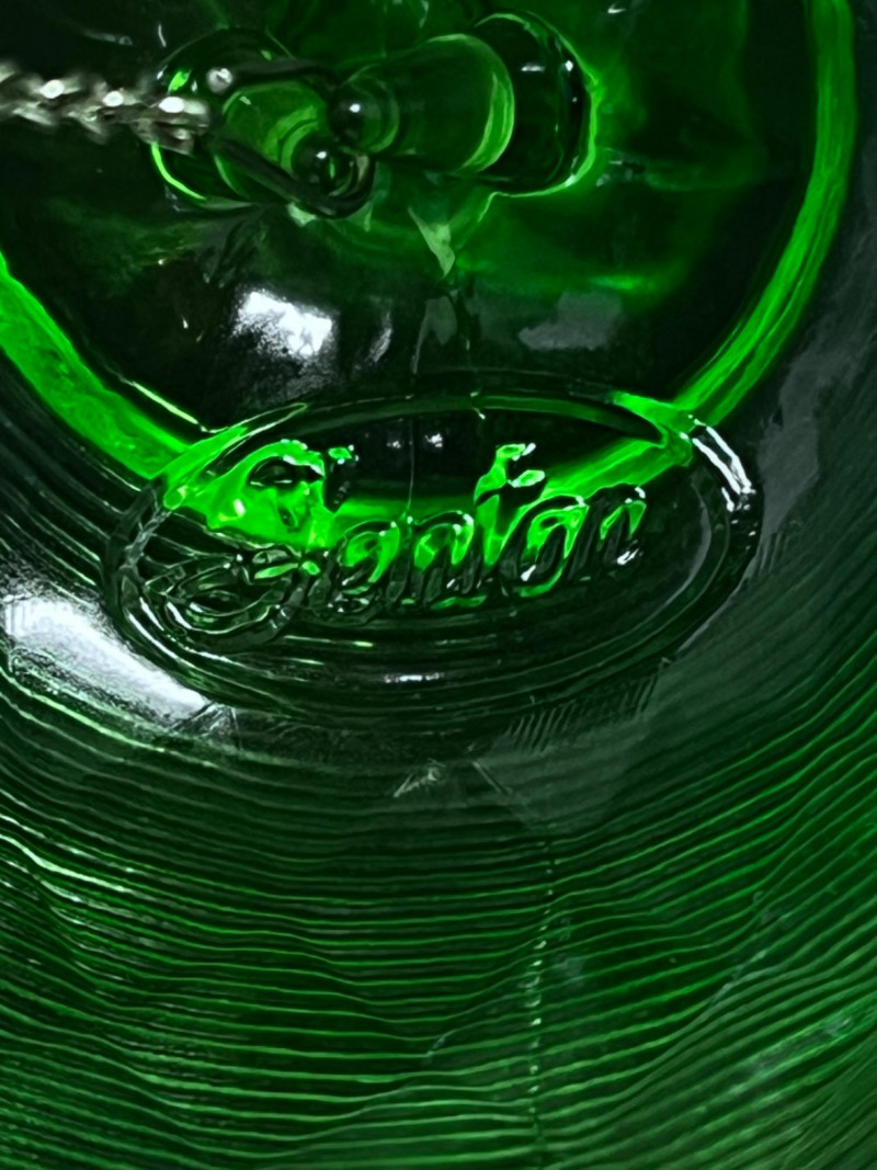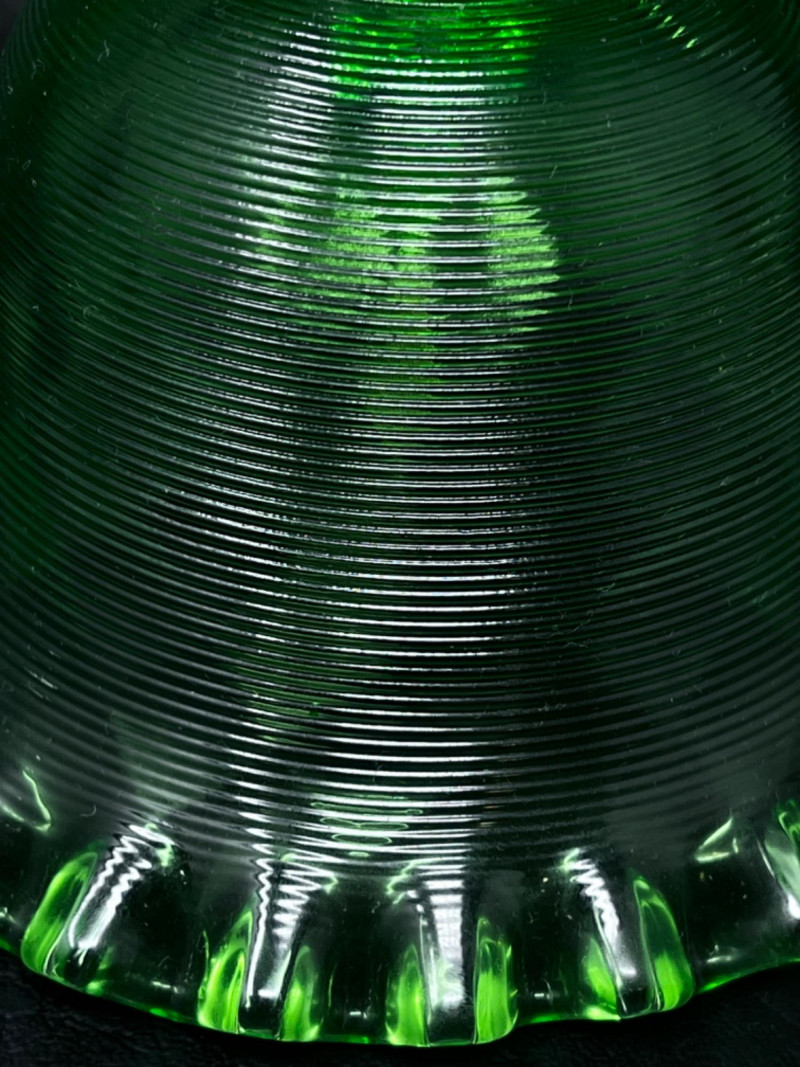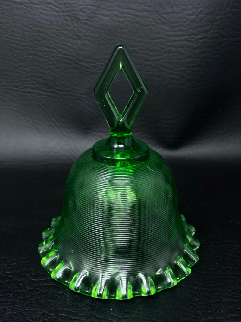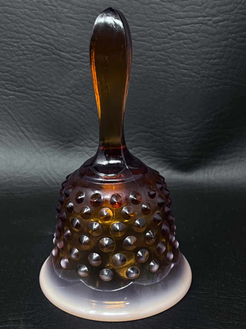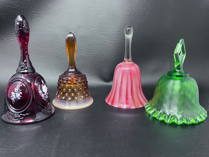 Vintage Bells Collection Signed by artist. 3.5”x7” Fenton amber glass hobnail bell with opalescent base. 3”x5.5” Fenton threaded diamond optic green bell with ruffled edge. 4”x5.5” Some chipping around edge. 3.5”x6”