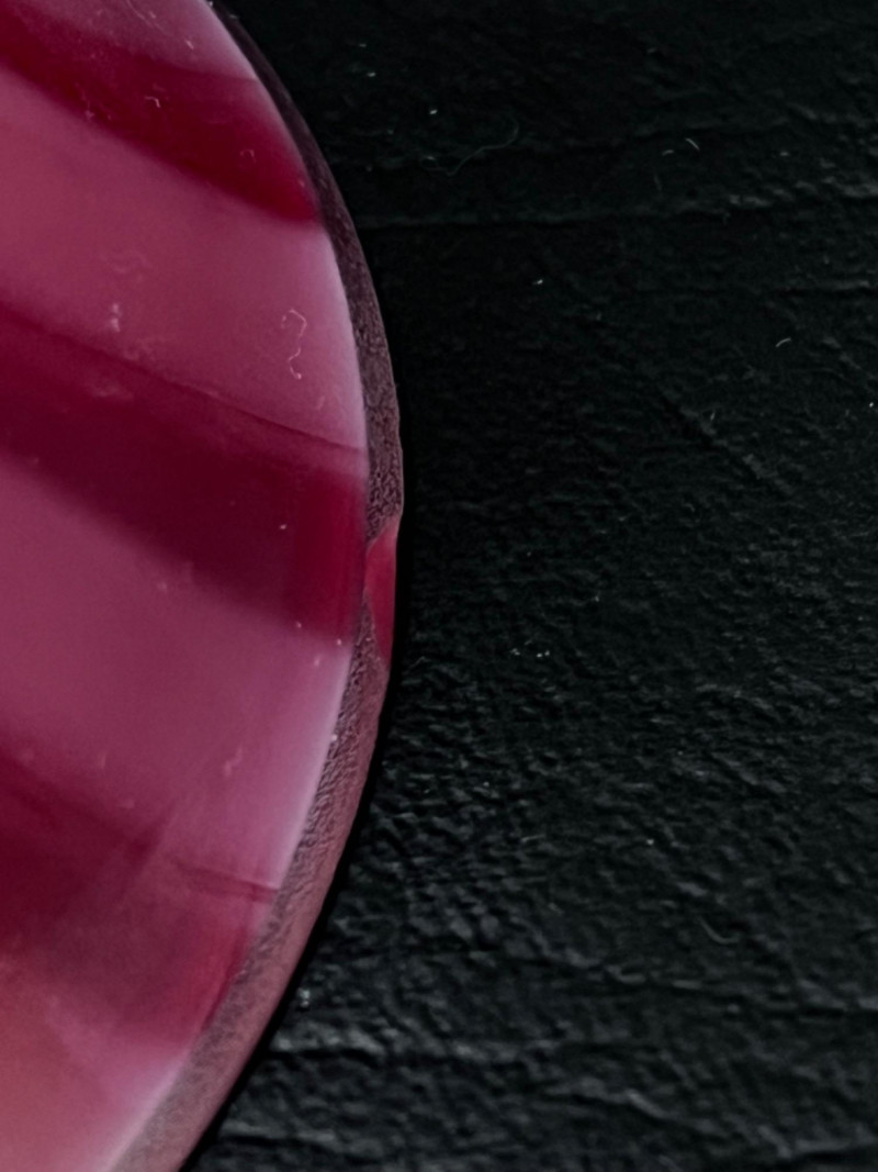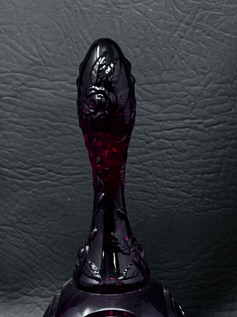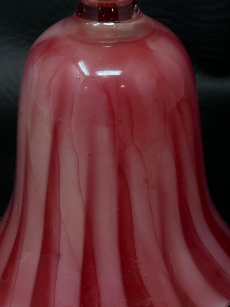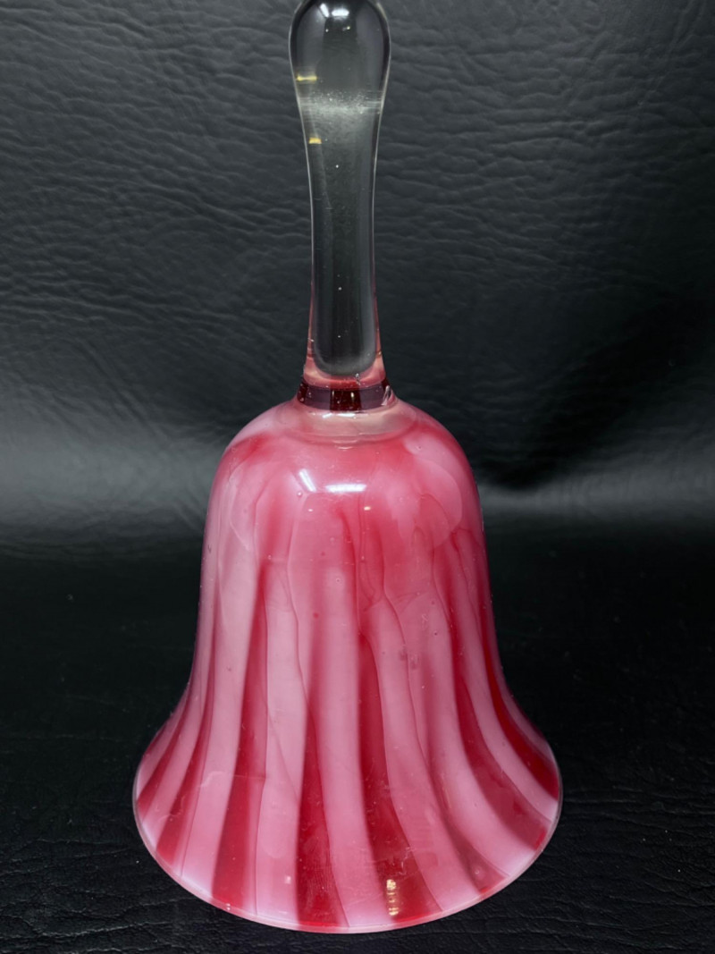Hand blown cranberry glass bell with clear handle.