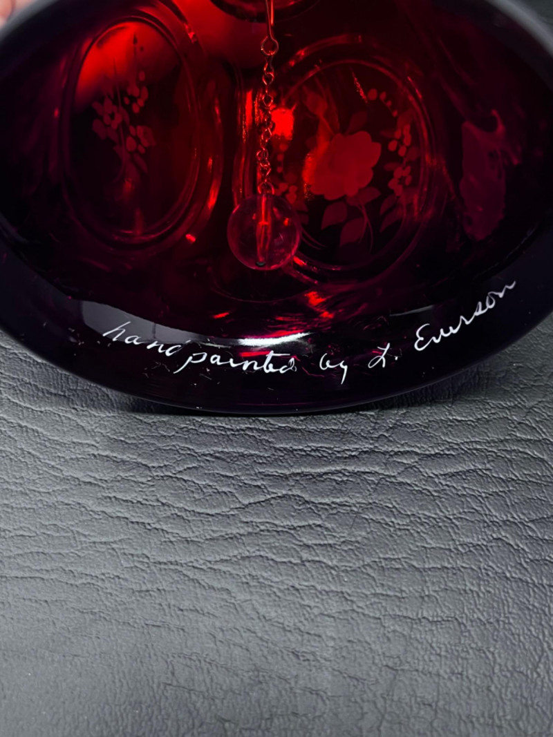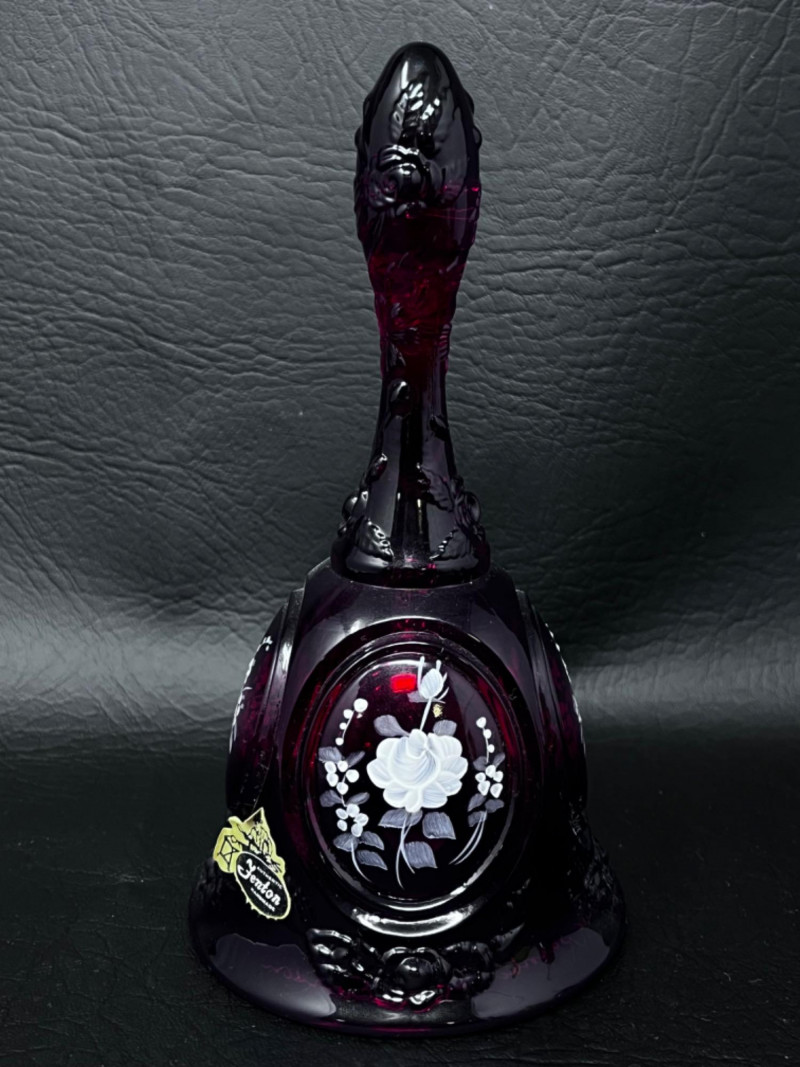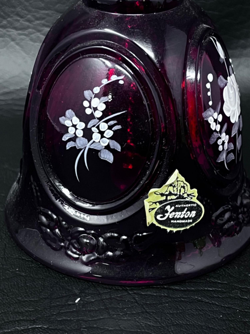 Fenton ruby red glass bell with hand painted floral designs and floral motifs on handle and edge of bell.