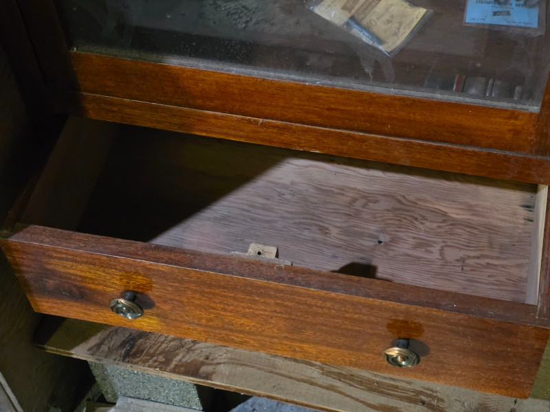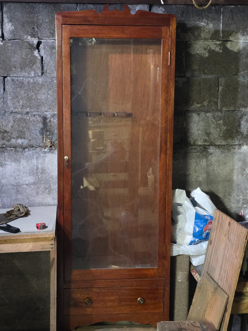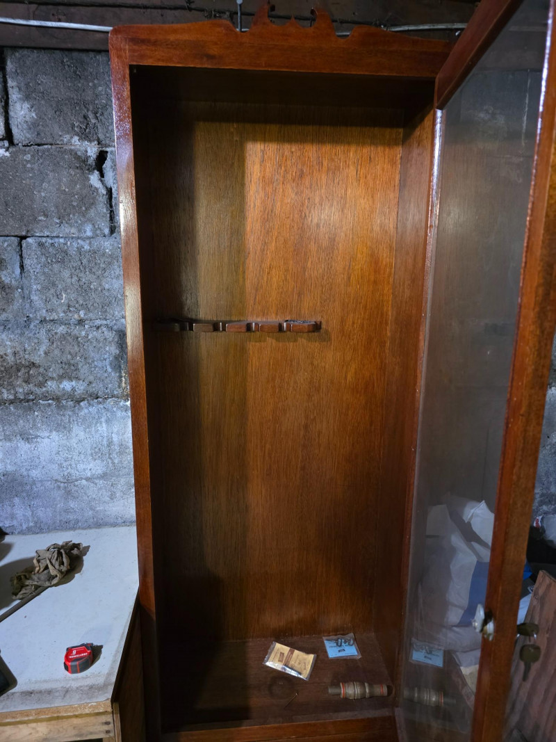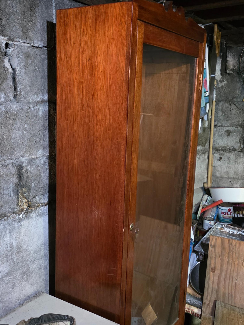 Vintage Wooden Locking Gun Display Cabinet It is designed for displaying firearms while keeping them locked away from unauthorized individuals. The cabinet features a large glass-fronted upper section and a solid wood drawer at the bottom, potentially for ammunition storage Beautiful & functional piece of furniture! Includes 2 keys 68"T x 24"W x 12"D