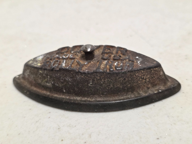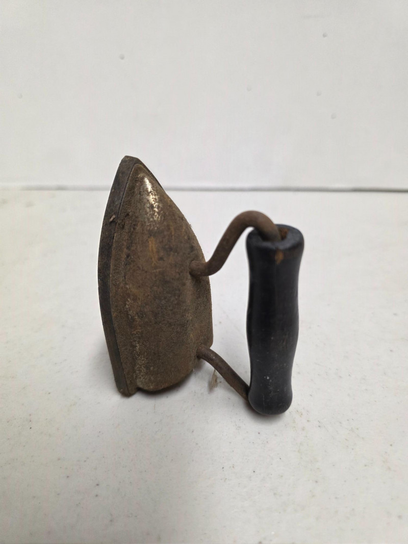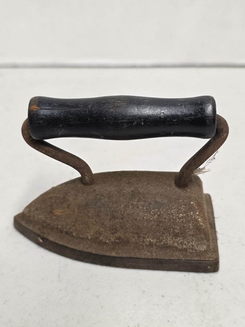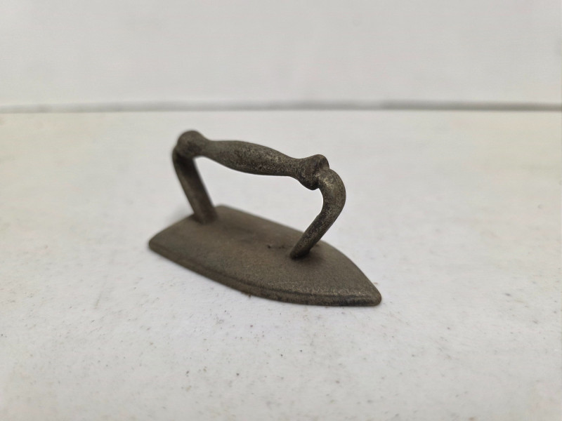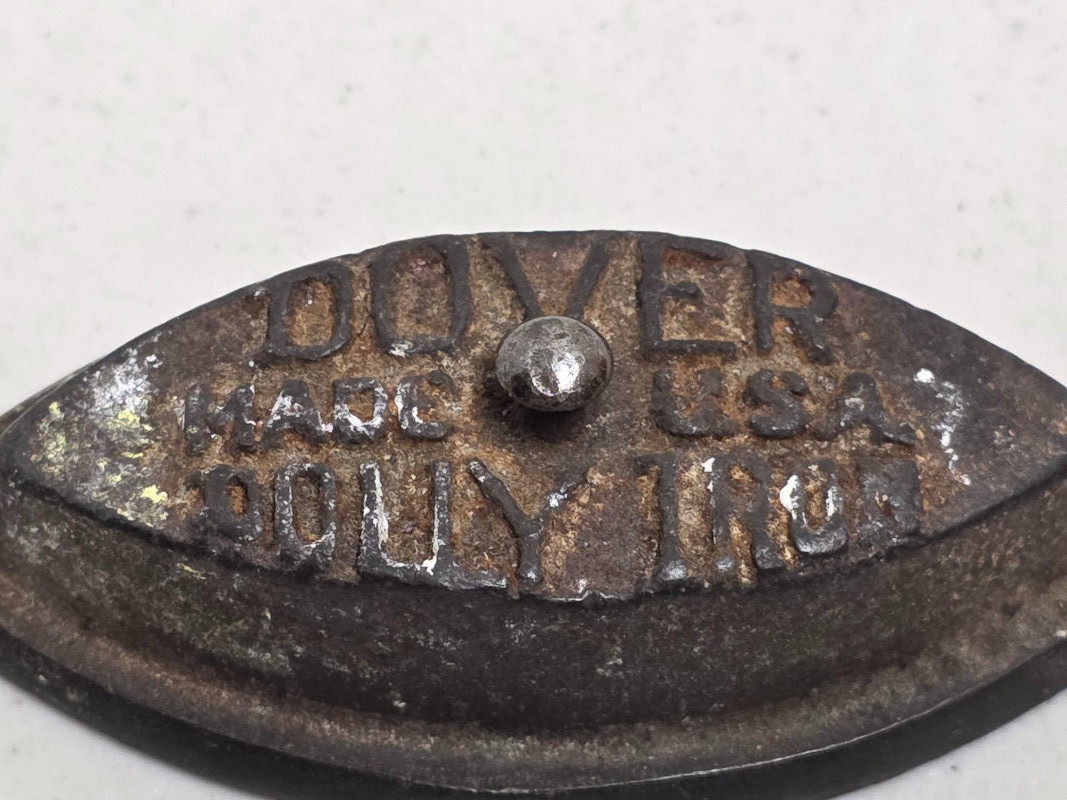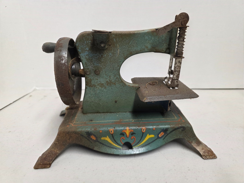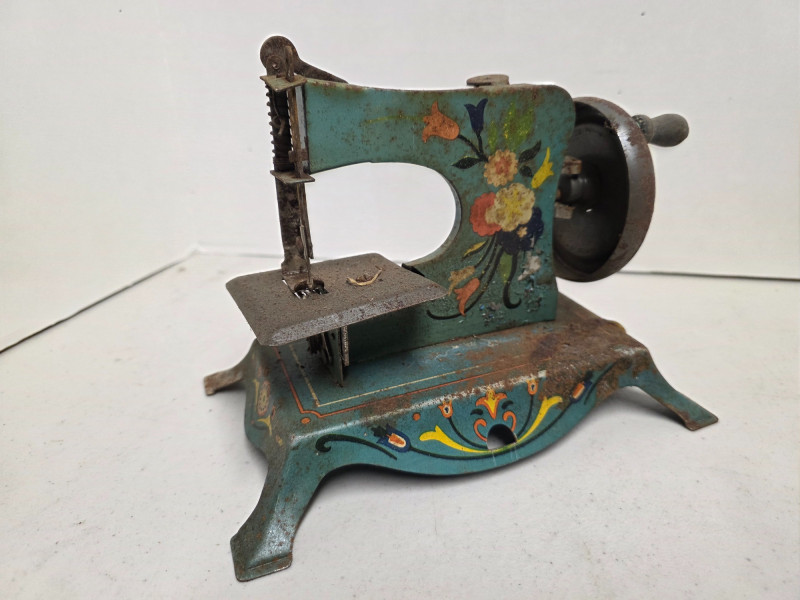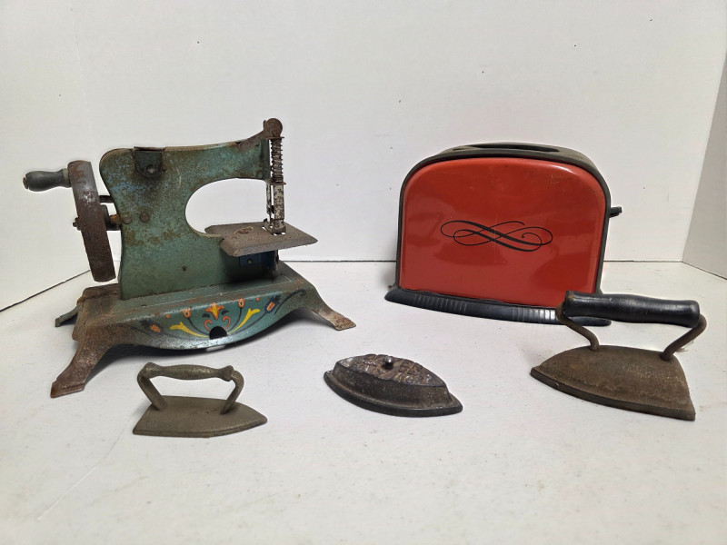 (5) Vintage Metal Toys (1) Lindstrom "Little Miss" toy sewing machine with a floral motif. It was produced by the Lindstrom Tool & Toy Co. of Bridgeport, CT, likely between 1931 and 1936 (1) Red tin toy toaster, likely from the 1950s or 1960s (1) Dover miniature cast iron toy sad iron, also known as a dolly iron or a salesman's sample (1) Miniature version of an antique cast iron sad iron (1) Miniature cast iron flat iron, also known as a "sad iron" 5 vintage toys in all!