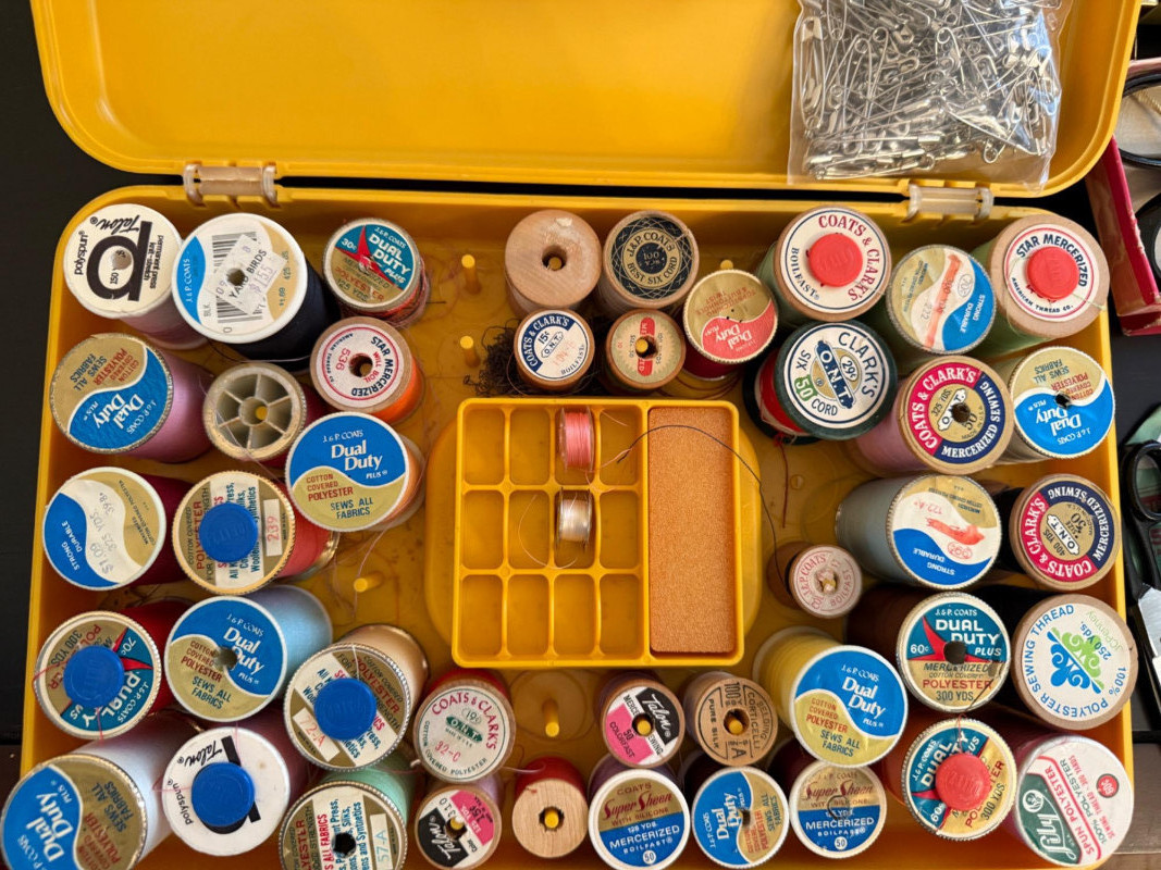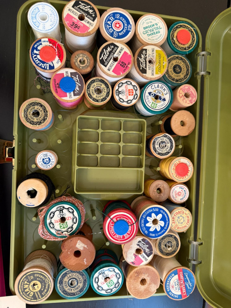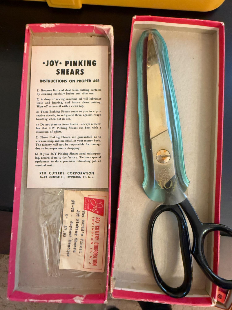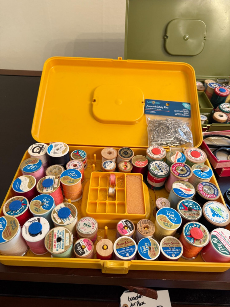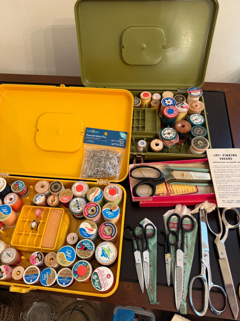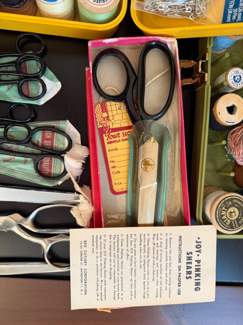 Full Vintage Thread Boxes - Shears and Scissors Vintage thread boxes with carry handle full of thread. Wood spools and newer. Joy Pinking Shears in original box. (7) Vintage scissors