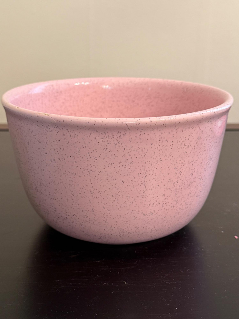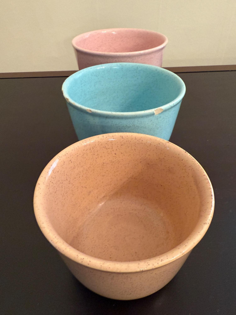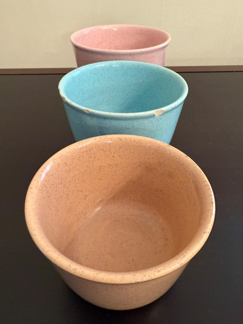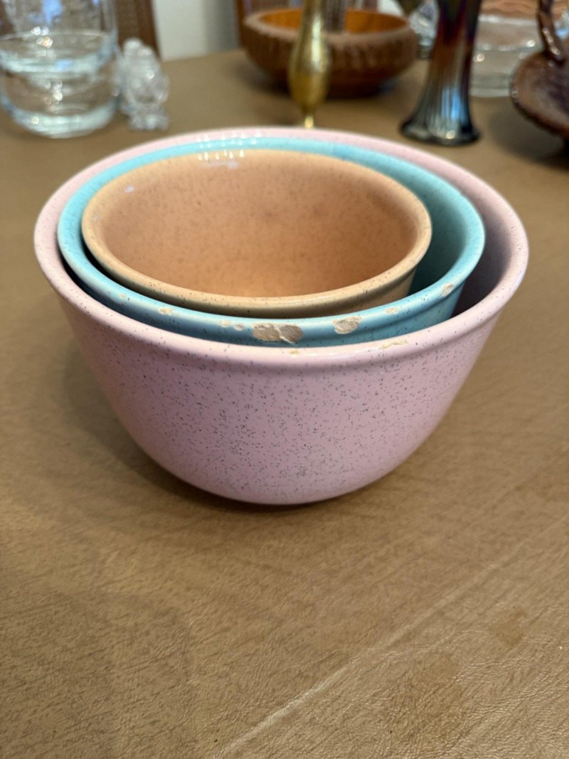 Bauer Pottery speckled nesting bowls from the Monterey Moderne line, produced in the 1940s. These pieces are known for their vibrant, mid-century pastel colors. The set features three bowls in popular vintage Bauer colors, specifically pink, light blue/turquoise, and a tan or peach color. The speckled design is characteristic of the "Speckled Ware" or "Monterey" line which was introduced following the success of their "California Colored Pottery" line.