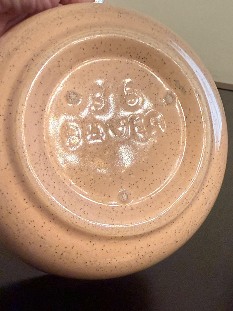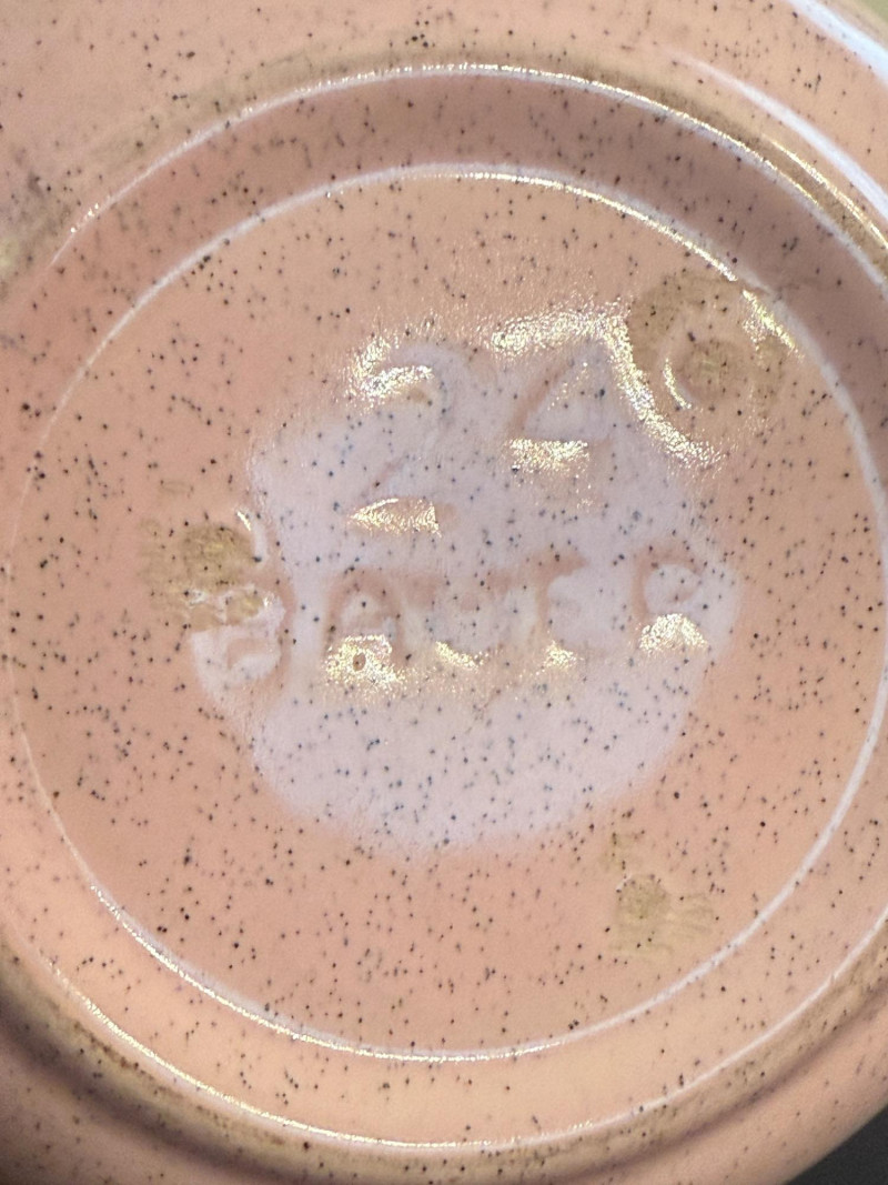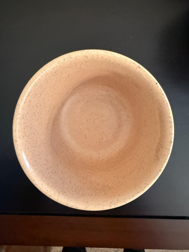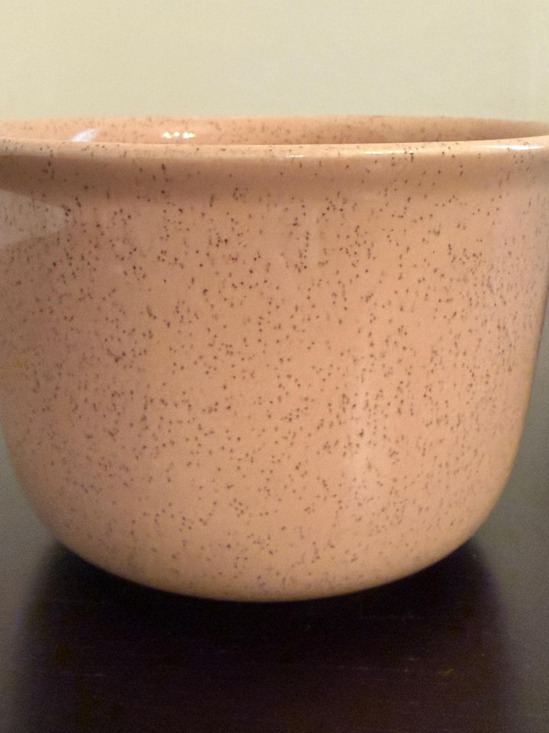 Bauer Pottery speckled nesting bowls from the Monterey Moderne line, produced in the 1940s. These pieces are known for their vibrant, mid-century pastel colors. The set features three bowls in popular vintage Bauer colors, specifically pink, light blue/turquoise, and a tan or peach color. The speckled design is characteristic of the "Speckled Ware" or "Monterey" line which was introduced following the success of their "California Colored Pottery" line.