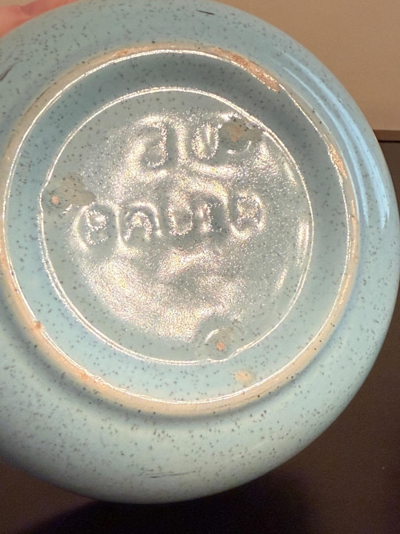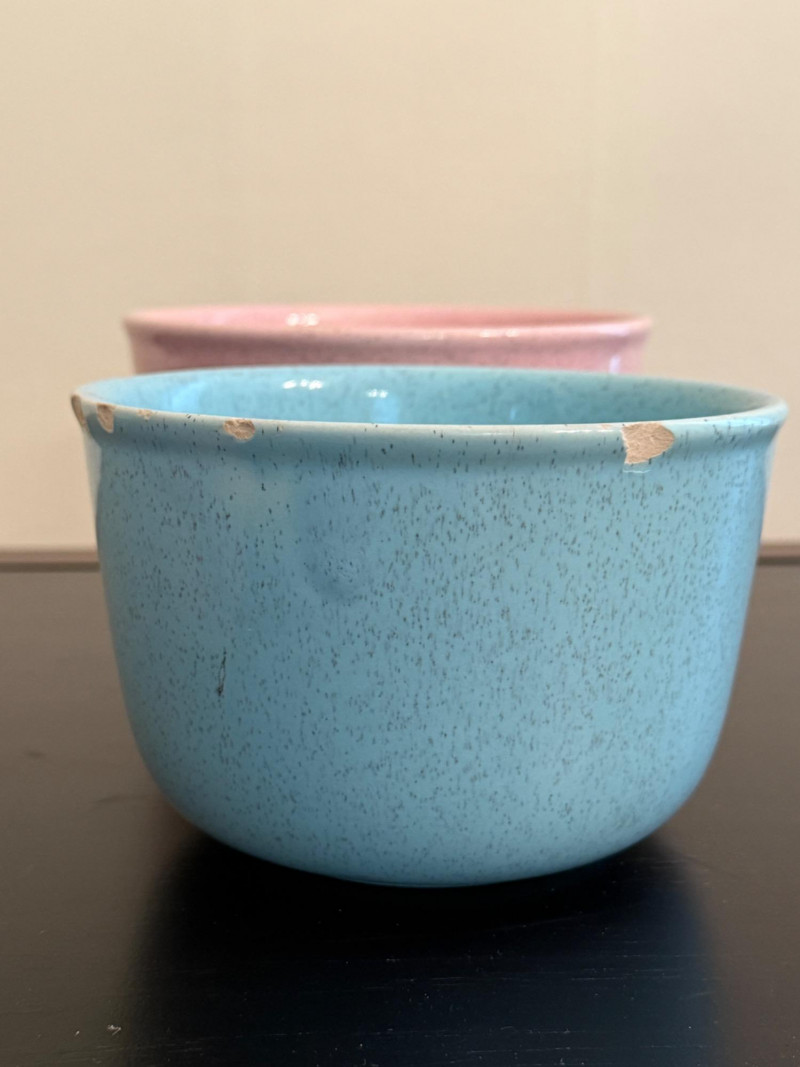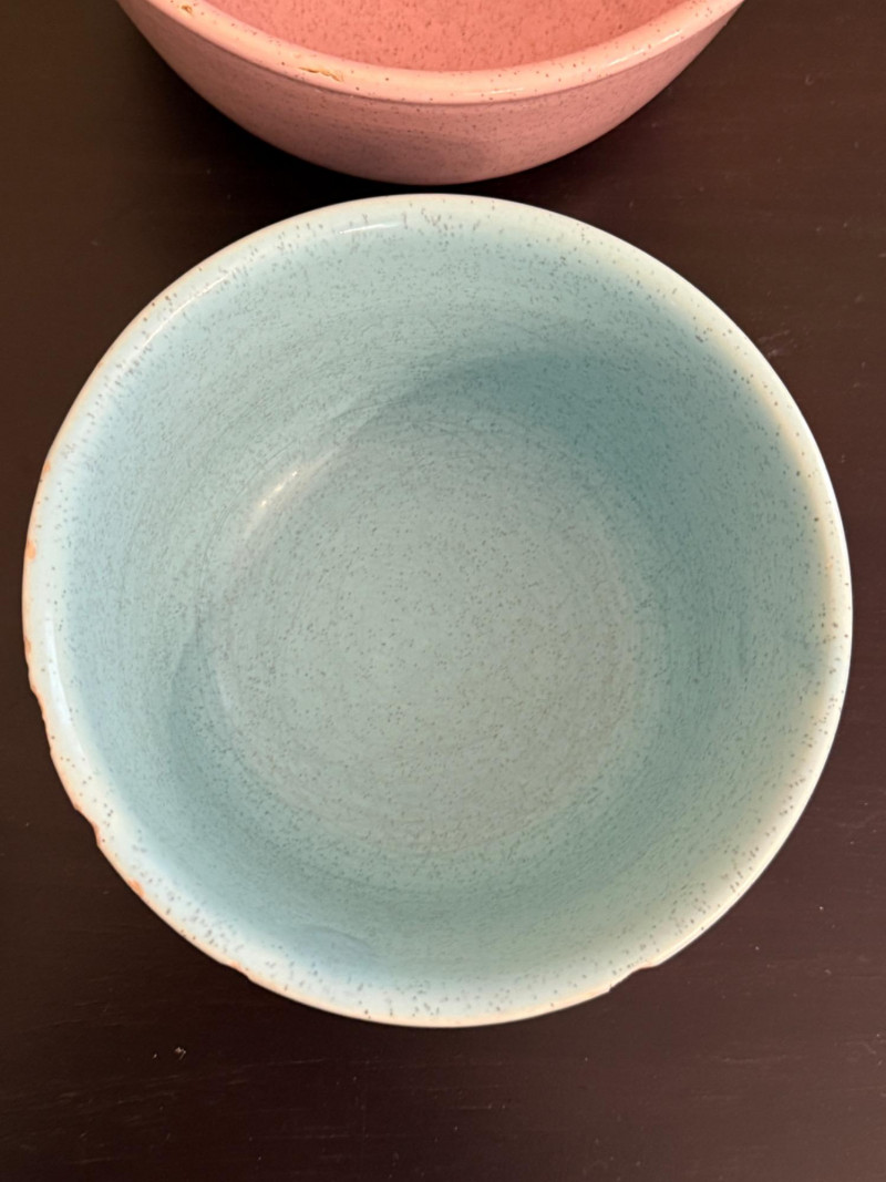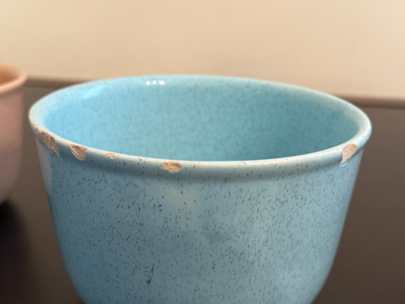 The blue bowl has chips around the edge.