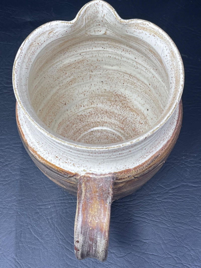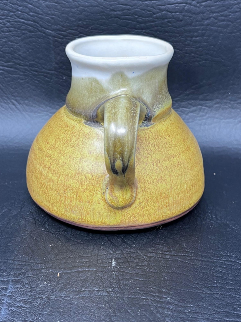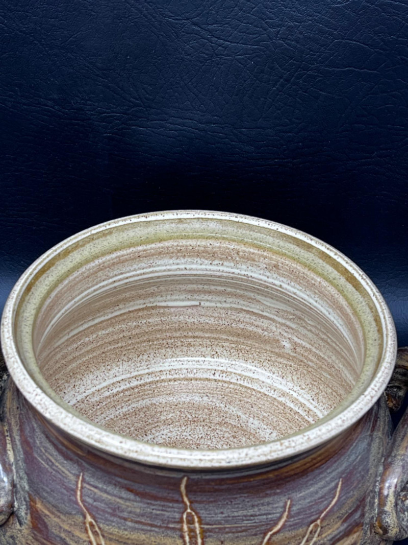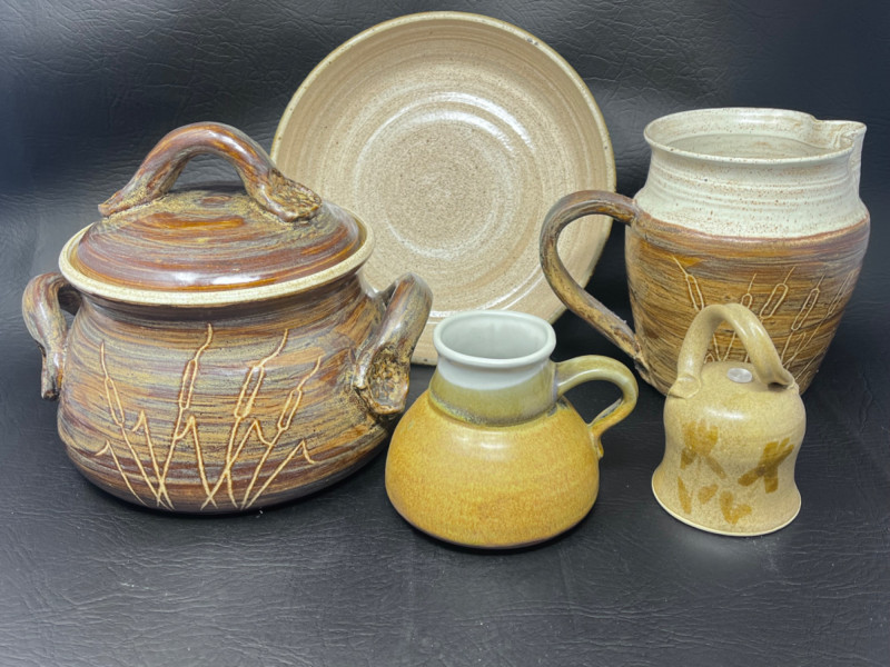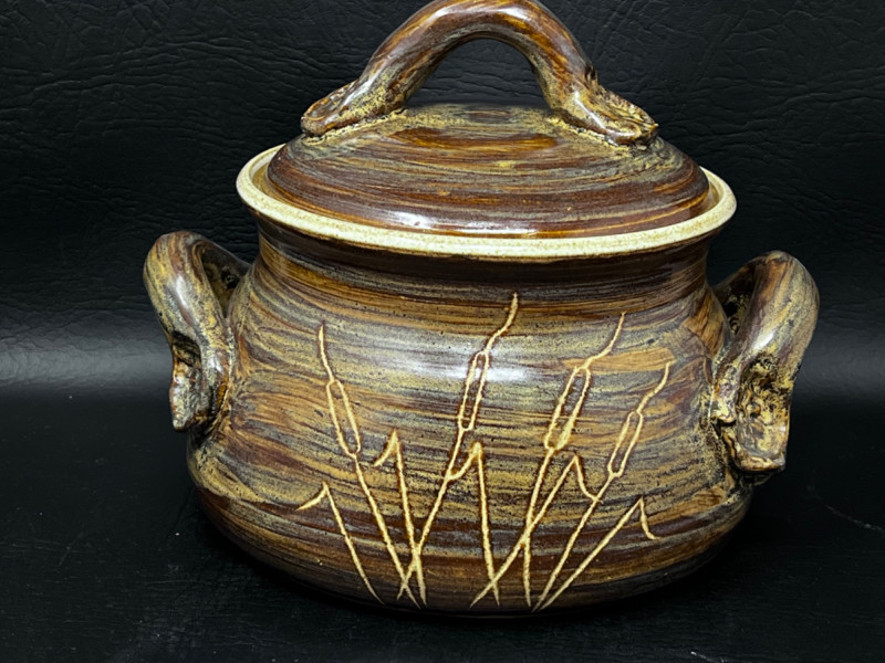 Pottery Dishes Handmade pitcher with lava boy design and a mustard glaze. Handmade pottery pot with lid and cat tail motif. 9.5”x8”x7.5” handmade pottery pitcher with cat tail motif. Handmade pottery bowl. 9.5”