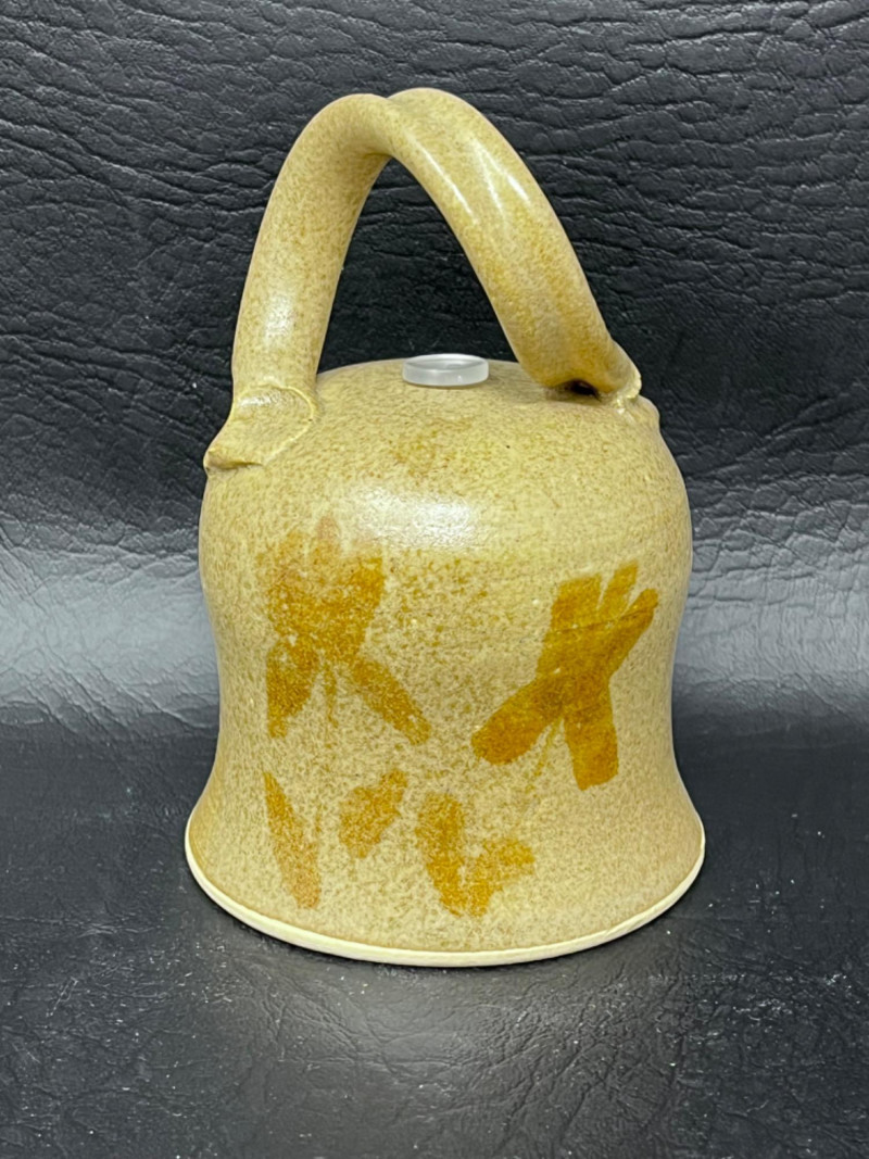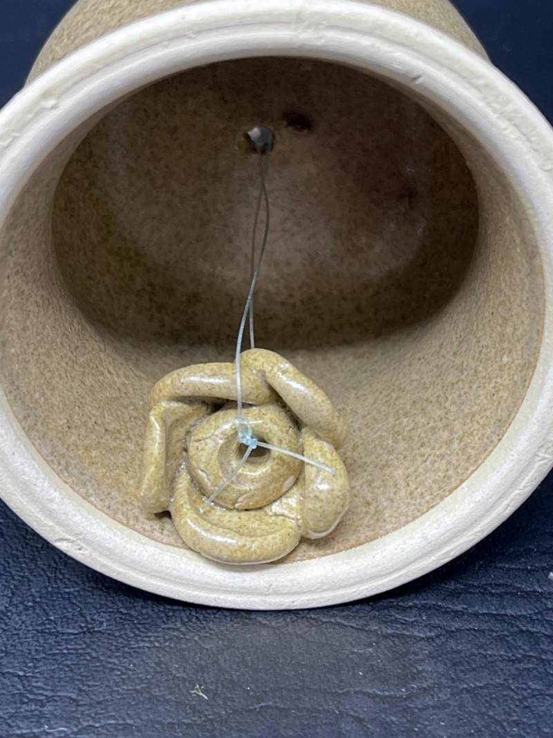Handmade pottery bell with floral design on front and a twisted handle.