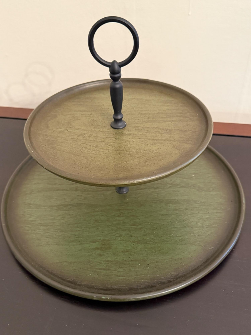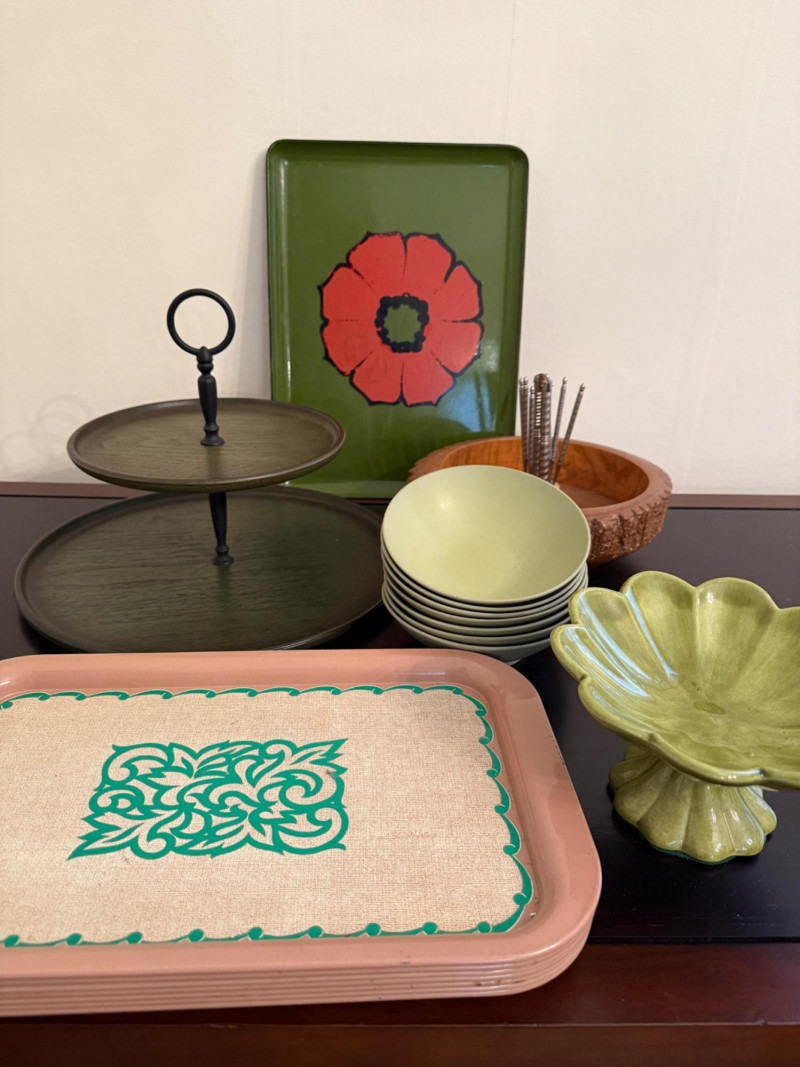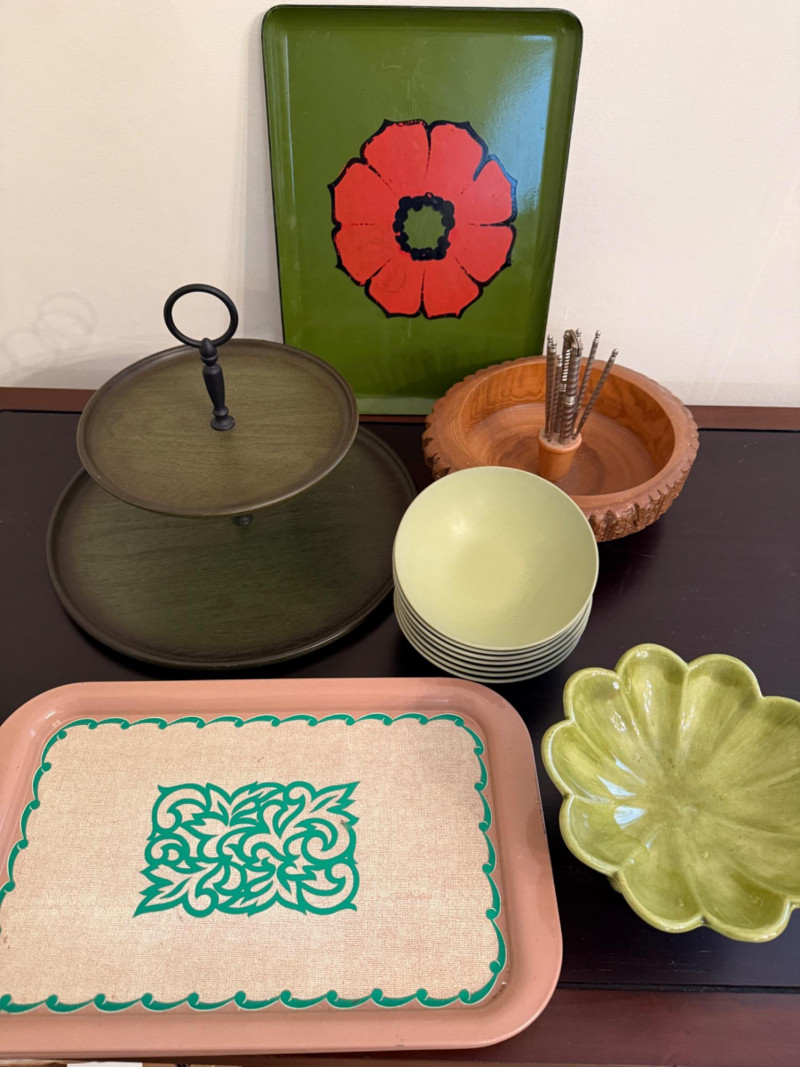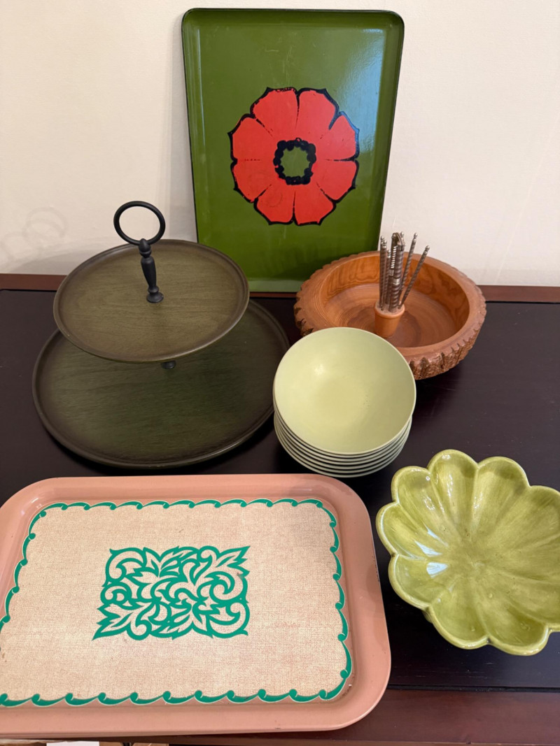 Host Your 70’s Party In Style! Vintage Entertaining Necessities 13”x10” 2 tier wood grain green tint plastic server (7) Metal trays 14.24”x8.75” (7) Avocado green melamine bowls 6”x1.75” Ceramic green footed dish 7”x4” Hand carved wood nut bowl with cracking and picking utensils.
