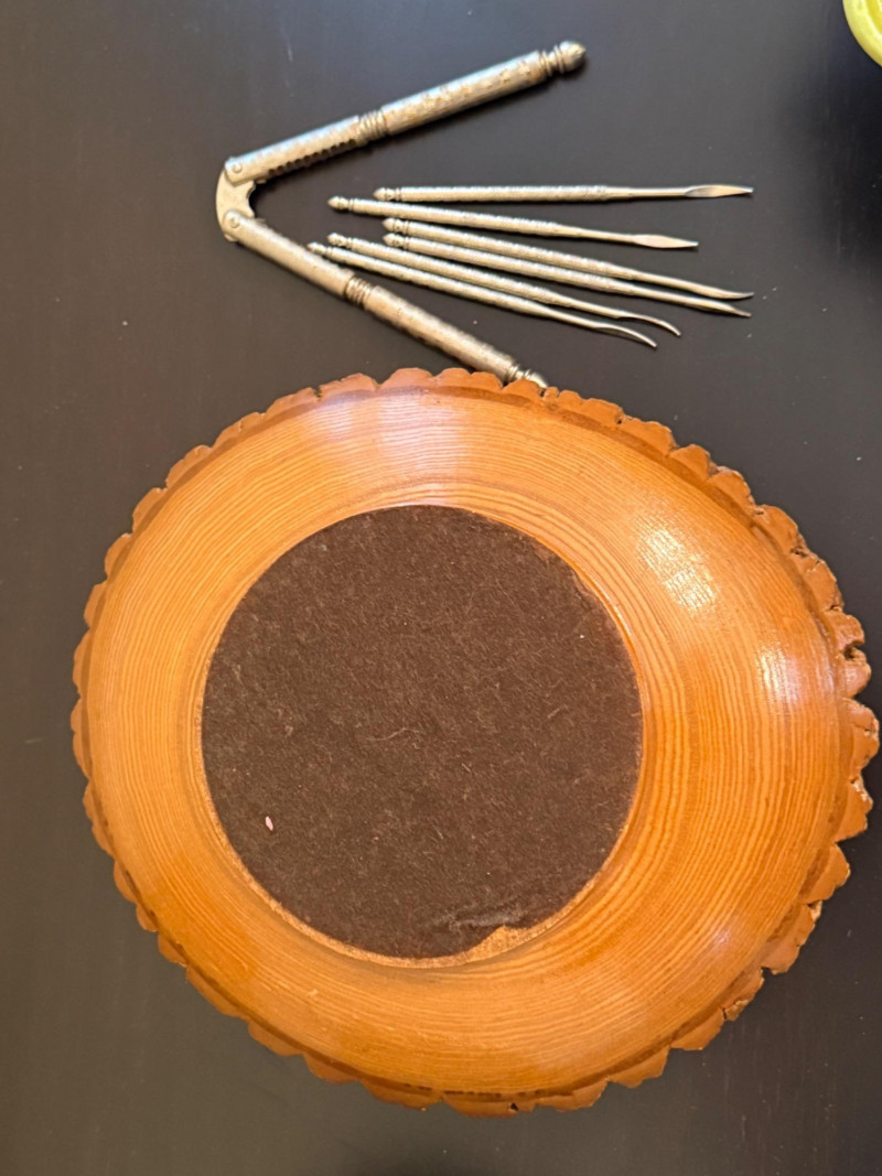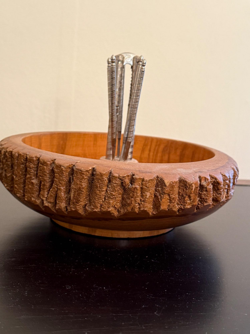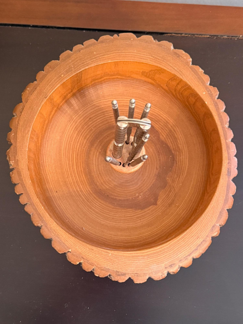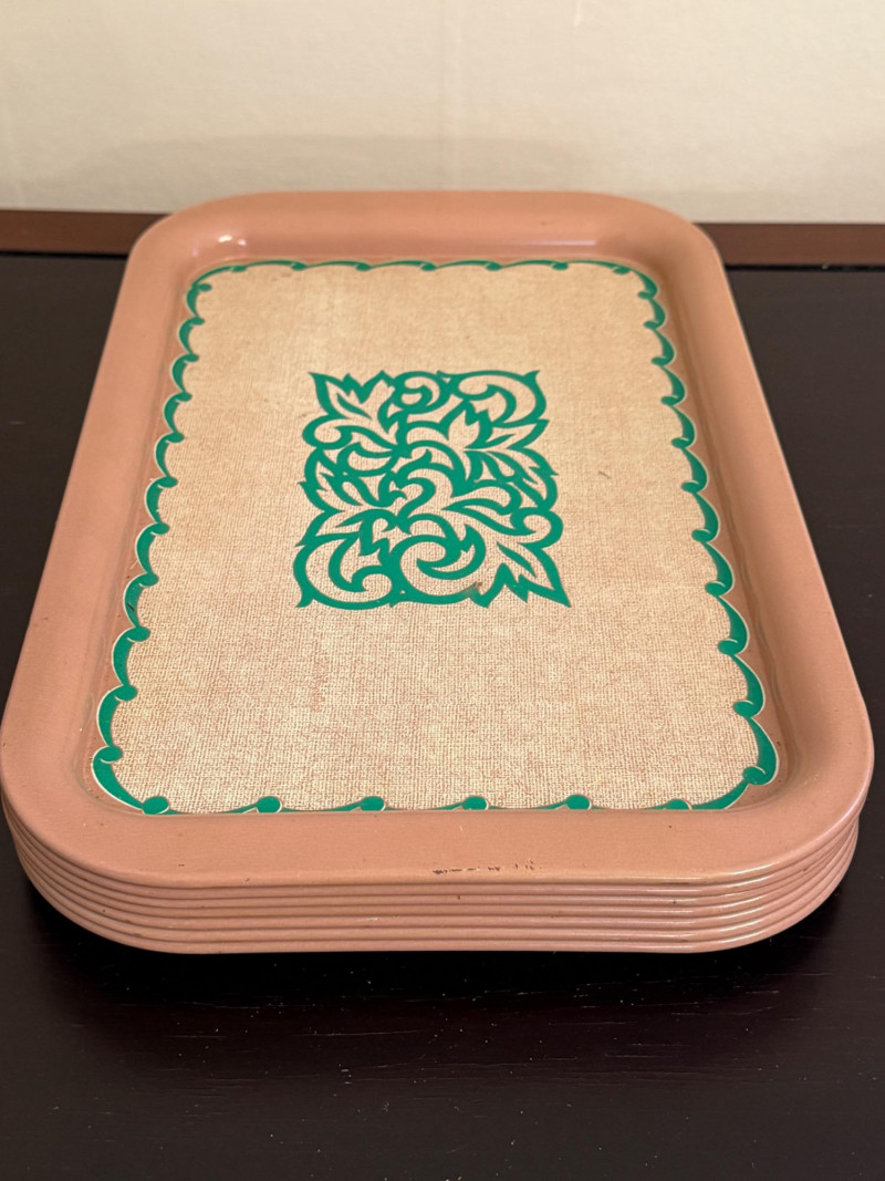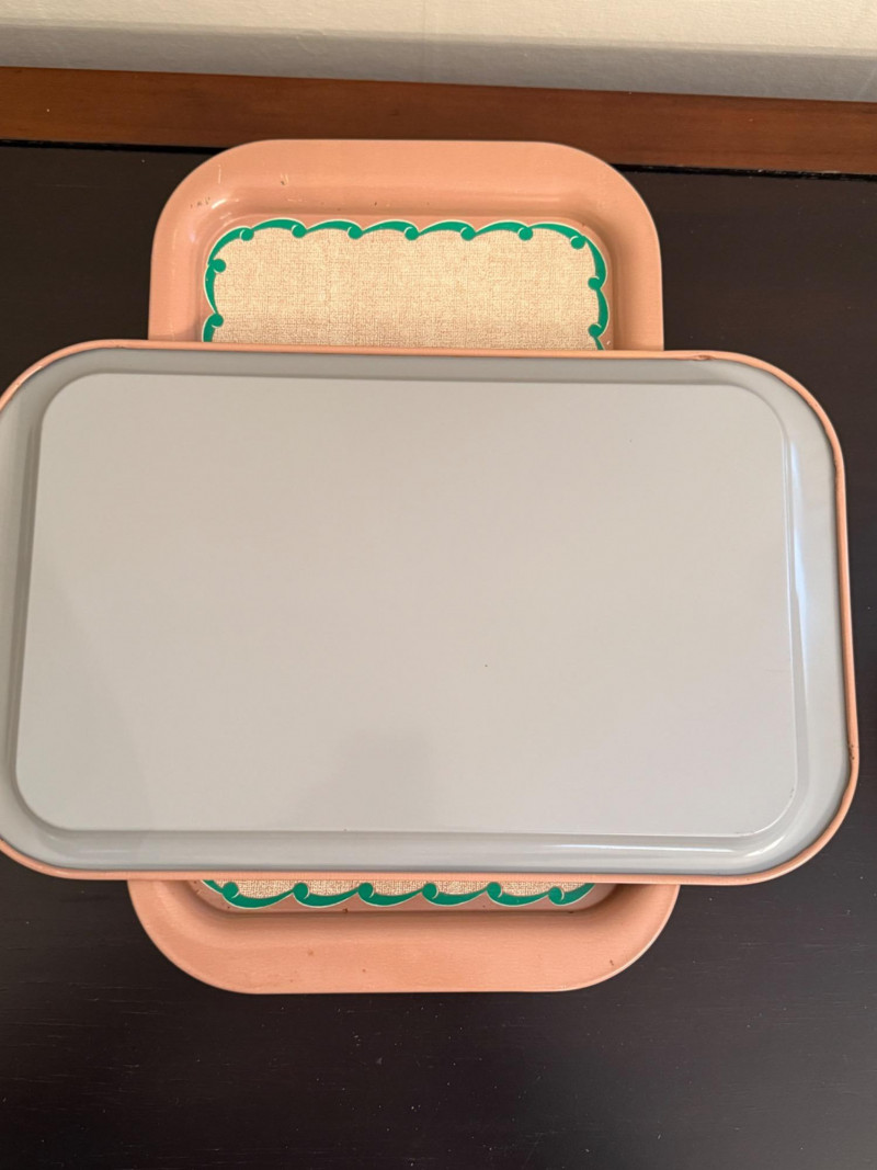 Host Your 70’s Party In Style! Vintage Entertaining Necessities 13”x10” 2 tier wood grain green tint plastic server (7) Metal trays 14.24”x8.75” (7) Avocado green melamine bowls 6”x1.75” Ceramic green footed dish 7”x4” Hand carved wood nut bowl with cracking and picking utensils.