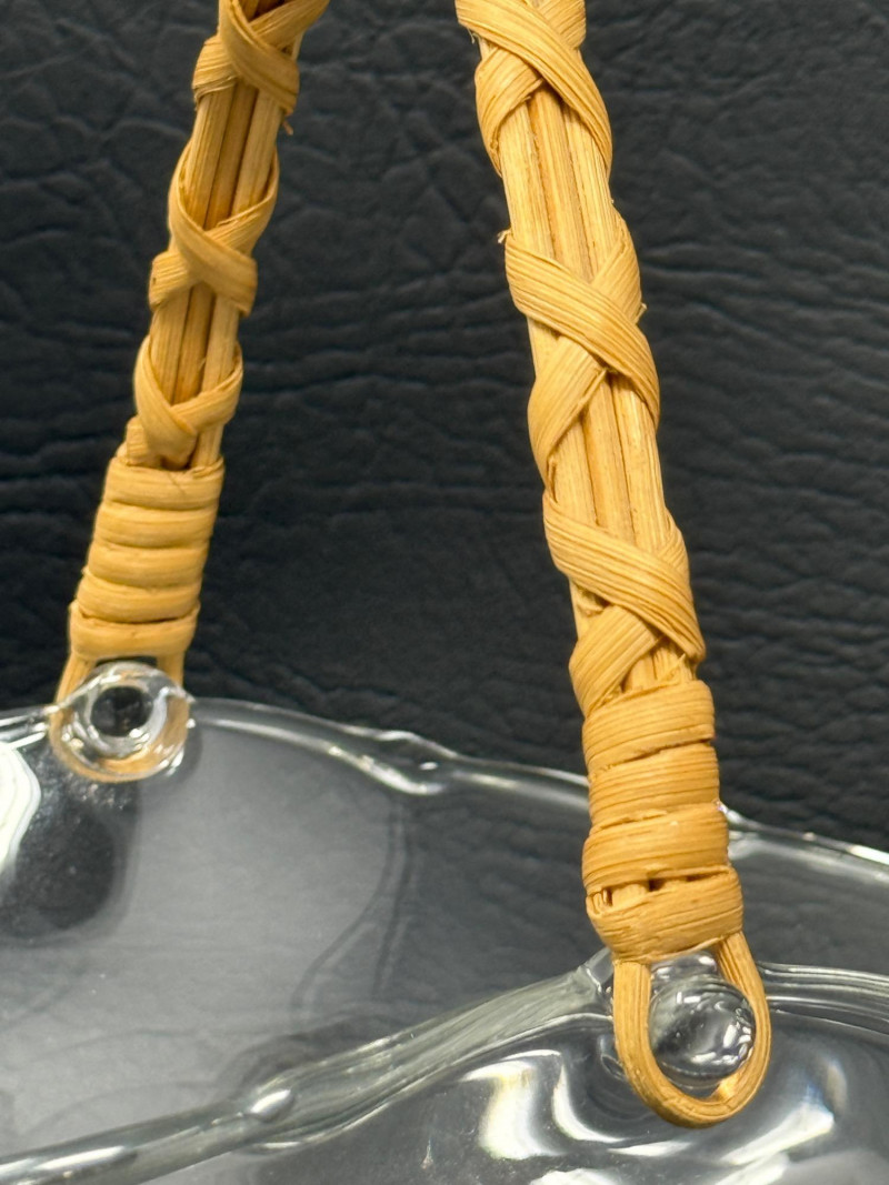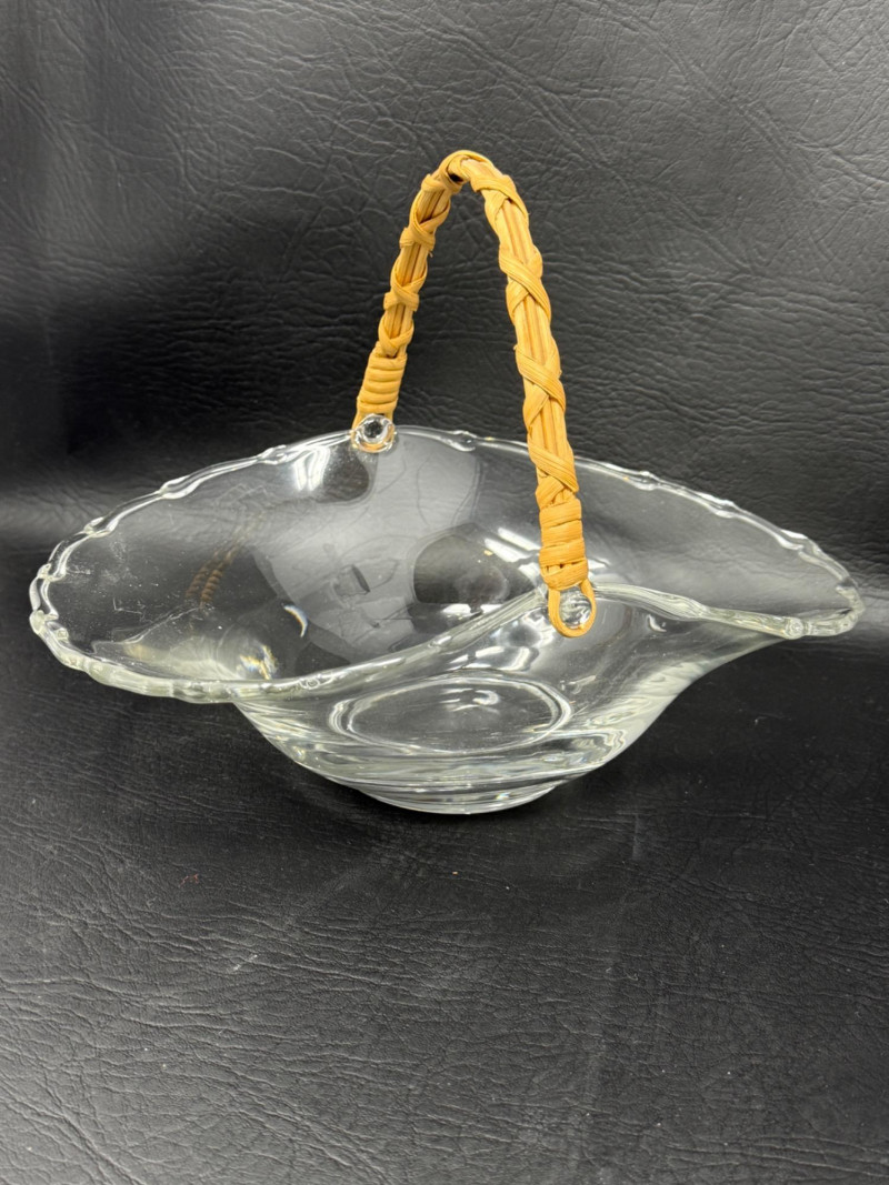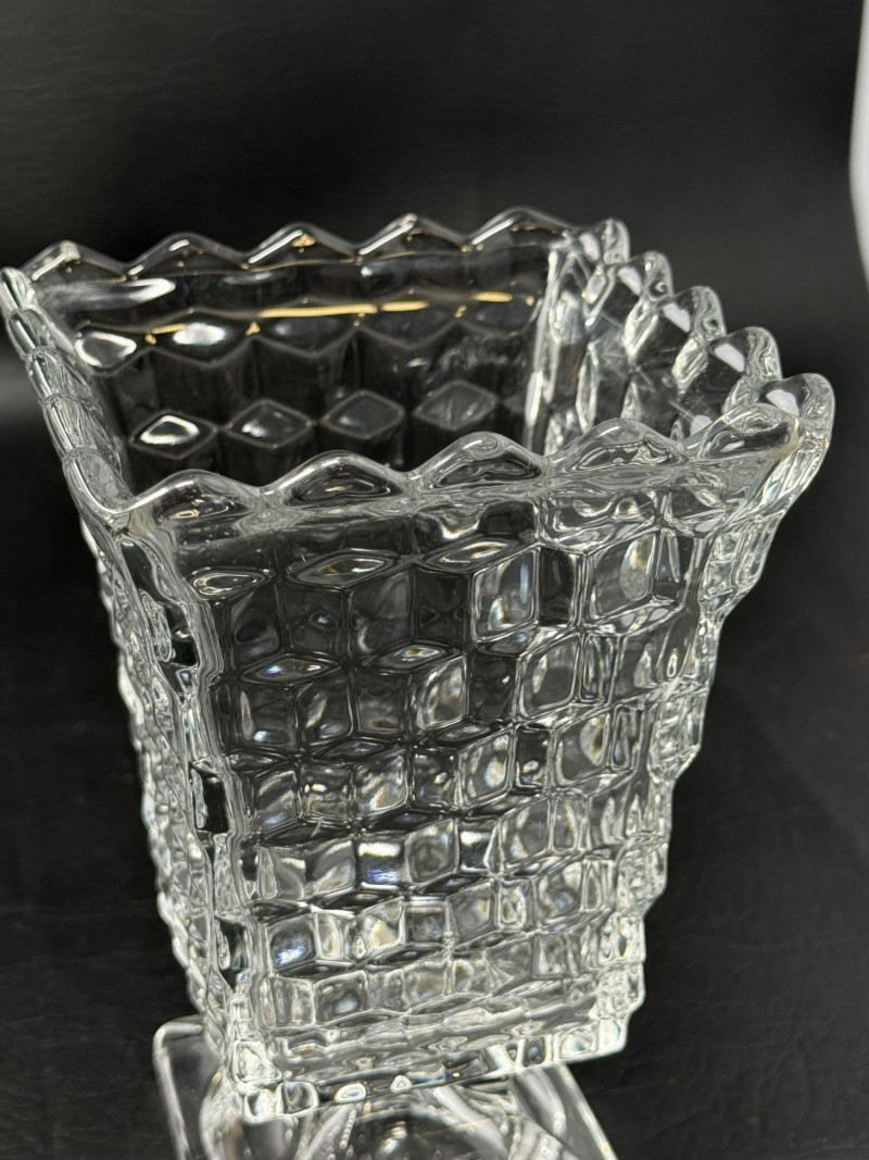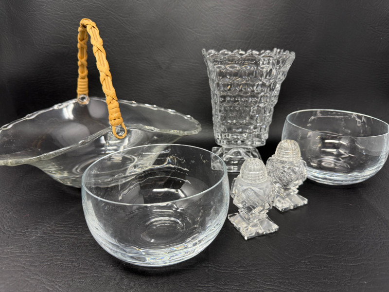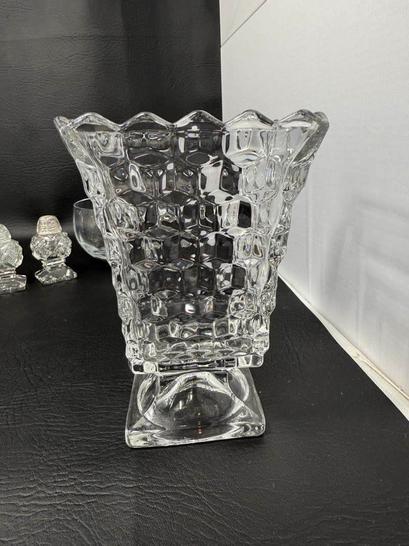 Fostoria American clear glass square footed vase, also known as a high urn with geometric pattern and footed pedestal. 9” Glass basket with woven handle 11”x8” 2 Wavy glass bowls 5”x3” Matching Salt and Pepper shakers