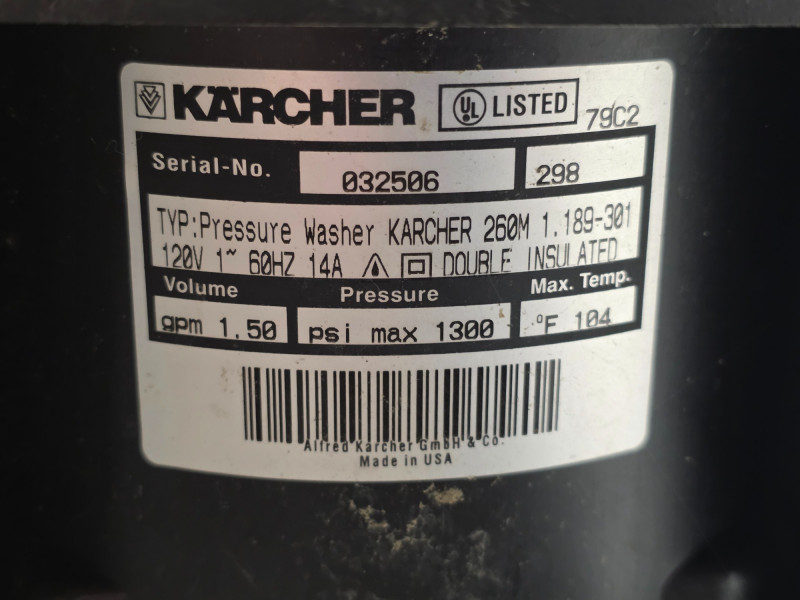 Kärcher 260M Electric Pressure Washer Electric pressure washer designed for routine outdoor cleaning tasks. 1300 PSI 1.5gpm 14 amp The unit includes a high-pressure hose & trigger gun with safety lock Tested - Pump Powered On!