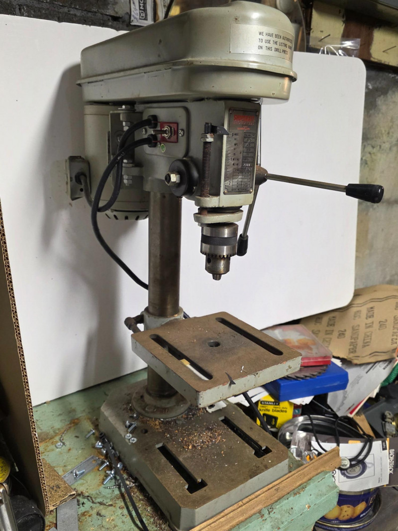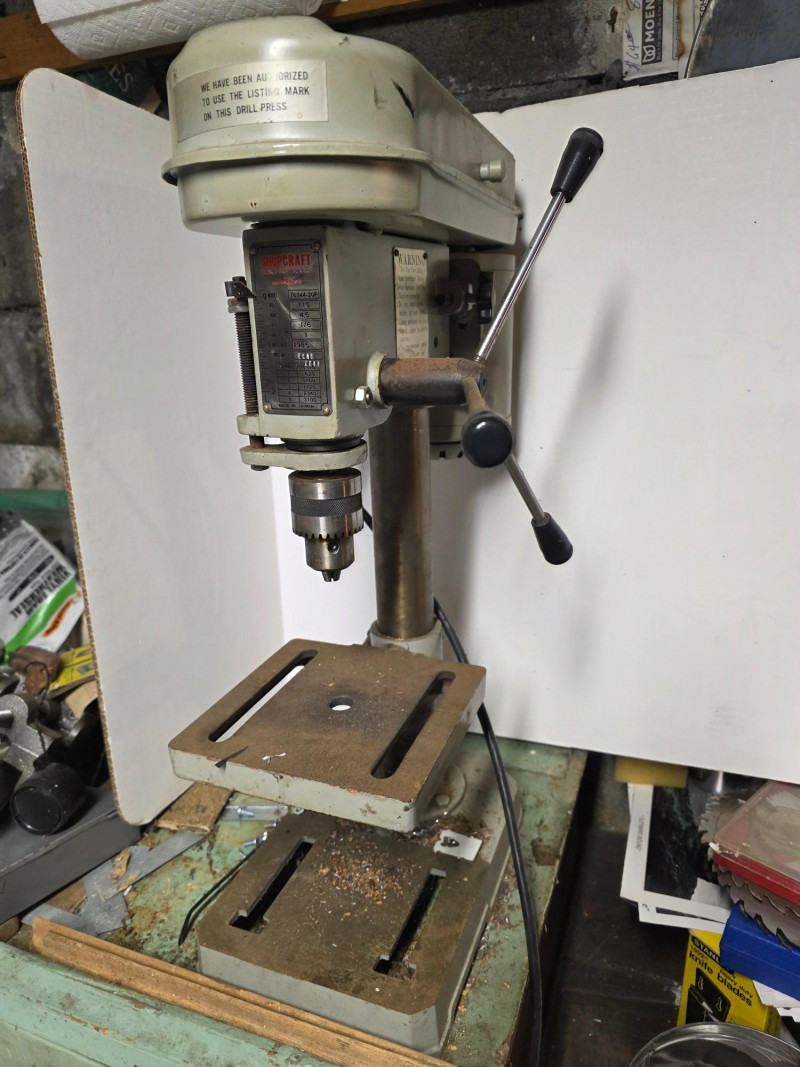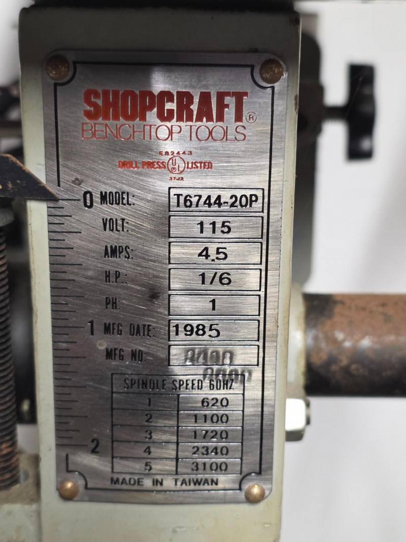 Shopcraft Benchtop Drill Press Shopcraft Model #T6744-20P Manufactured 1985 Voltage: 115 volts. Amperage: 4.5 amp. Horsepower: 1/6 hp. Speeds: It is a 5-speed drill press. Chuck: It uses a 1/2-inch chuck. Includes owners manual 23"T x 6.5"W x 16" Tested - Works!