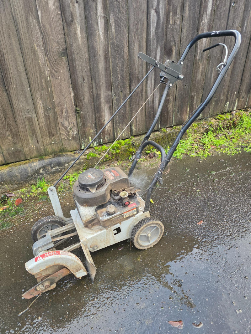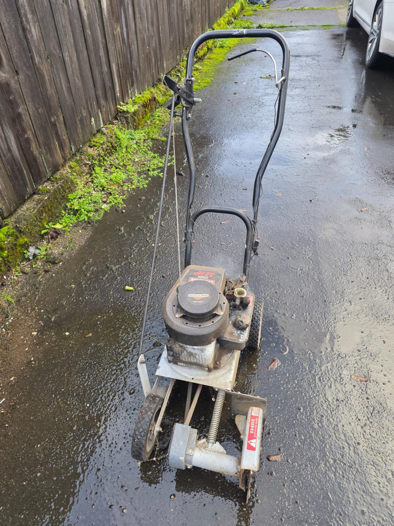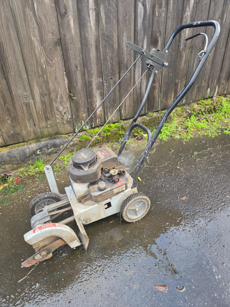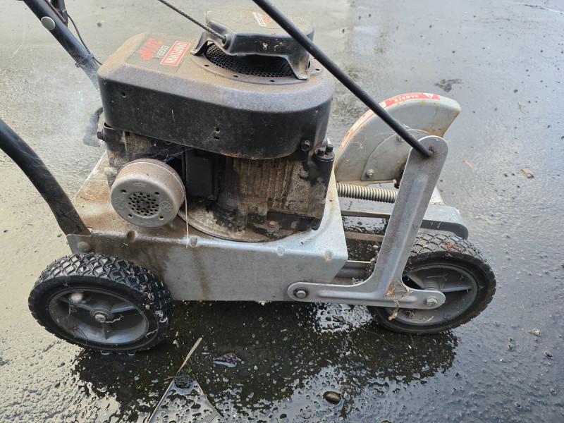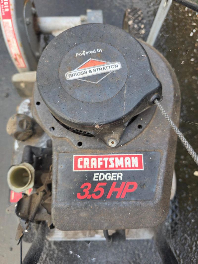 Craftsman 3.5HP Gas-Powered Lawn Edger Craftsman Model #536.772321 Manufactured January 2003 Type of Equipment: Lawn Edger Engine Power: 3.5 HP Briggs & Stratton Displacement: 9.02 cubic inches (147.8 cc) Oil Capacity: 20 oz. of SAE-30W oil Manufacturer: Produced by Western Tool & Stamping for Sears under the Craftsman brand Features: Includes an engine stop lever, primer button, and depth control lever Untested - Engine pulls free, appears to be missing a part (see pics)