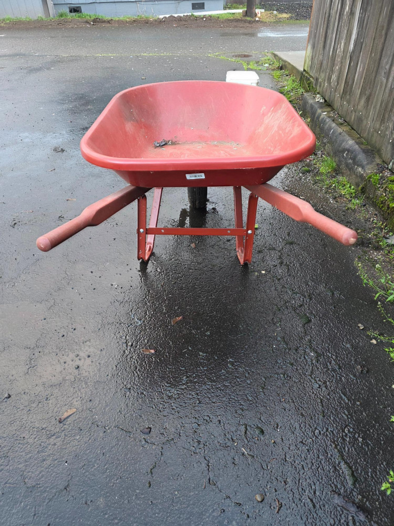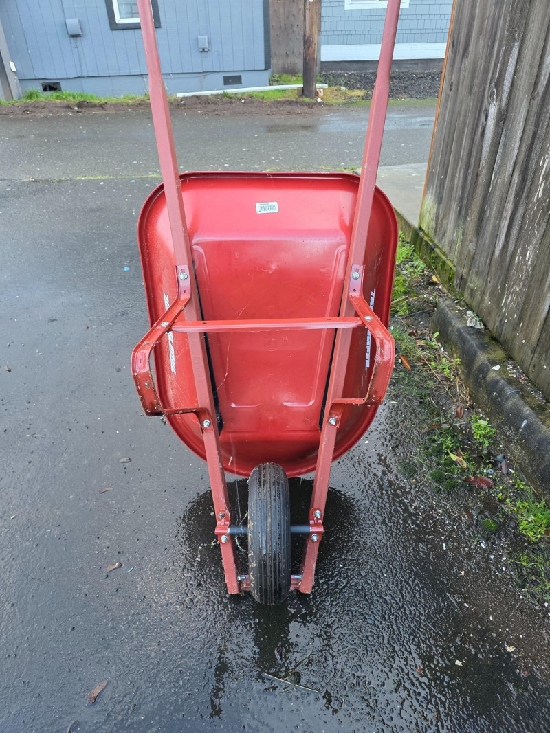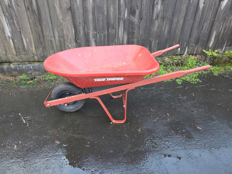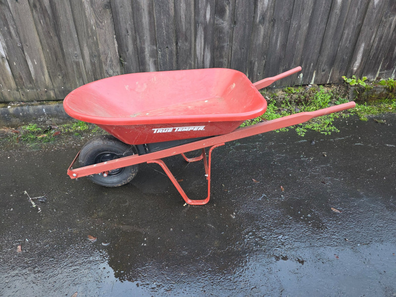 True Temper 4 cuft Poly Wheelbarrow It has a 4 cubic foot capacity, suitable for mulch, gravel, or general cleanup. The lightweight poly tray is rust-proof and designed for outdoor durability. It features a steel undercarriage and seal-coated hardwood handles Tire is flat!