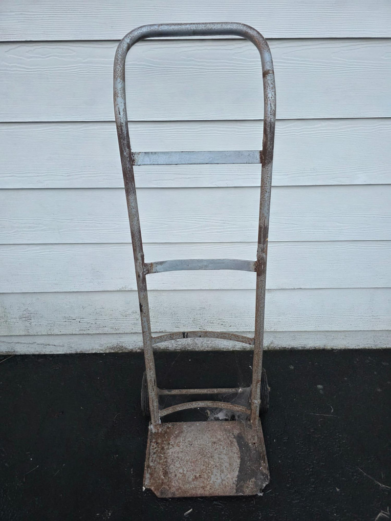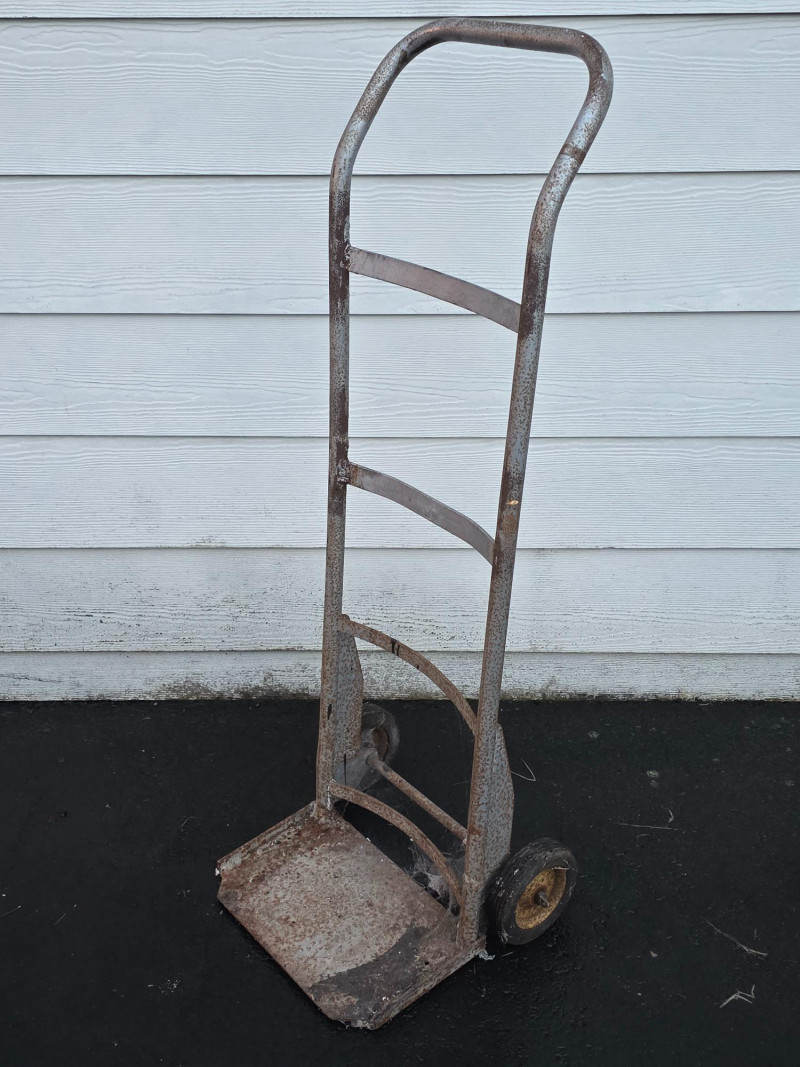 Vintage Metal Barrel Or Keg Dolly/Hand Truck This type of hand truck was commonly used in warehouses, shipping docks, and factories during the early to mid-1900s for moving heavy or bulky items like barrels and kegs. The design features two large wheels and an L-shaped frame to slide underneath items easily. The specific design with the curved back frame is characteristic of those used for moving barrels 45"T x 16.5"W x 15"D