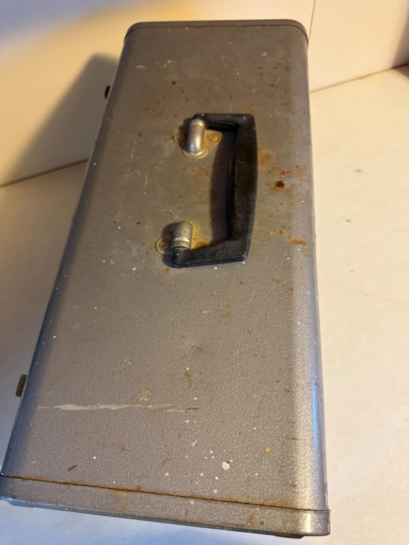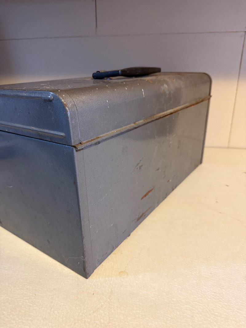 Box is 18”x8”x9” with handle and 2 latches and one lockable latch. Good condition for an old tool box.