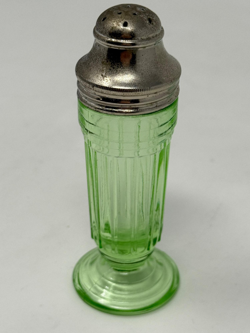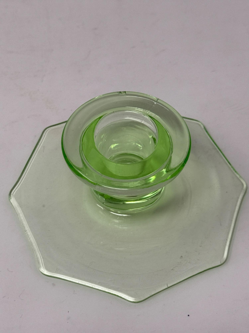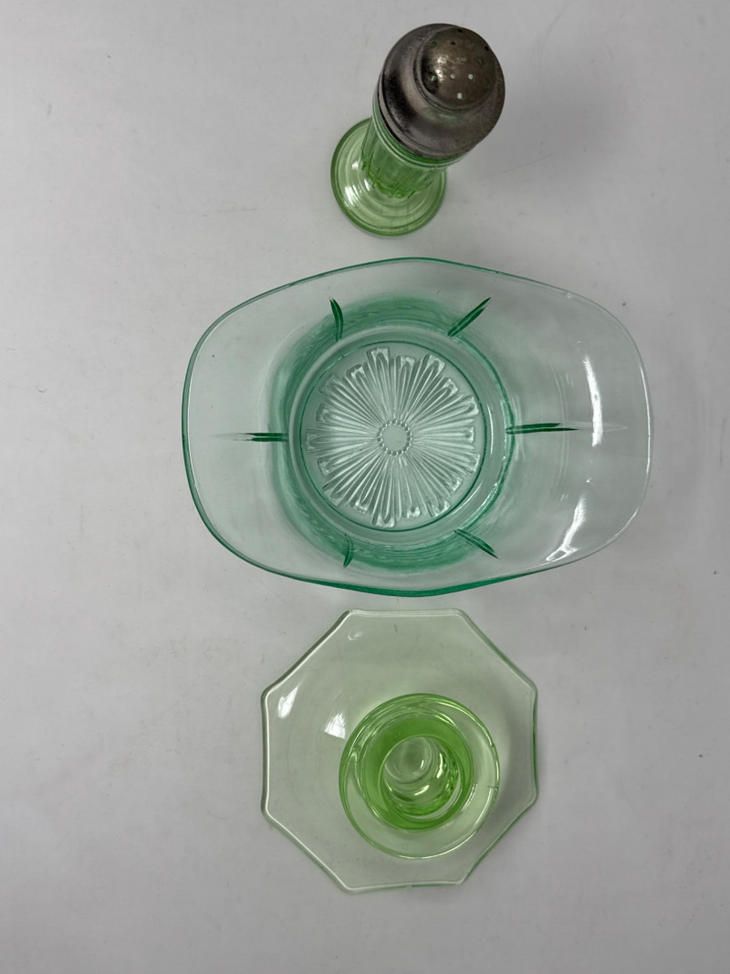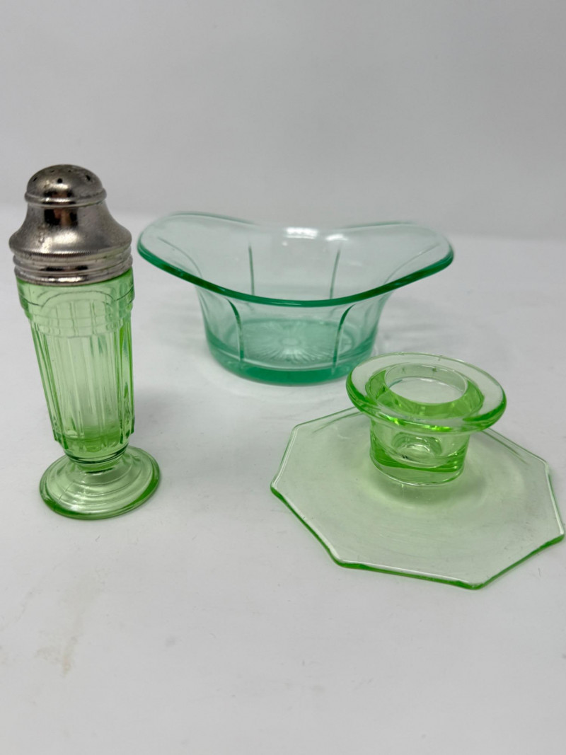 Hazel-Atlas New Century Green uranium glass salt or pepper shaker. It was manufactured by the Hazel-Atlas Glass Company in the United States, with production running from approximately 1930 to 1935. 4.25” Candle holder is 3.75”x3” clear green depression glass. Dish is 5.5”x4”x2.5”