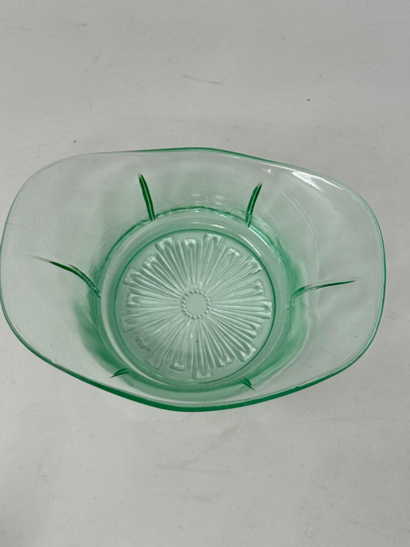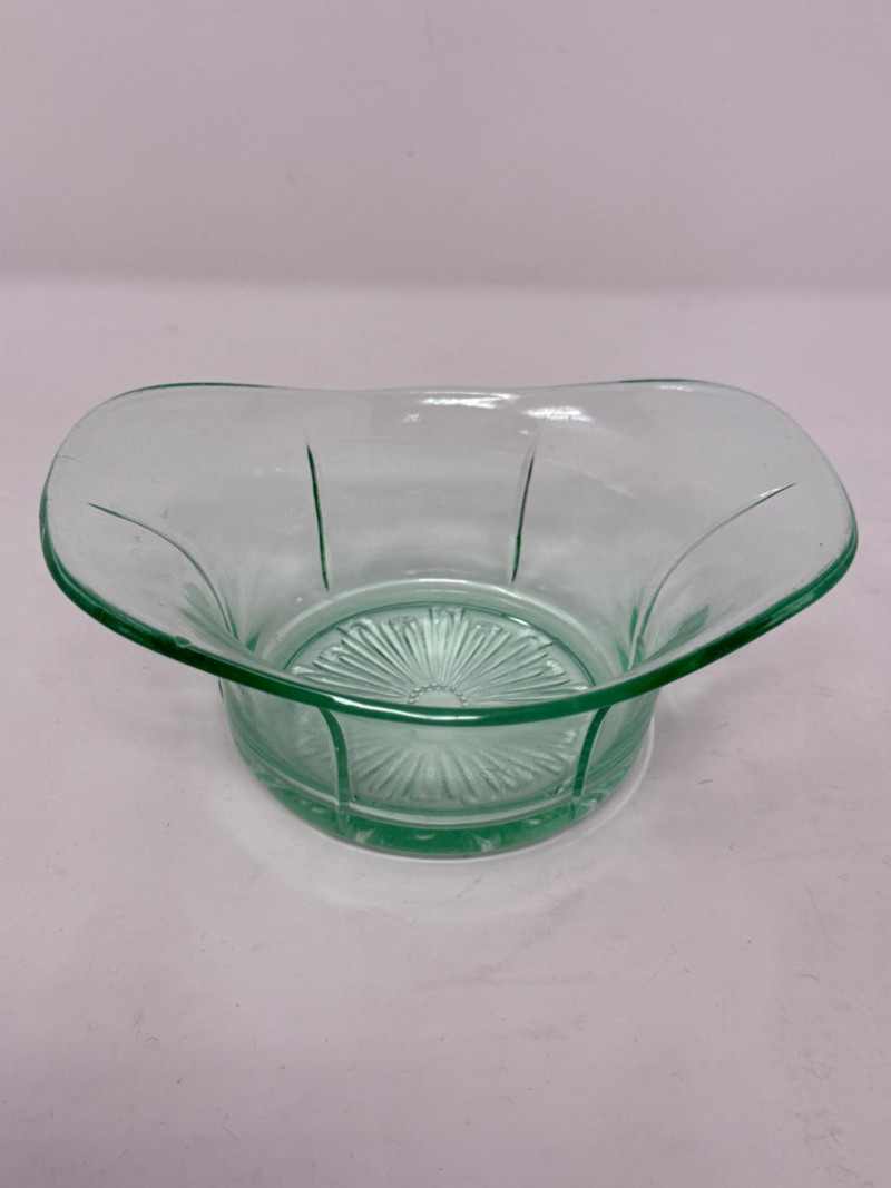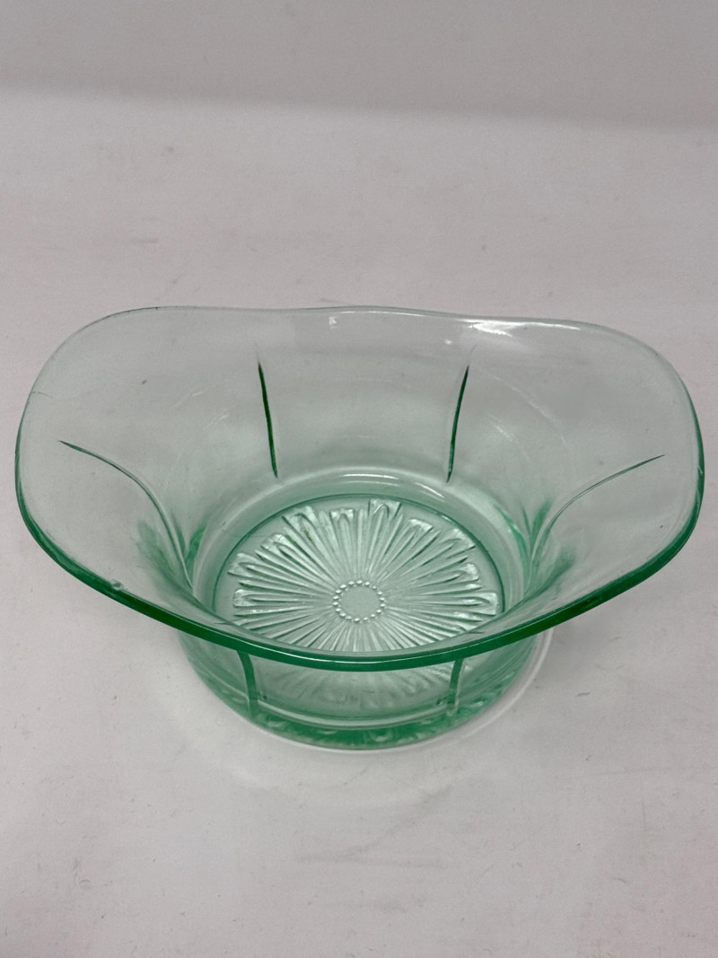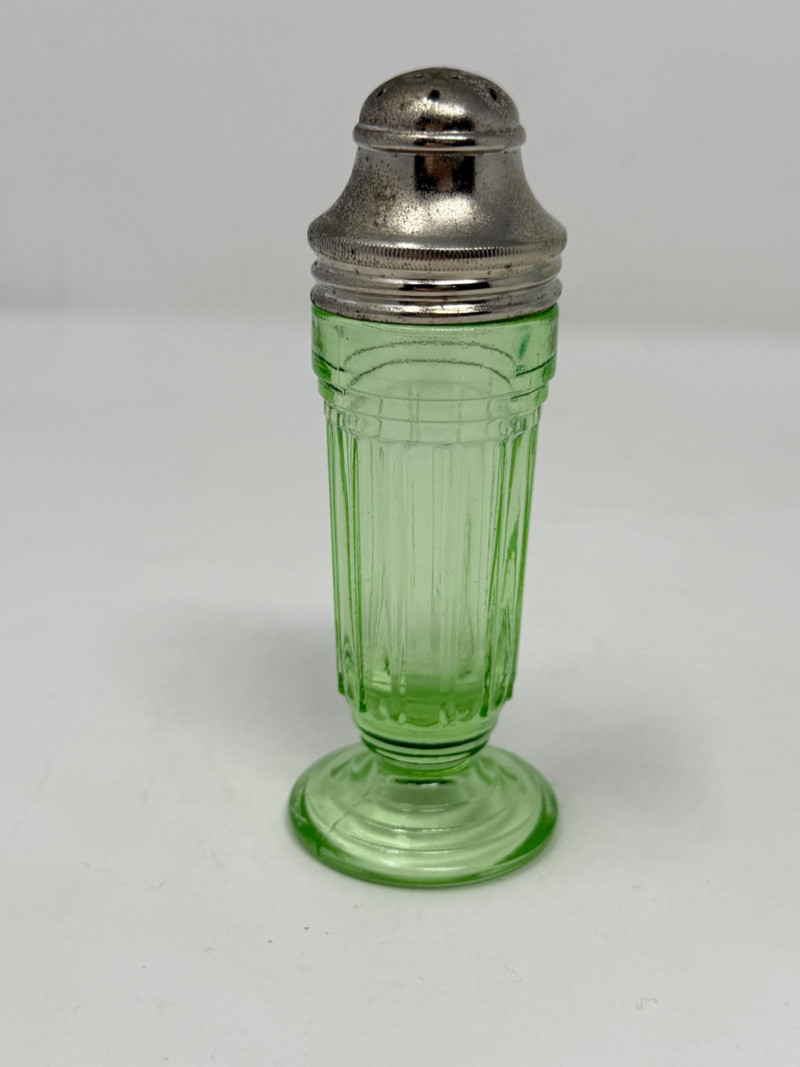 Hazel-Atlas New Century Green uranium glass salt or pepper shaker. It was manufactured by the Hazel-Atlas Glass Company in the United States, with production running from approximately 1930 to 1935. 4.25” Candle holder is 3.75”x3” clear green depression glass. Dish is 5.5”x4”x2.5”