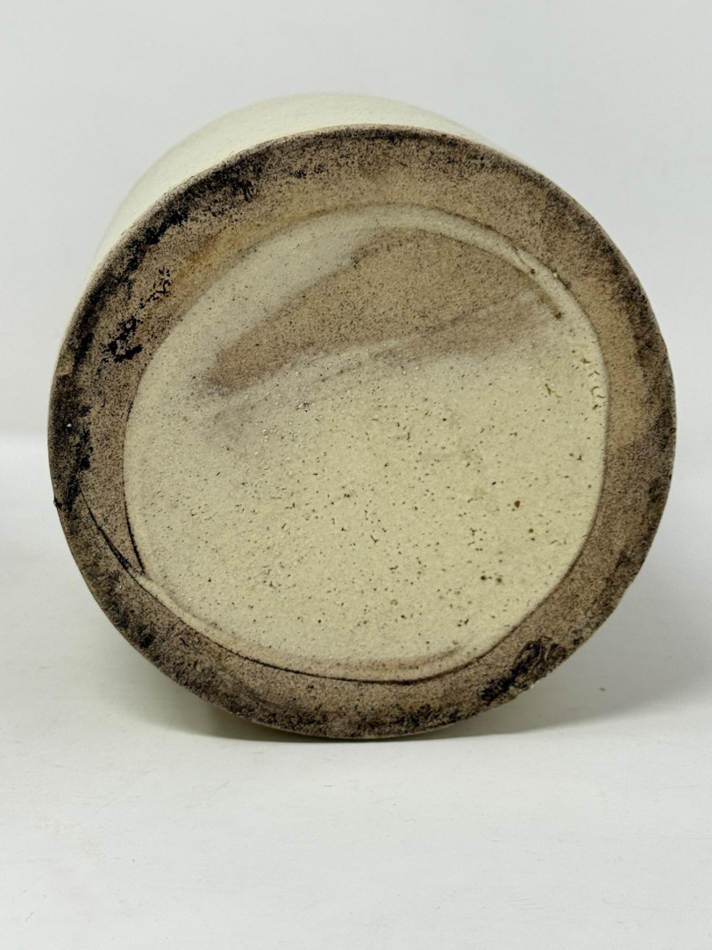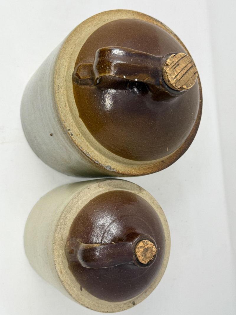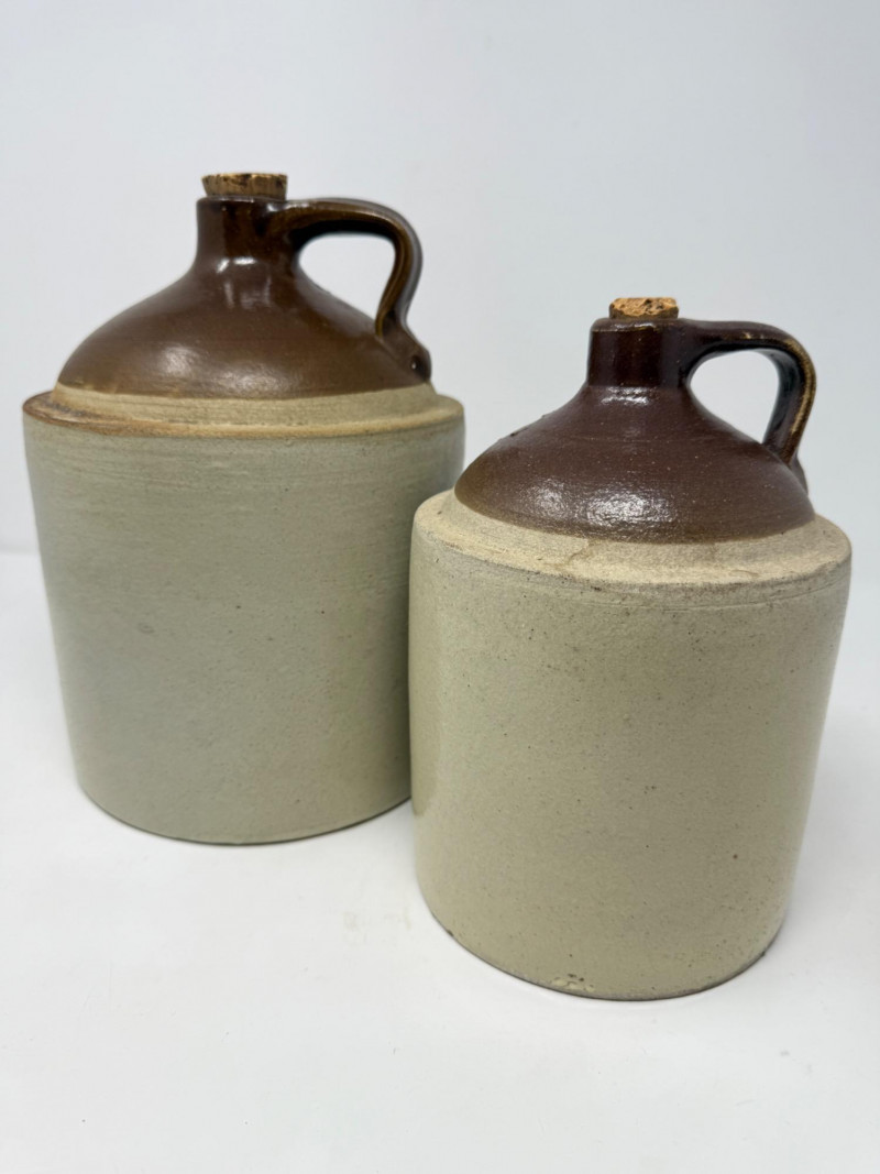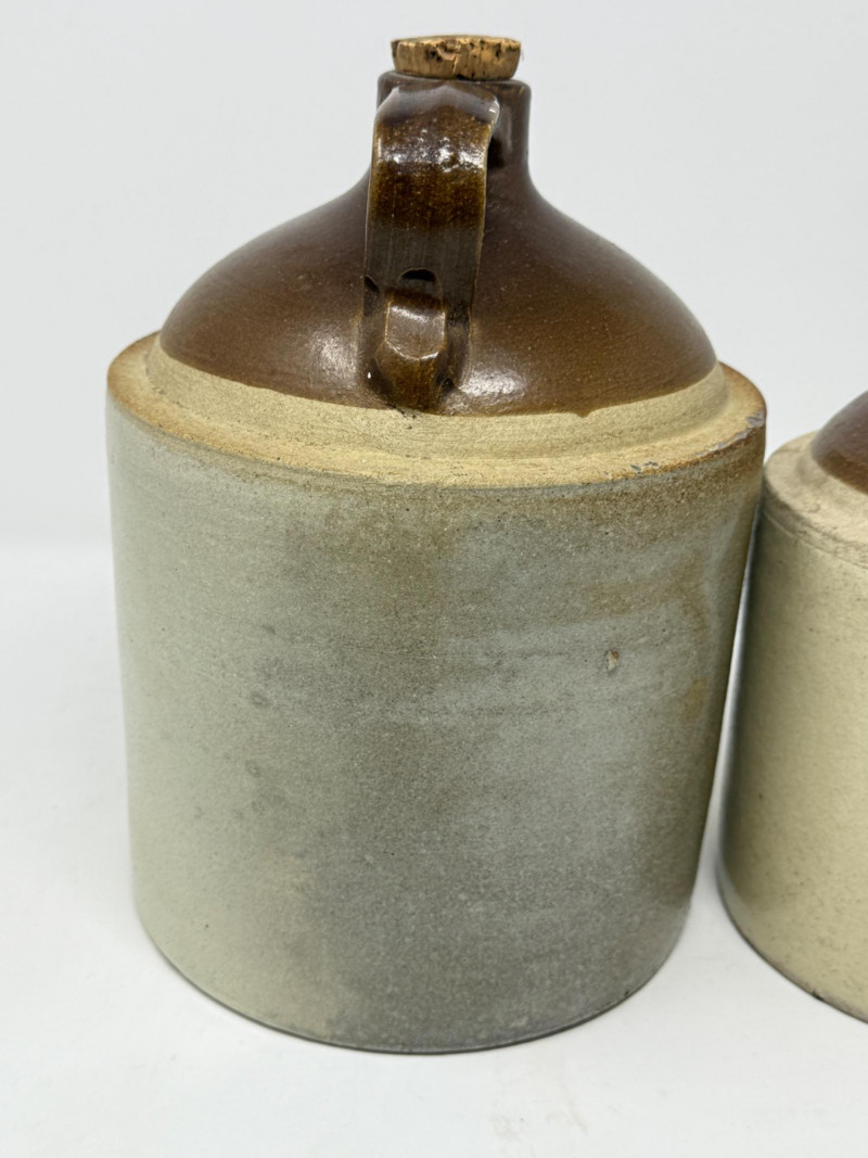 (2) vintage or antique two-tone stoneware jug with a cork stopper. These types of salt-glazed stoneware crocks were popular in the 19th and early 20th centuries for storing and transporting various household goods, including whiskey, moonshine, vinegar, and salted meats. Small is 5.5”x8” Both with corks.