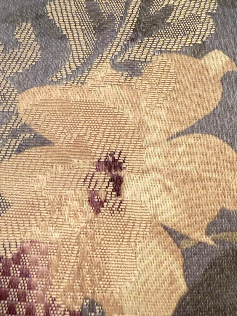 3 removable seat cushions come off to expose a pull out bed with metal frame. Did not open. Appears dusty but in good condition. Sofa upholstery shows little wear with green and pink and tan colors.