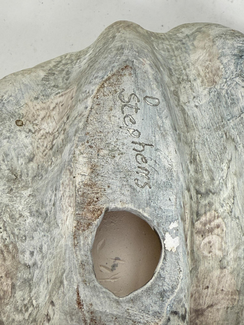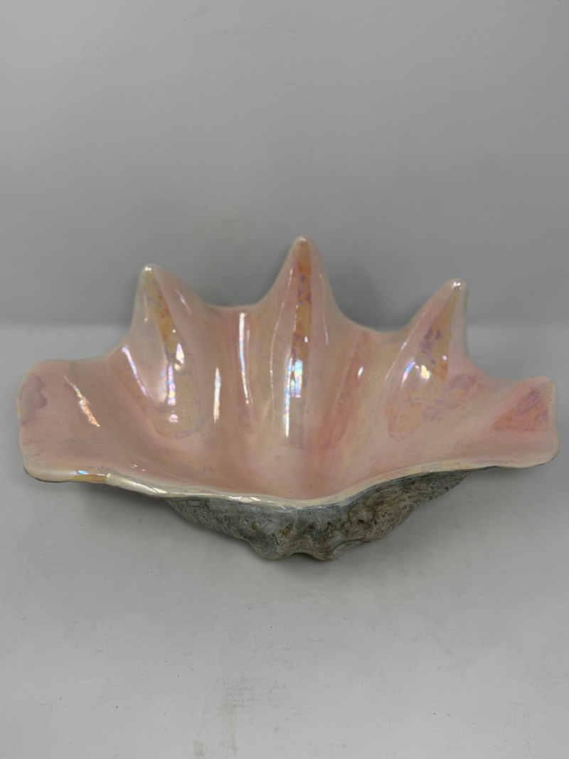Realistic ceramic oyster half shell with iridescent pink interior glaze and matte gray, white and black outer shell. Signed Stephens.