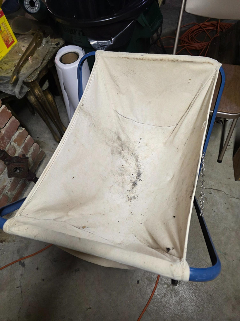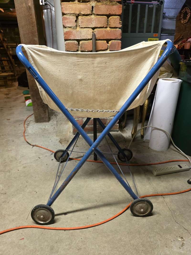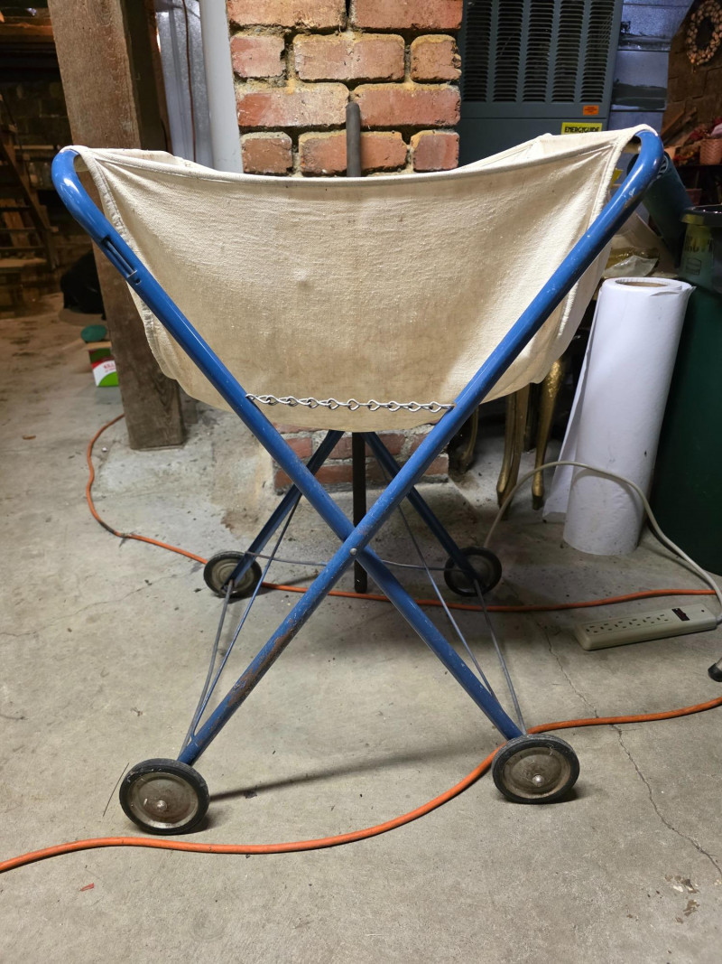 Vintage 1950s Rolling & Folding Laundry Cart It features a canvas basket liner and a blue metal frame with an X-shaped base. The cart is designed to transport large quantities of laundry easily. It has small rubber wheels on the bottom for mobility. 32"T x 22"W x 19"D