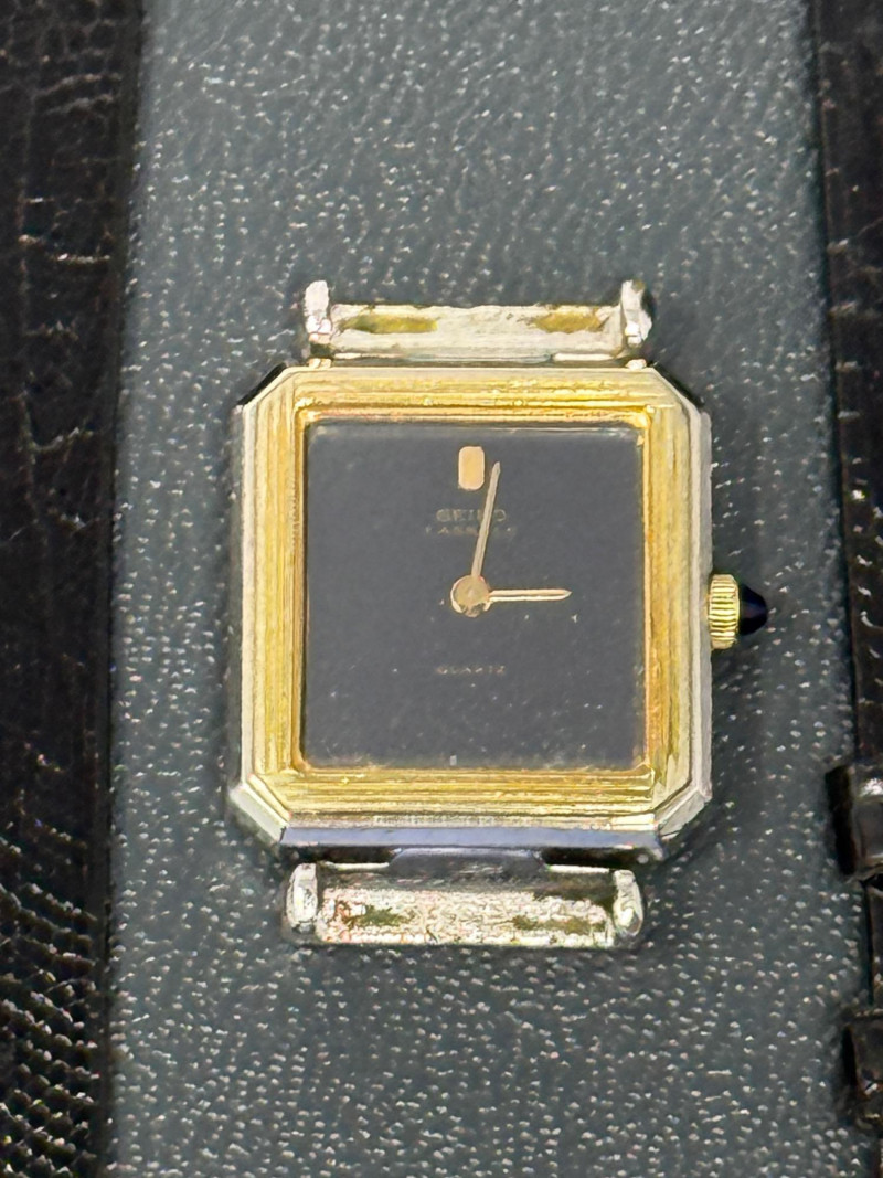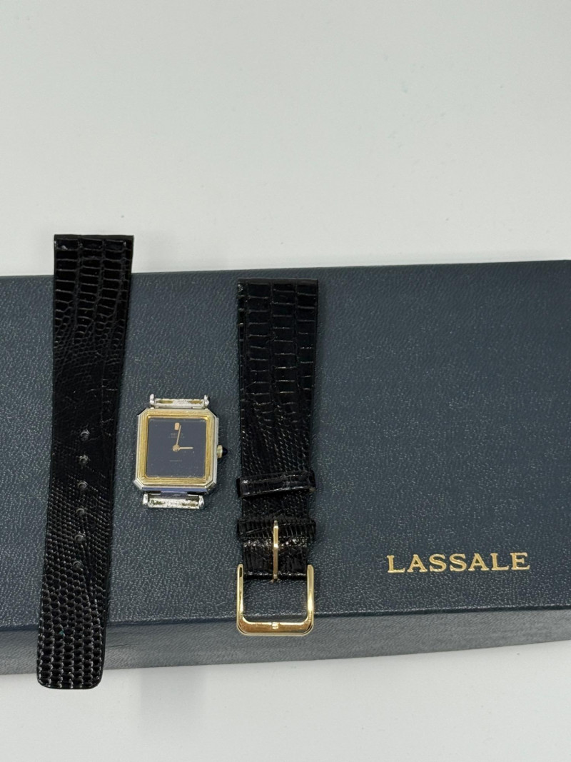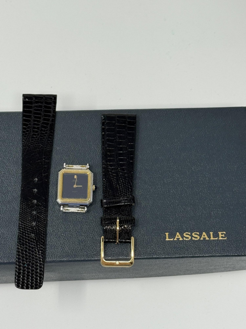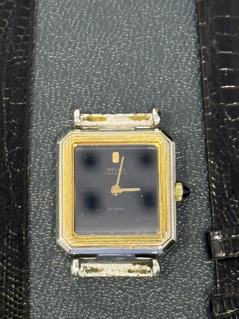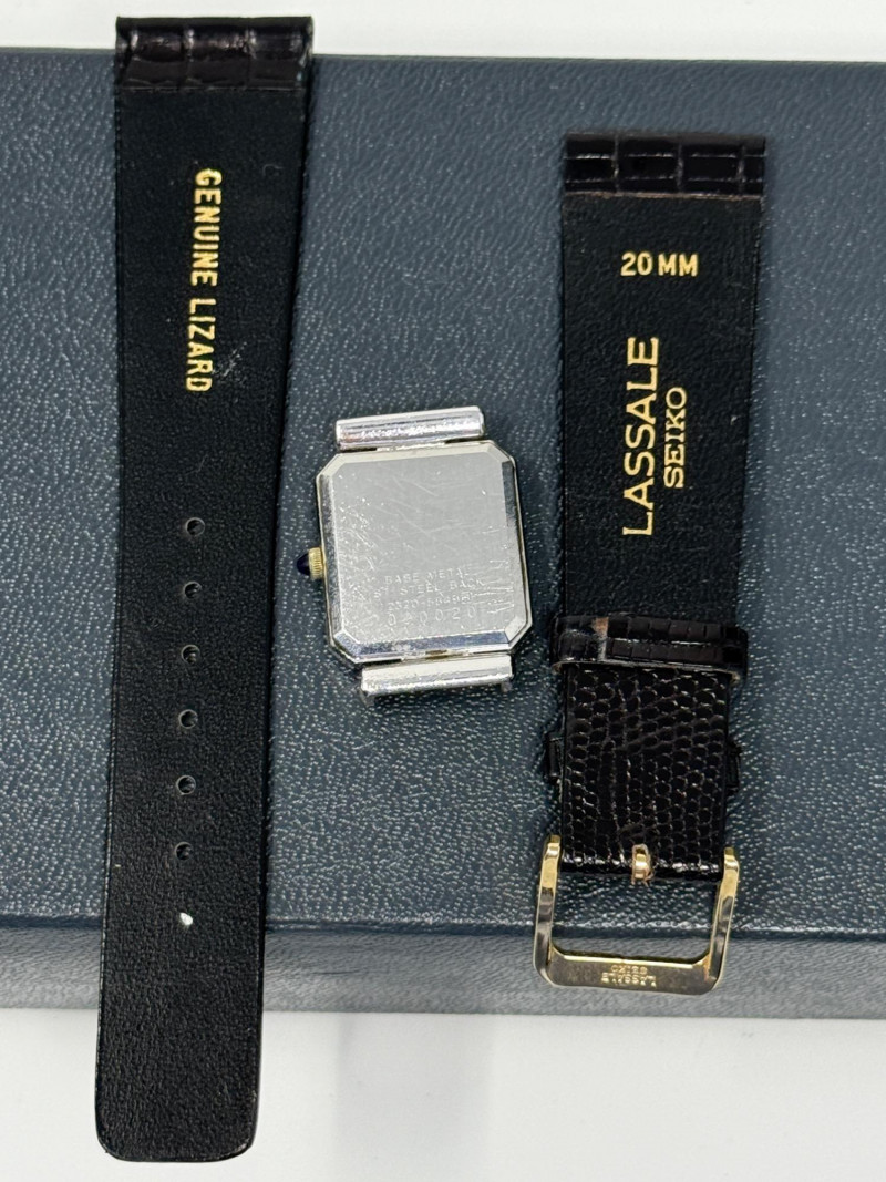 Vintage Seiko Lassale quartz watch, known for its ultra-thin design. The Lassale line was a high-end sub-brand of Seiko in the 1980s and 1990s, renowned for its elegant, jewelry-inspired style and precision movements. Original black lizard wrist strap included. Watch currently has no band attached.