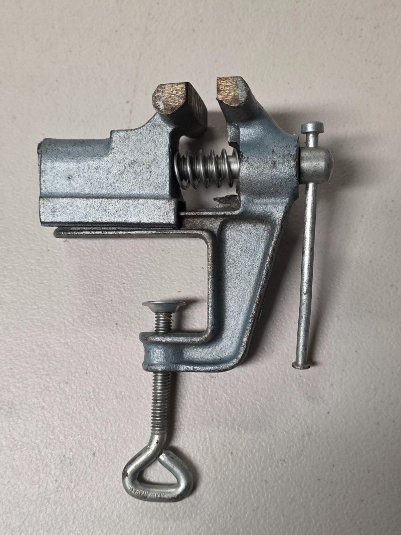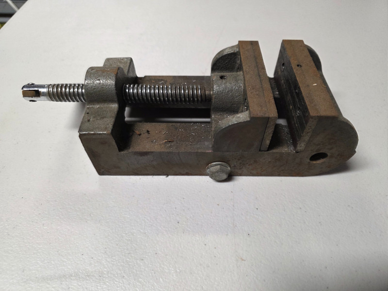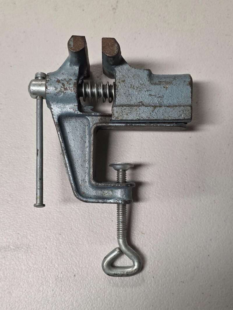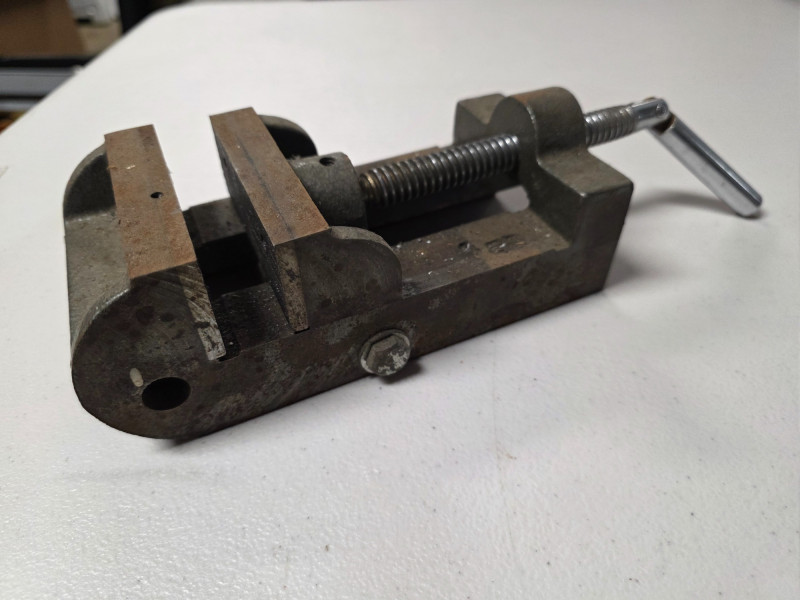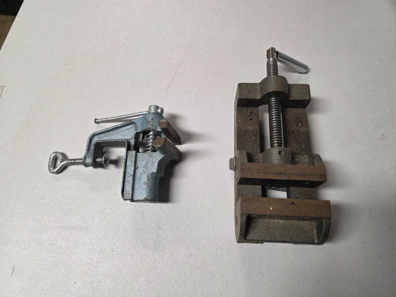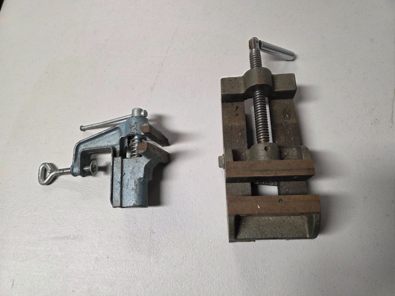 (2) Small Vintage Work Vises (1) Vintage mini bench vise, also known as a jeweler's or hobbyist's vise, typically used for holding small items in place during detailed work - 7"T x 5"L (1) Drill press vise designed to securely hold workpieces during drilling, tapping, or reaming operations - 2.5"T x 10"L Both appear to be in working condition