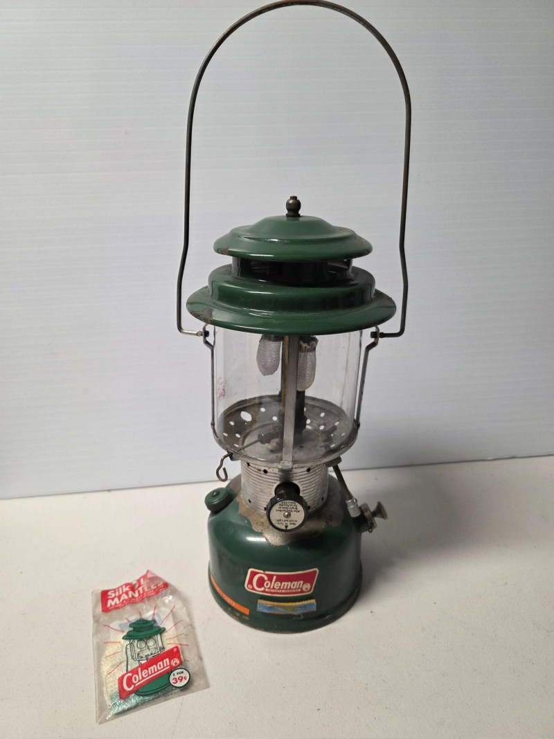 Vintage Coleman Double-Mantle Lantern Coleman Model #220F Signature green metal housing It is a liquid fuel lantern designed for camping and outdoor use. Includes is a package of replacement mantles These lanterns are known for their durability and bright light output Untested! 14"T x 6"W