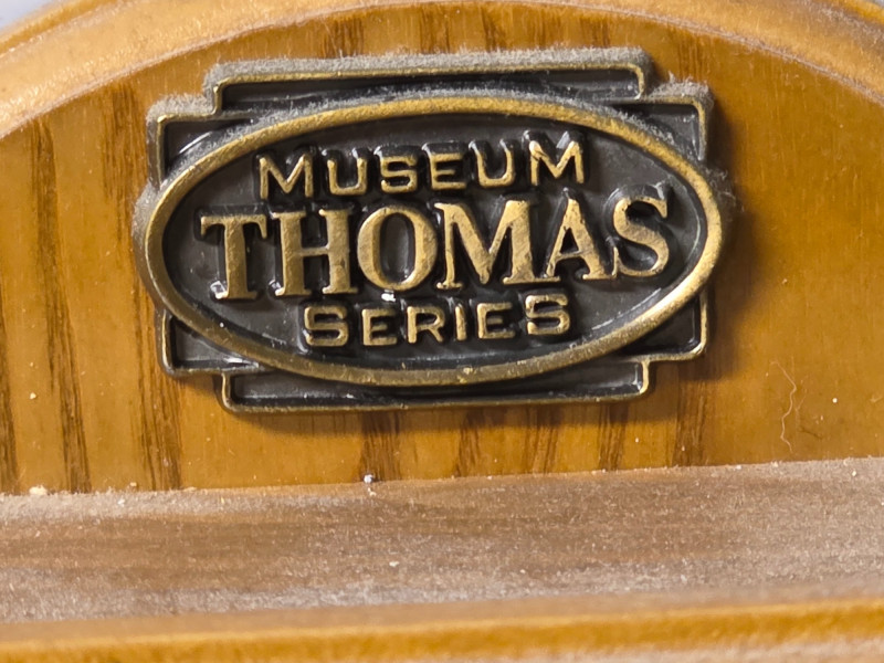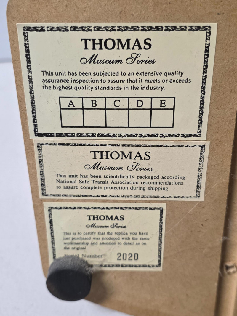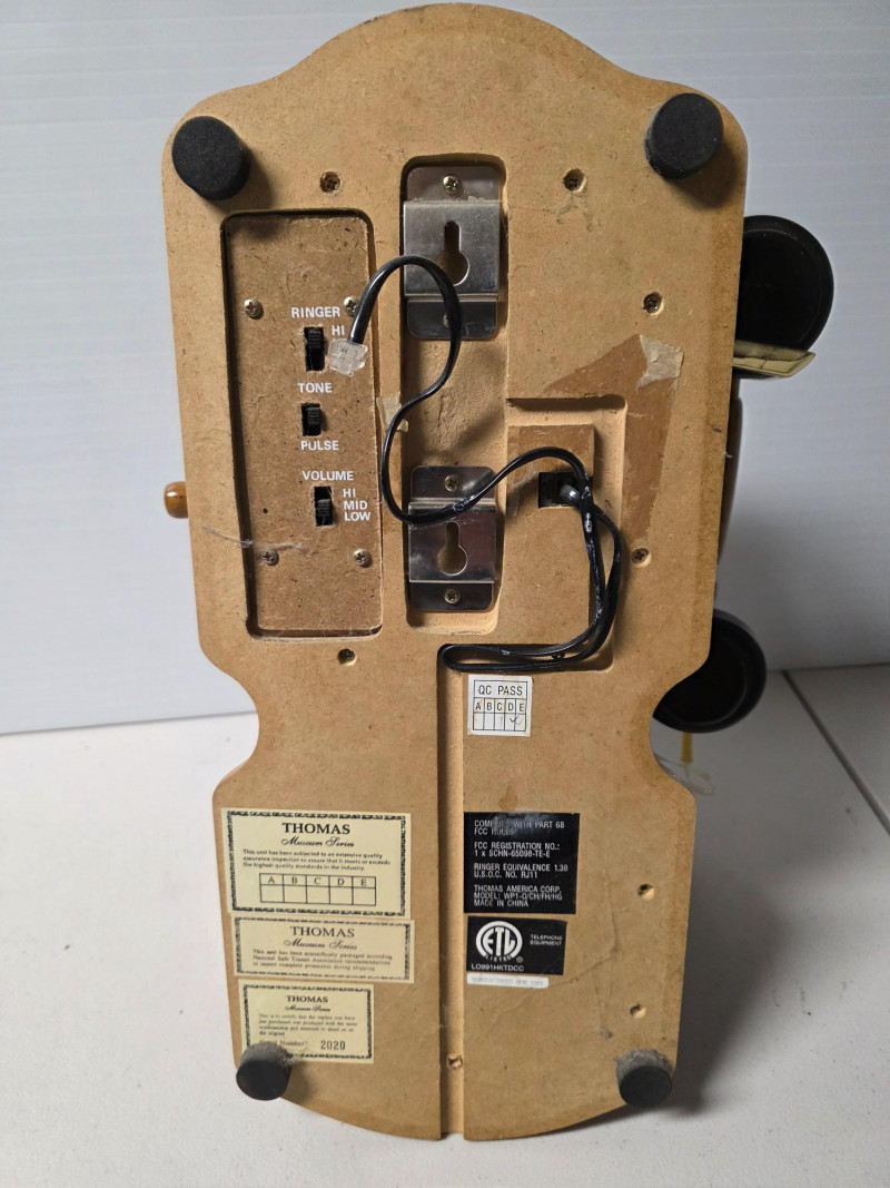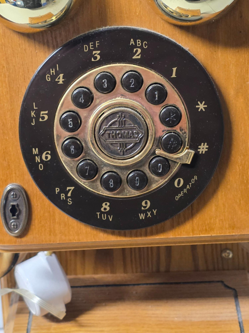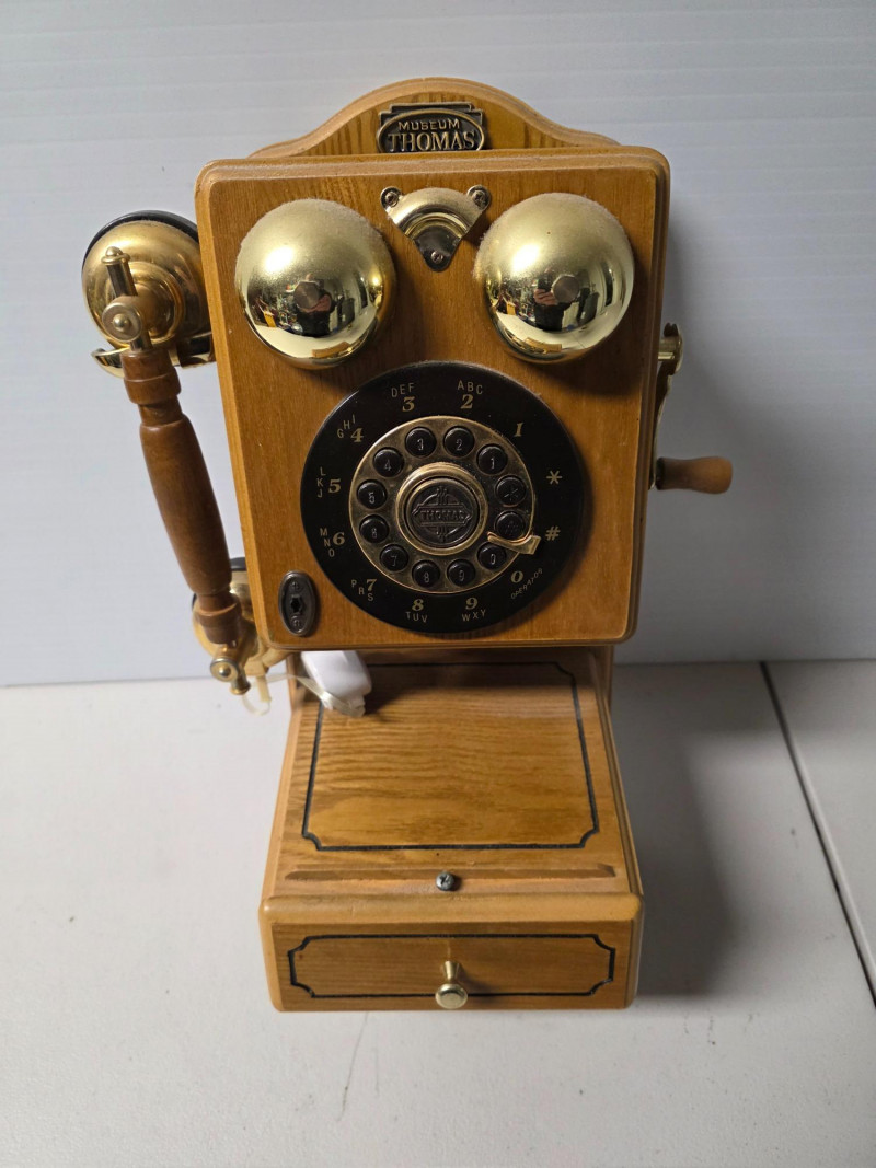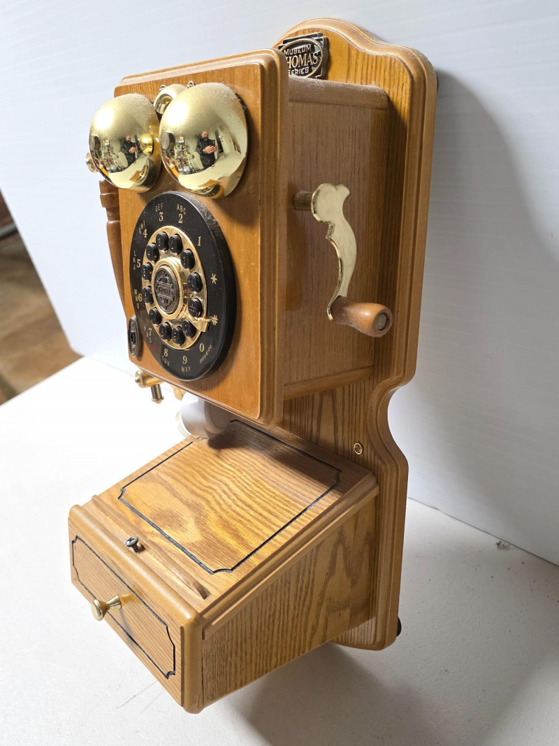 Thomas Crosley Museum Series Wall Telephone Reproduction of early American heritage phones from the 1920s. The phone features modern push-button technology with a rotary fashion dial. It is made with a handcrafted wood and veneer cabinet and brushed bronze-plated hardware. Includes a non-functional crank handle and last number redial function Untested - Includes handset 18"T x 7.5"W x 6.5"D