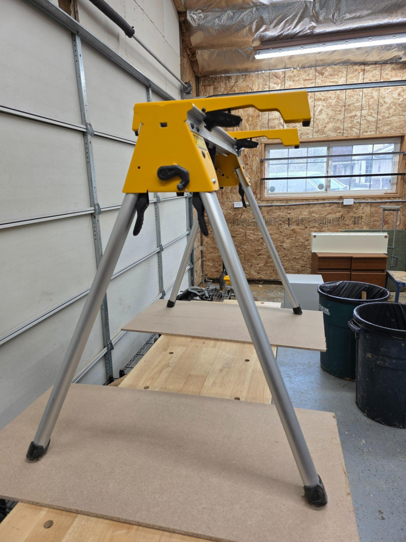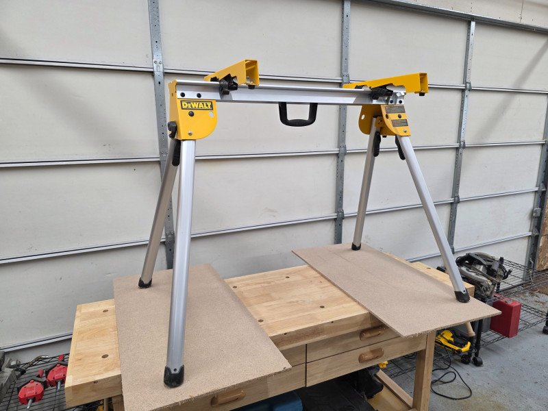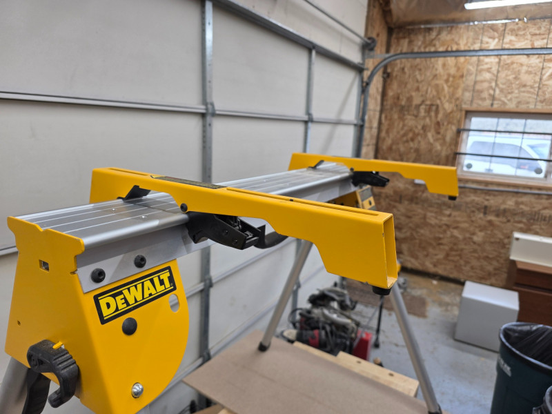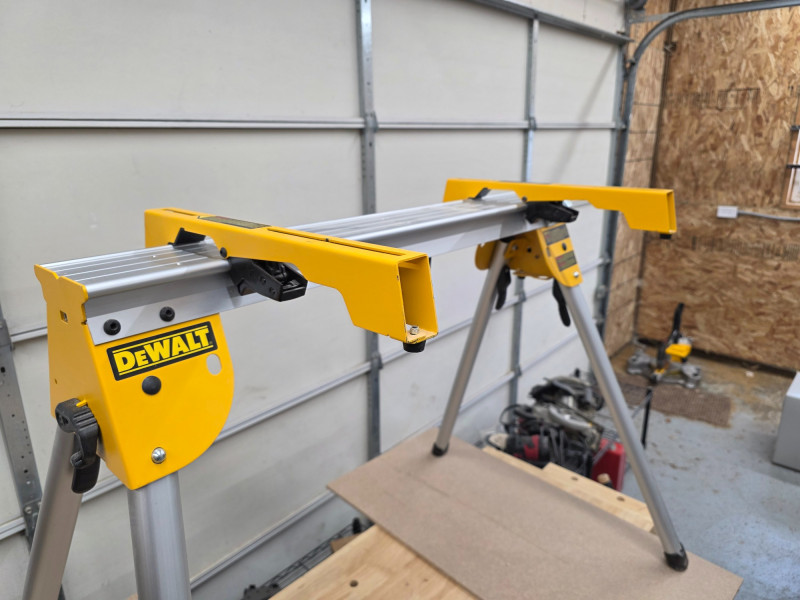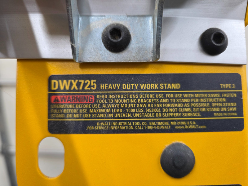 DeWalt Compact Heavy-Duty Work & Miter Saw Stand The DeWalt DWX725 is a compact, lightweight, heavy-duty work stand designed primarily for use as a sawhorse or with a miter saw Capacity: Rated for a 1,000 lb capacity per stand Lightweight Construction: Made from lightweight aluminum, the stand weighs only 15.4 lbs allowing for easy transport. Portability & Storage: Features a compact design with folding legs and leg lock levers for fast, easy setup and breakdown. A transport latch allows a pair of stands to be carried together. Compatibility: Accepts included DeWalt miter saw mounting brackets for use as a dedicated tool stand. Versatility: Can be used as a standalone sawhorse or a base for a table top. The top surface has pre-drilled holes for attaching a sacrificial 2x material or compatible clamps. Includes miter saw sliding clamps 33.5"T x 45.5"W x 27.5"D
