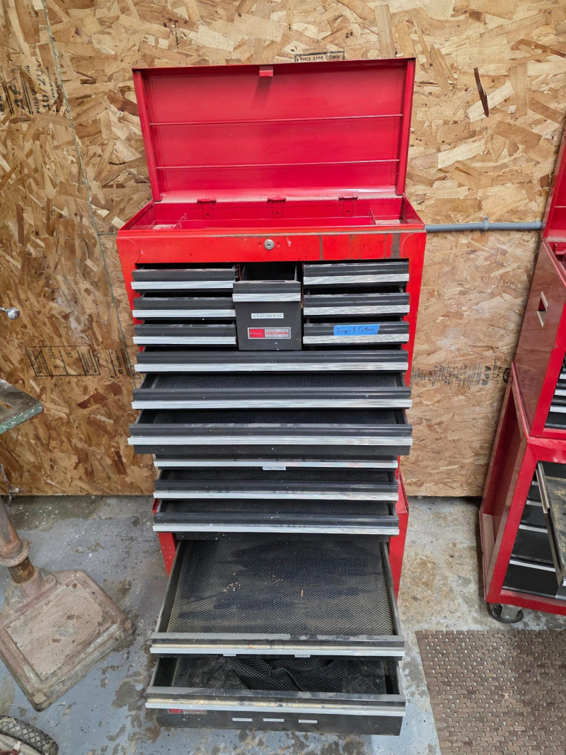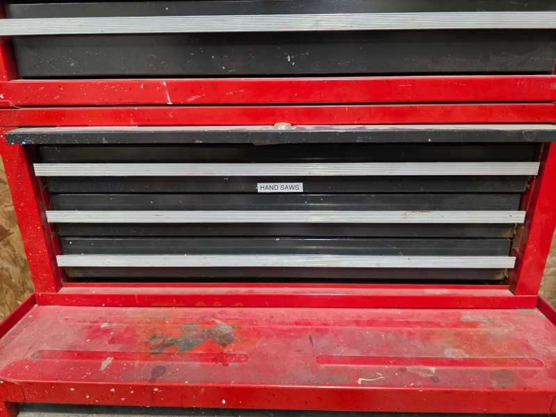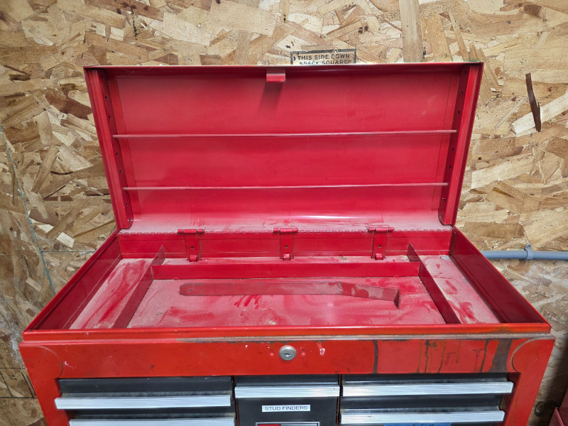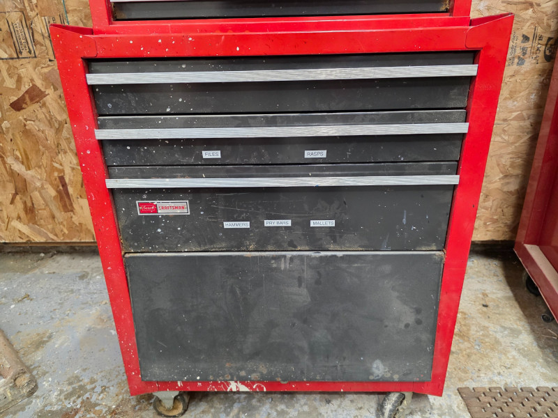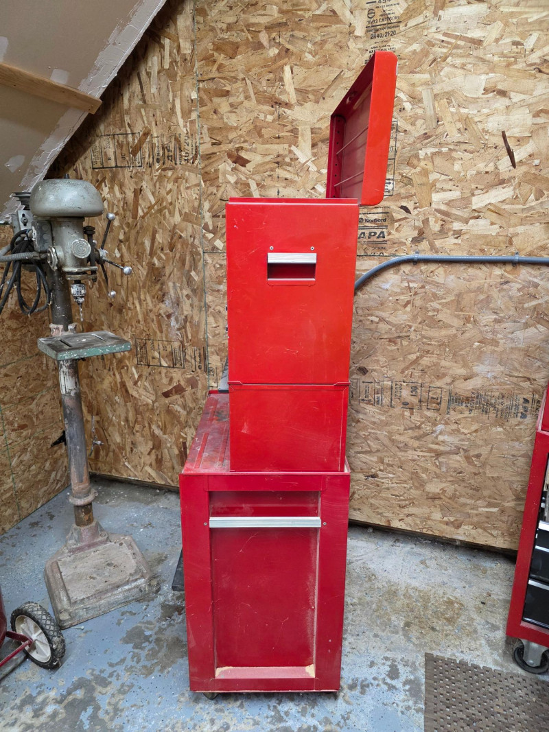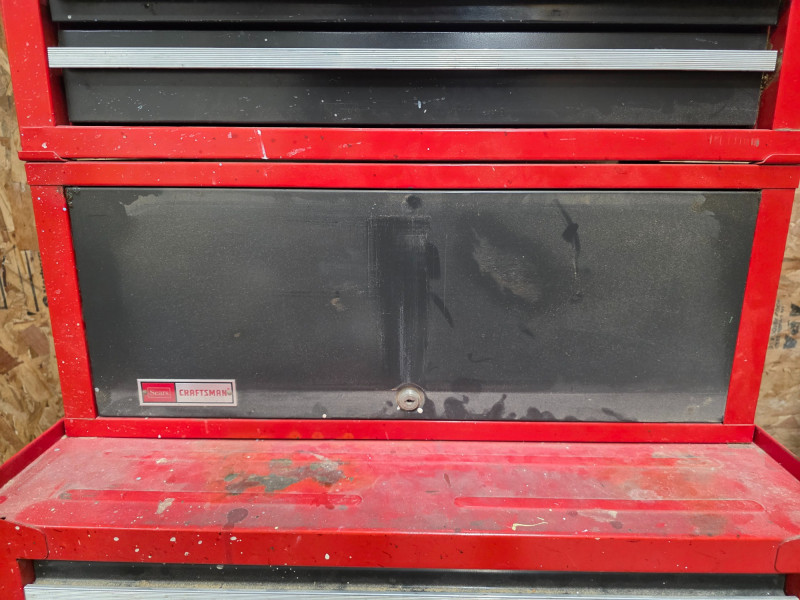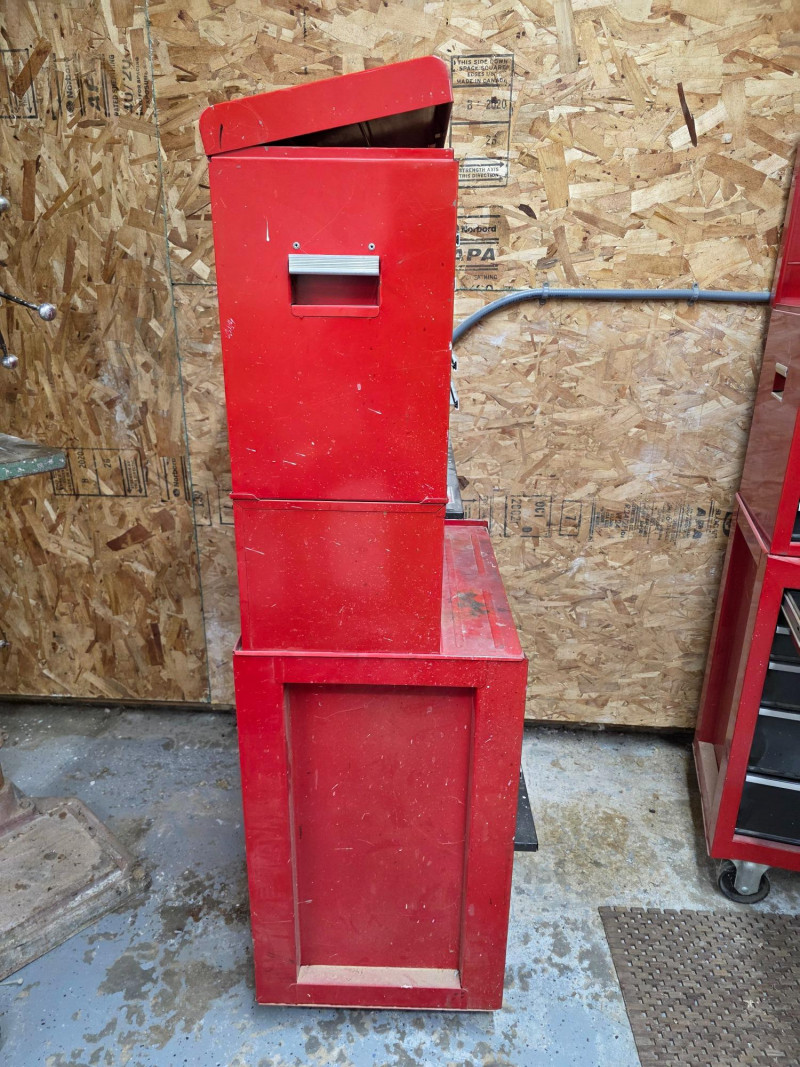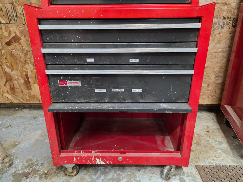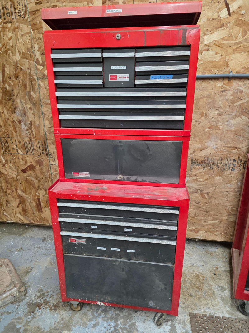 Vintage Craftsman 3-Piece Tool Chests & Rolling Cabinet It is a stacked unit, consisting of a top chest, middle chest and a bottom rolling cabinet. The unit features multiple drawers with ball-bearing slides for smooth operation. It is constructed of all-welded steel and finished with a red powder coat. Top, Middle and bottom chests have pull out lockable cover (no keys) The rolling cabinet has casters for mobility around a garage or workshop Top drawer of bottom rolling chest appears locked (no key) 66"T x 27"W x 18"D (all 3 stacked)