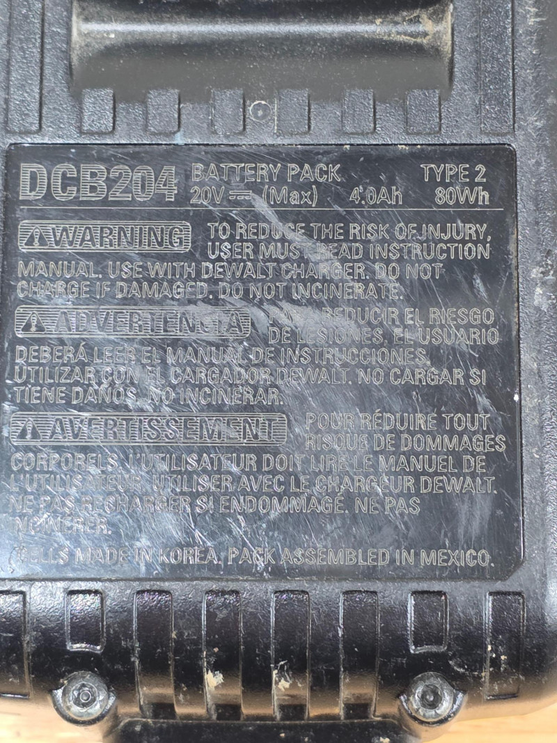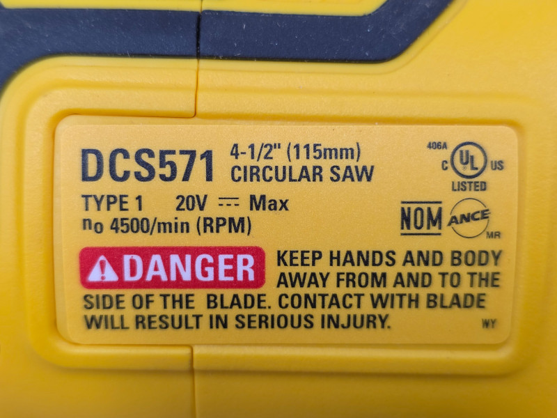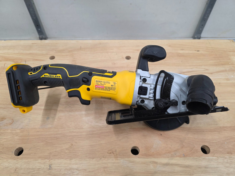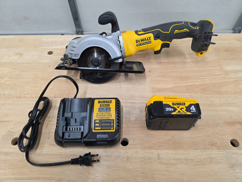 DeWalt Compact Bushless 20V MAX Atomic Series 4.5" Cordless Circular Saw DeWalt Model #DCS571 Brushless Motor: Provides efficient power for various cuts. Compact & Lightweight: Part of the Atomic line, it's lighter than previous models, improving handling. Bevel Gear Design: Allows for standard cuts in 2x lumber and 1x material at 45°. Blade & Depth Adjustment: Tool-free adjustments for quick changes. On-Board Storage: Convenient storage for the blade change key. Elongated Handle: Offers better reach for ripping plywood and OSB. Electronic Blade Brake: Stops the blade quickly for safety and productivity. Includes (1) 20V MAX Lithium Ion 4amp battery (DCB204), 12V/20V MAX battery charger (DCB112) Tested - Works!
