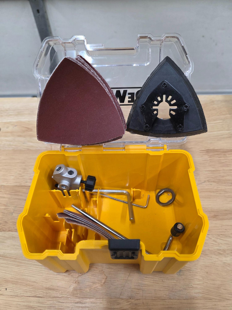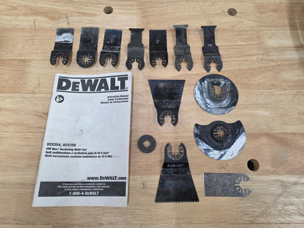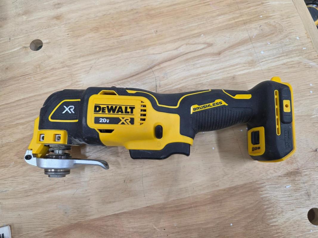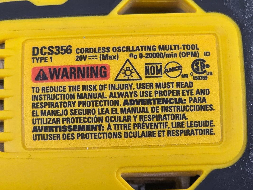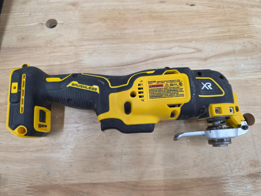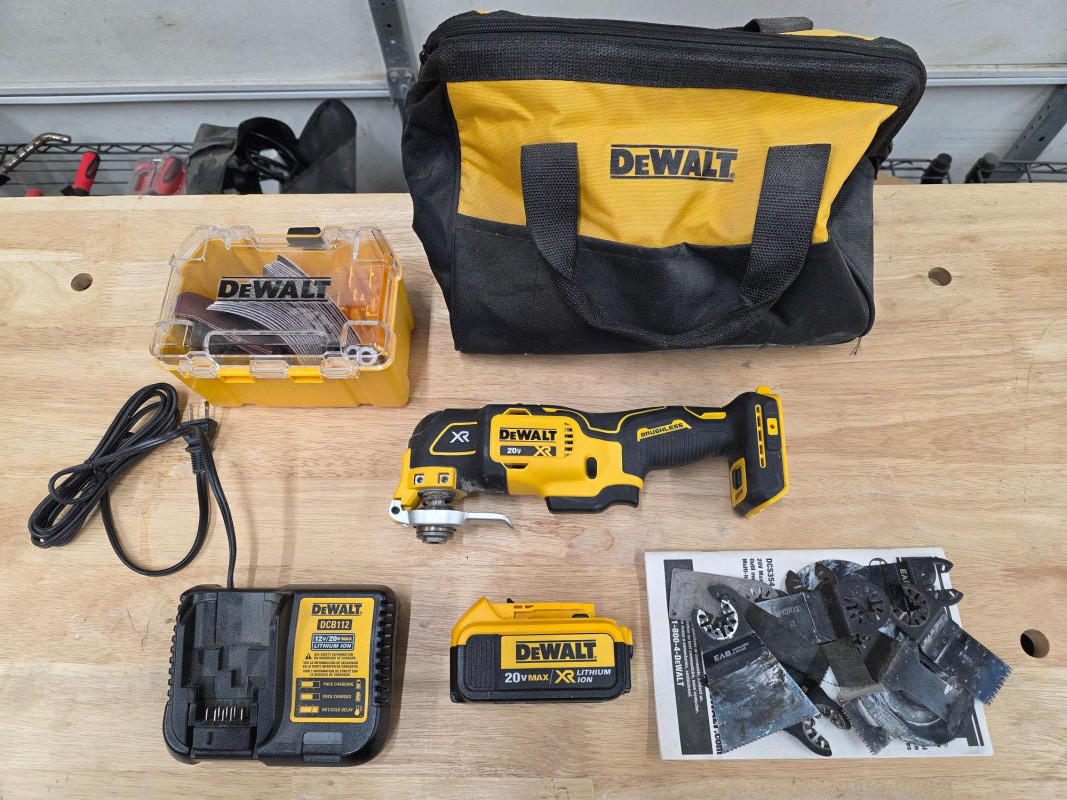 DeWalt Brushless 20V MAX XR Cordless Oscillating Multi-Tool DeWalt Model #DCS356 Brushless Motor: Delivers powerful performance and extended runtime. 3-Speed Selector: Allows users to match the speed to the specific application (e.g., cutting, scraping). Quick-Change System: Enables fast, tool-free blade changes. Universal Adapter: Compatible with most oscillating tool accessories. Variable Speed Trigger: Offers ultimate control. LED Light: Illuminates dark work areas Includes (1) 20V MAX Lithium Ion 4amp battery (DCB204), 12V/20V MAX battery charger (DCB112), (12) used EAB blades, tons of sanding discs and attachment kit in small plastic tool box, tool bag, manual Tested - Works!