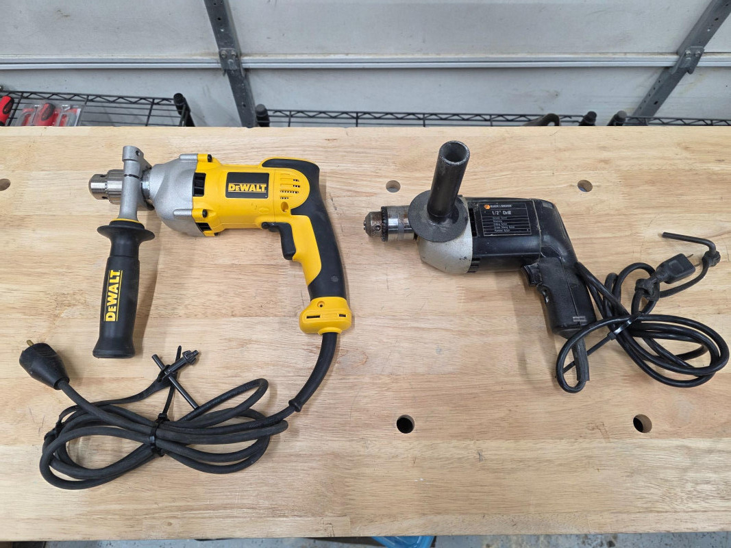 (2) Corded 1/2" Variable Speed Reversing Pistol Grip Drills (1) DeWalt Corded 1/2" Variable Speed Reversing Pistol Grip Drill designed for heavy-duty drilling applications in wood and steel - #DWD210G (1) Vintage Black & Decker Corded Electric 1/2" Variable Speed Reversible (VSR) Hammer Drill - #7277 Both Tested - Both Work!