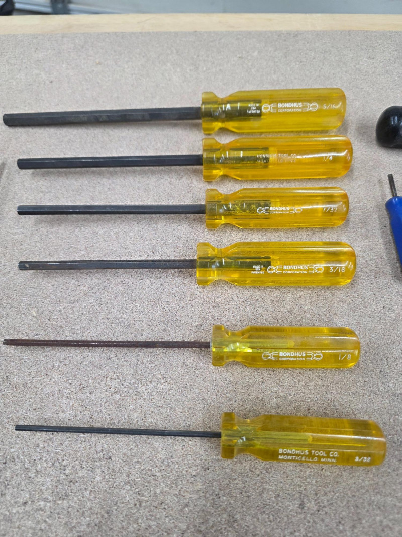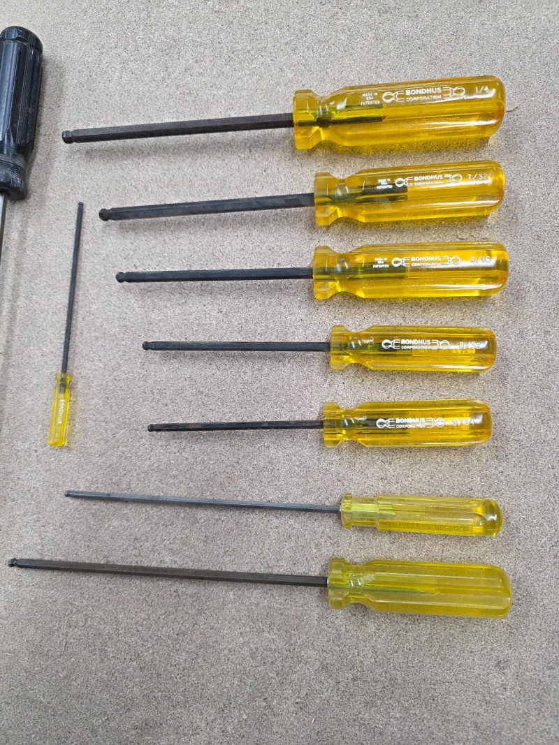 Bondhus & Vaco Hex Key Driver Sets (8) Bondhus ball-end hex drivers (1/4" - 9/64") (6) Bondhus hex drivers (5/16" - 3/32") (8) Vaco metric hex drivers (6mm - 1.27mm) Includes an entire small bucket of traditional hex keys
