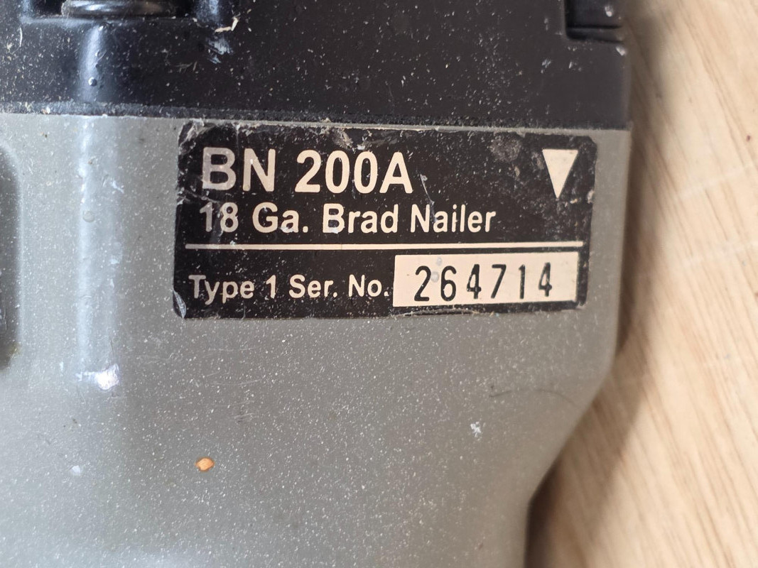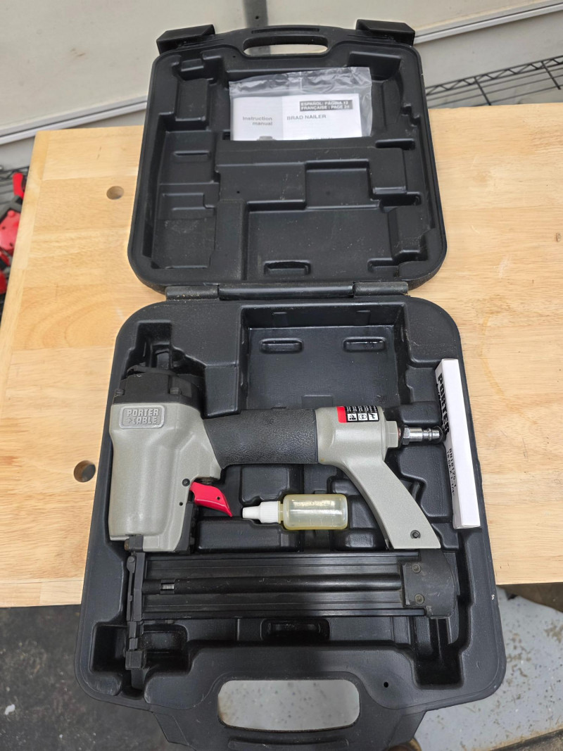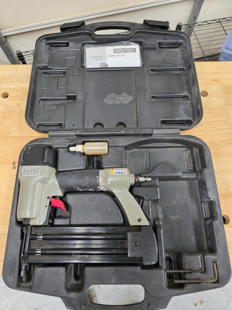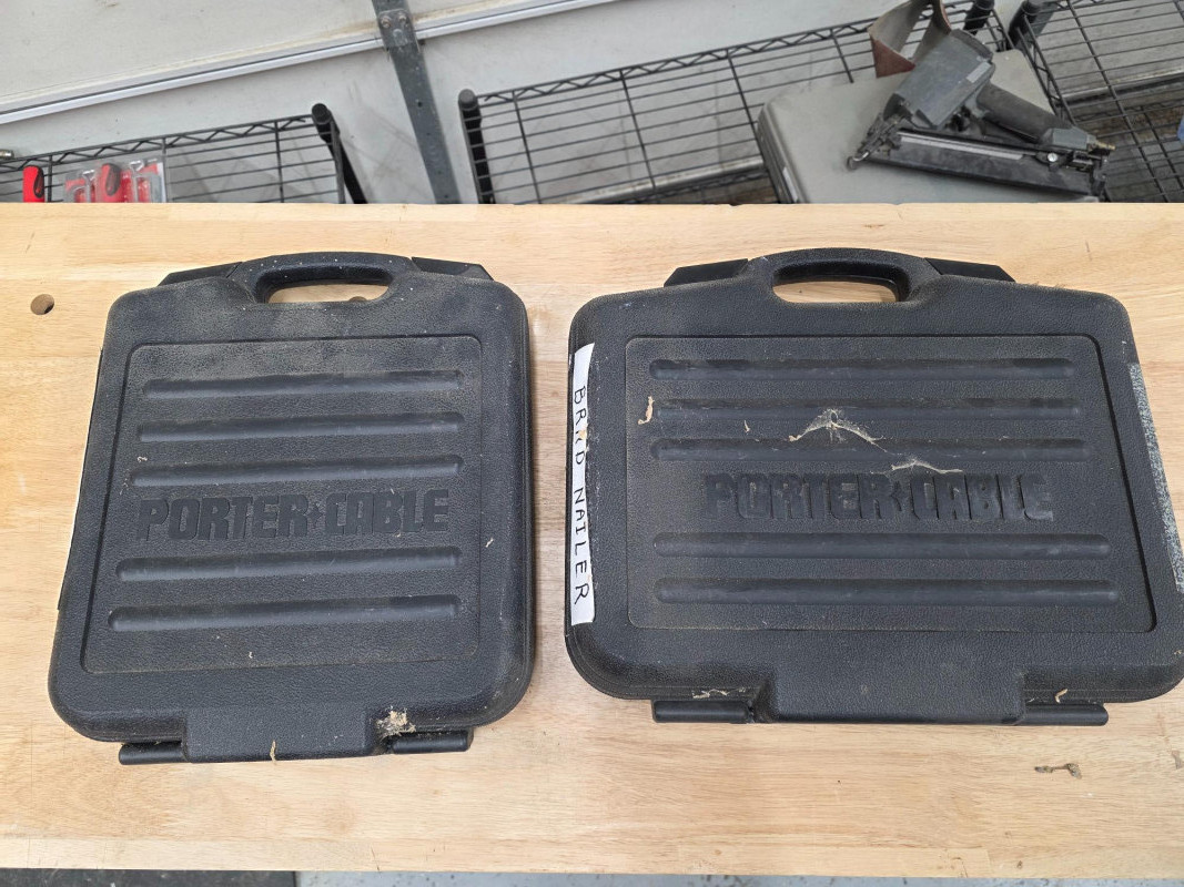 (2) Porter Cable 18 gauge Air Brad Nailers In Hard Cases (1) Porter Cable 18 gauge Brad Nailer - #BN125A Gauge: 18-Gauge Nail Length: 5/8" to 1-1/4" Power: Pneumatic (Air-Powered) Body: Lightweight die-cast aluminum Trigger: Sequential fire Jam Release: Tool-free mechanism Applications: Woodworking, trim, finish work, carpentry (1) Porter Cable 18 gauge Brad Nailer - #BN200A Gauge: 18-Gauge Brad Nails. Nail Length: 3/4-inch to 2-inch. Power: Pneumatic (requires an air compressor). Pressure: Max working pressure around 120 psi. Motor: Maintenance-free. Adjustments: Tool-free depth-of-drive and jam release. Design: Rear exhaust, sequential trigger, low nail reload indicator, removable non-marring nose tip. Use: Ideal for finishing, trim, molding, and cabinet work Includes hard cases & manuals Both Tested - Both Work!