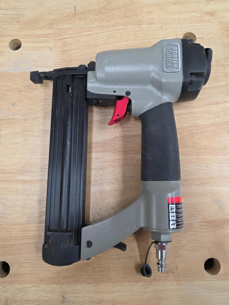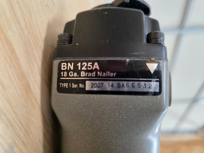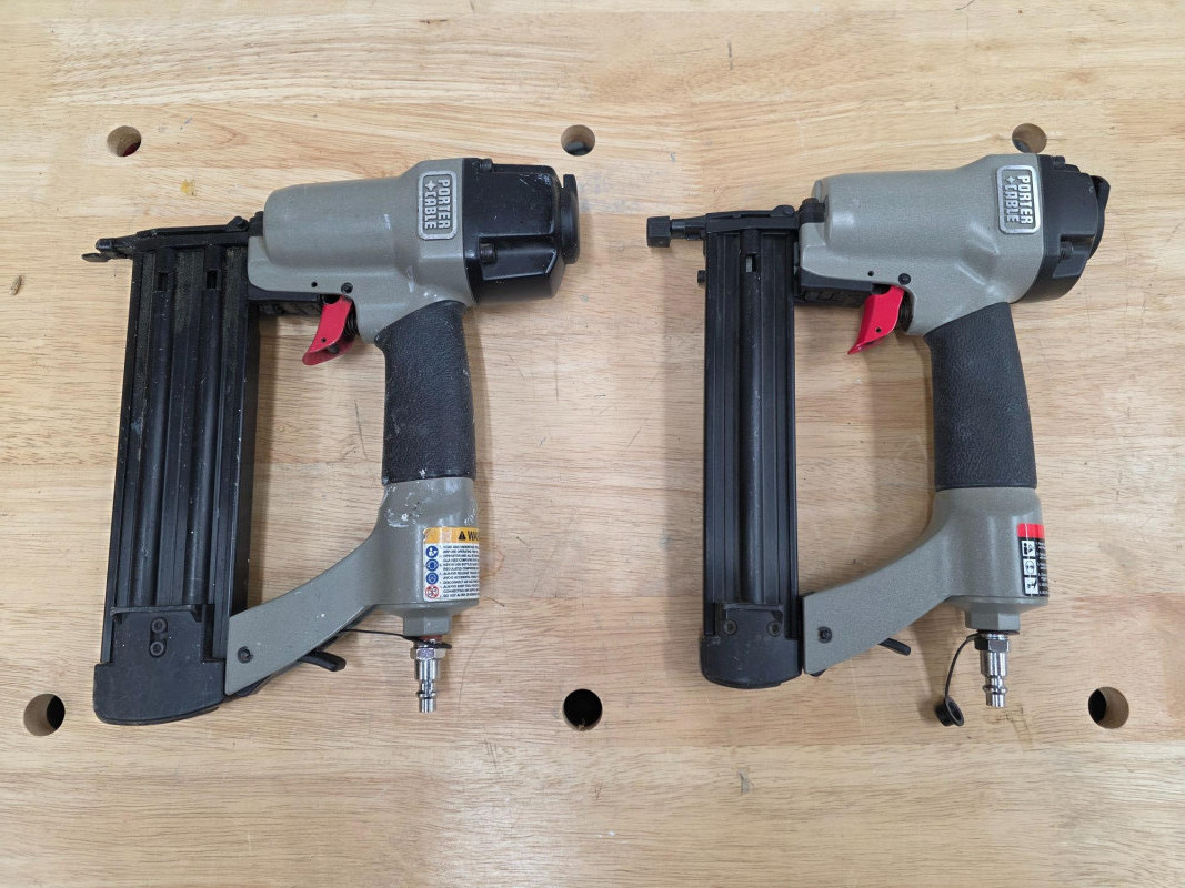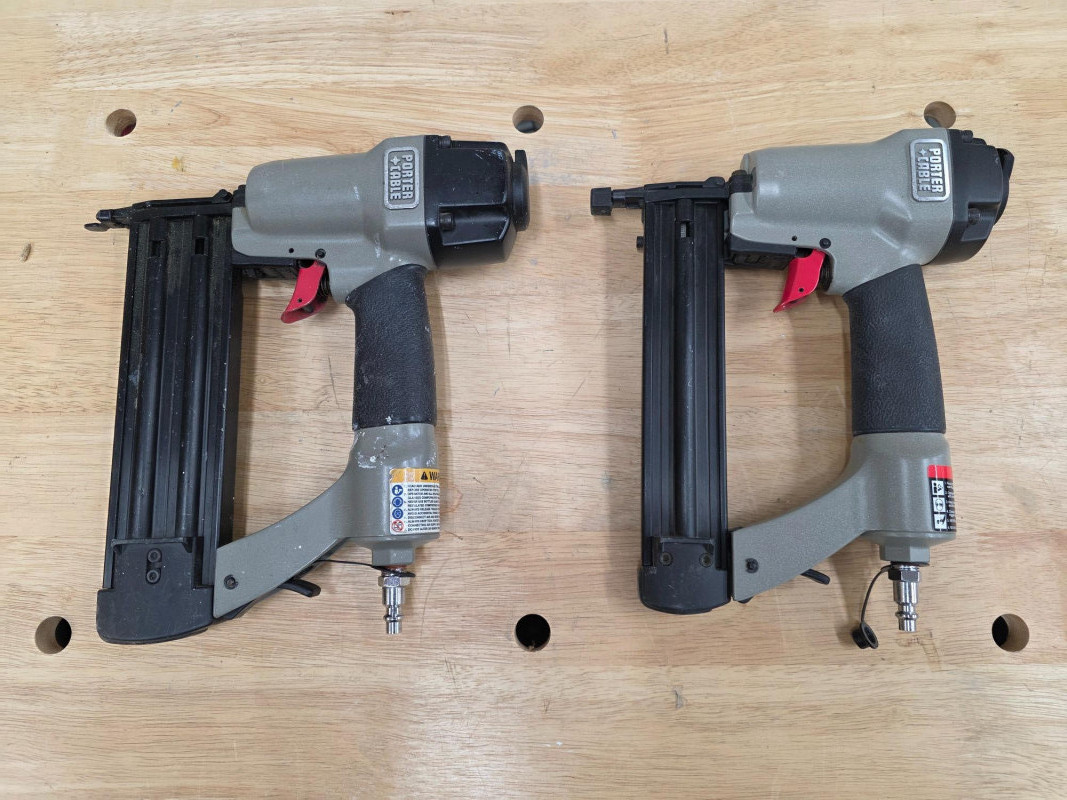 (2) Porter Cable 18 gauge Air Brad Nailers In Hard Cases (1) Porter Cable 18 gauge Brad Nailer - #BN125A Gauge: 18-Gauge Nail Length: 5/8" to 1-1/4" Power: Pneumatic (Air-Powered) Body: Lightweight die-cast aluminum Trigger: Sequential fire Jam Release: Tool-free mechanism Applications: Woodworking, trim, finish work, carpentry (1) Porter Cable 18 gauge Brad Nailer - #BN200A Gauge: 18-Gauge Brad Nails. Nail Length: 3/4-inch to 2-inch. Power: Pneumatic (requires an air compressor). Pressure: Max working pressure around 120 psi. Motor: Maintenance-free. Adjustments: Tool-free depth-of-drive and jam release. Design: Rear exhaust, sequential trigger, low nail reload indicator, removable non-marring nose tip. Use: Ideal for finishing, trim, molding, and cabinet work Includes hard cases & manuals Both Tested - Both Work!