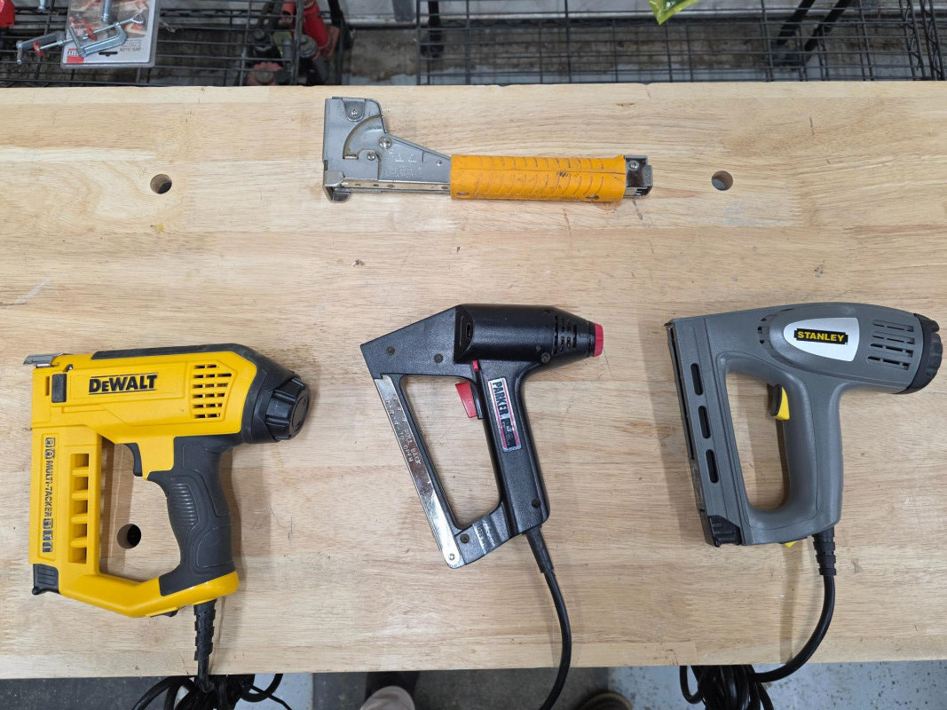 (3) Corded Electric Stapler/Nailers & Arrow Hammer Tacker (1) DeWalt Multi-Tacker - DWHT75021 (1) Parker Electric Stapler/Nailer -.TRE300 (1) Stanley Electric Staple & Nail Gun - TRE550 (1) Arrow HT-50P Hammer Tacker All Tested - All Work!