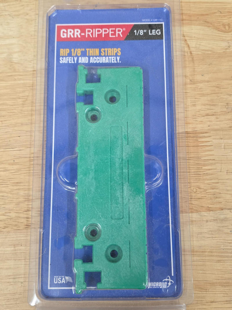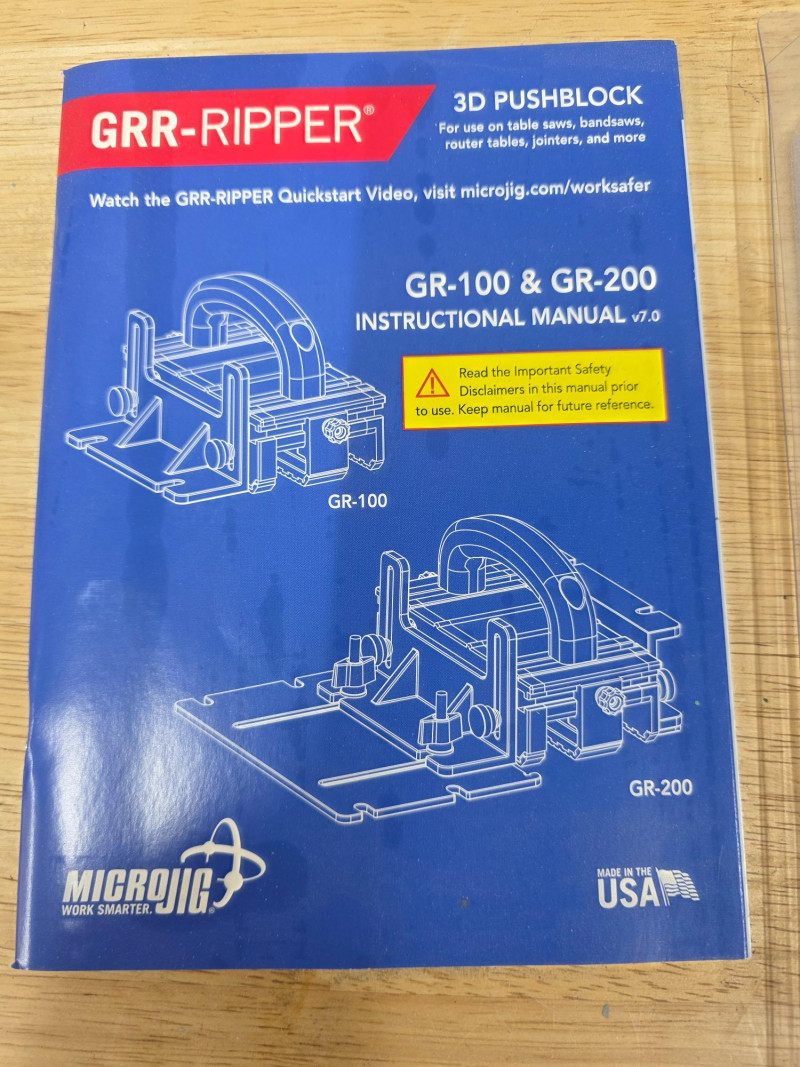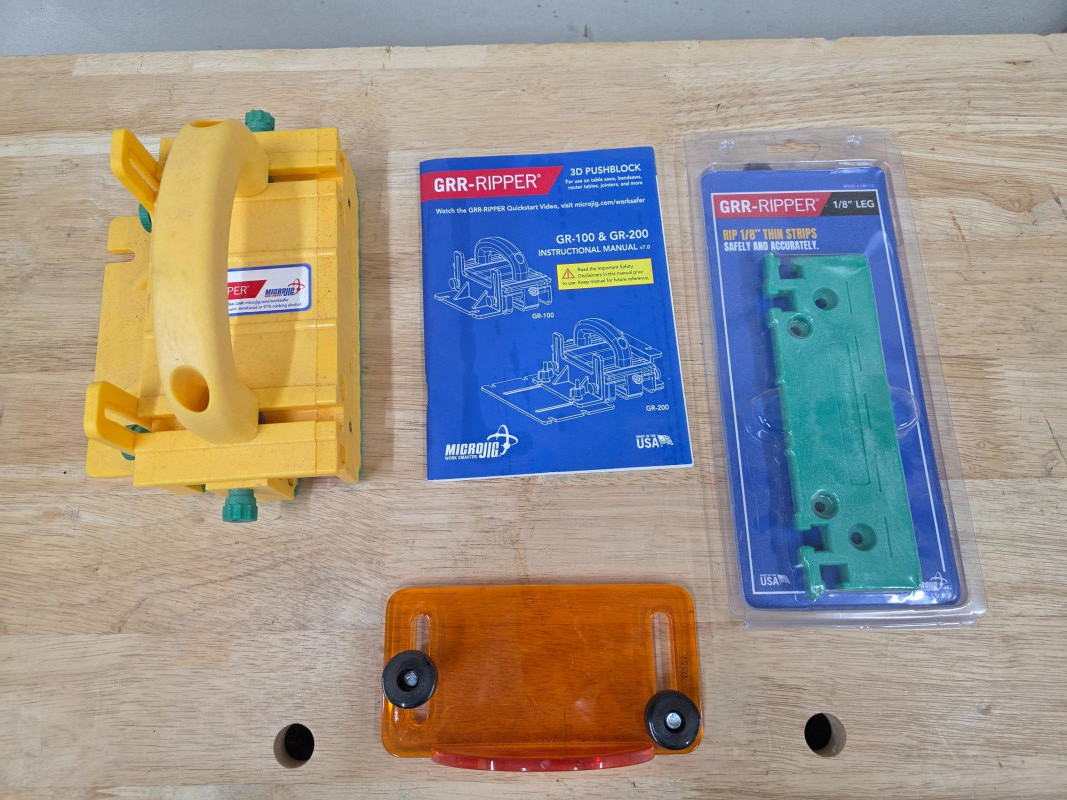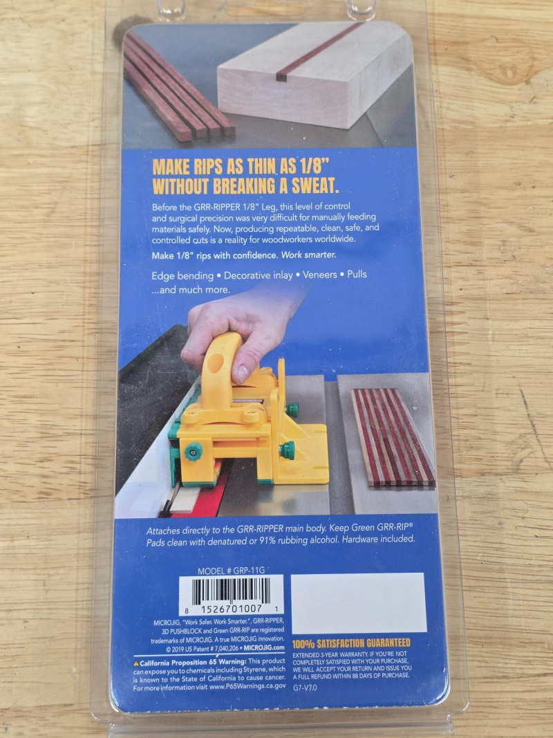 Microjig GRR-RIPPER 3D Pushblock GR-100 Used with table saws, router tables, band saws, and jointers. The 3-directional force system applies downward, inward, and forward pressure to stabilize material. It helps virtually eliminate kickback and keeps both sides of the cut parallel to the blade. The tool protects hands and fingers, enabling safer cuts for small pieces of wood Includes the accessory 1/8" Leg attachment - GRP-11G (new in package) Attaches to the GRR-RIPPER 3D Pushblock to safely rip ultra-thin wood strips down to 1/8 inch thickness Stay safe when woodworking!