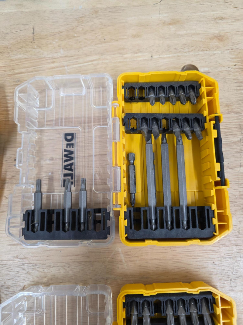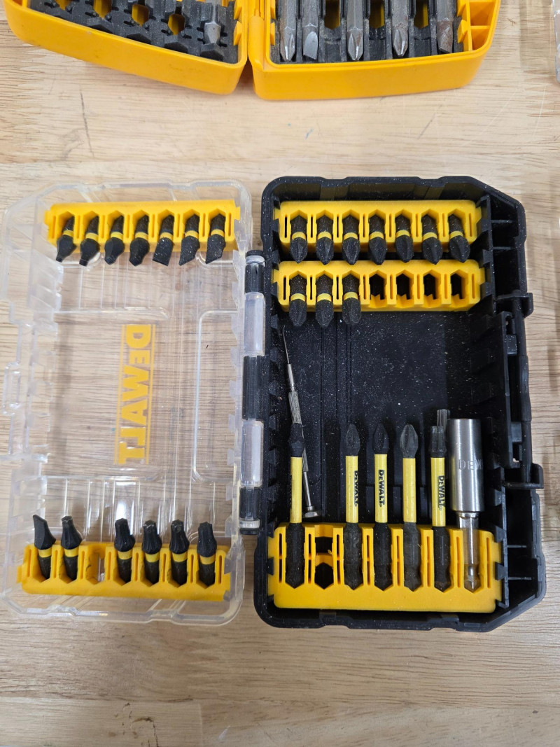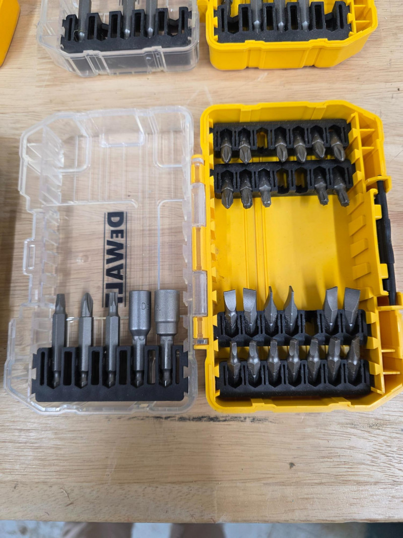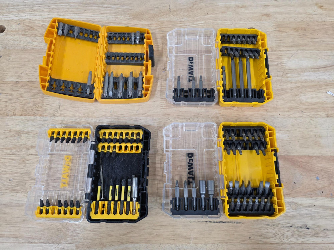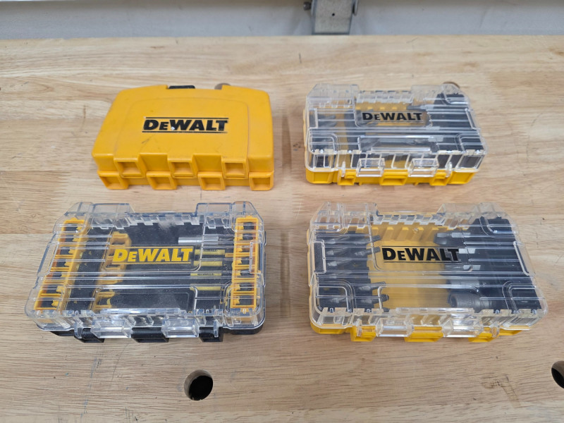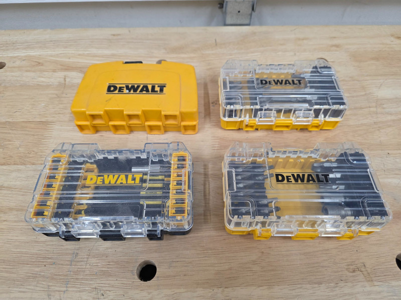 (4) DeWalt ToughCase Screw Bit Storage Boxes With Bits DeWalt Toughcases for organizing drill & screw bits. It is part of a connectable system designed to optimize storage space. The bit-bar design allows for easy removal and customizable placement of bits Bit sets are incomplete, I'd estimate 50% full Get organizing!