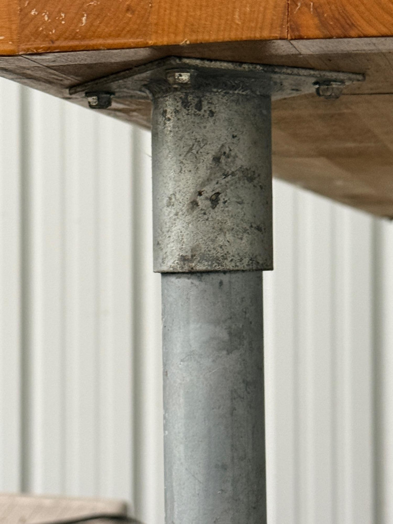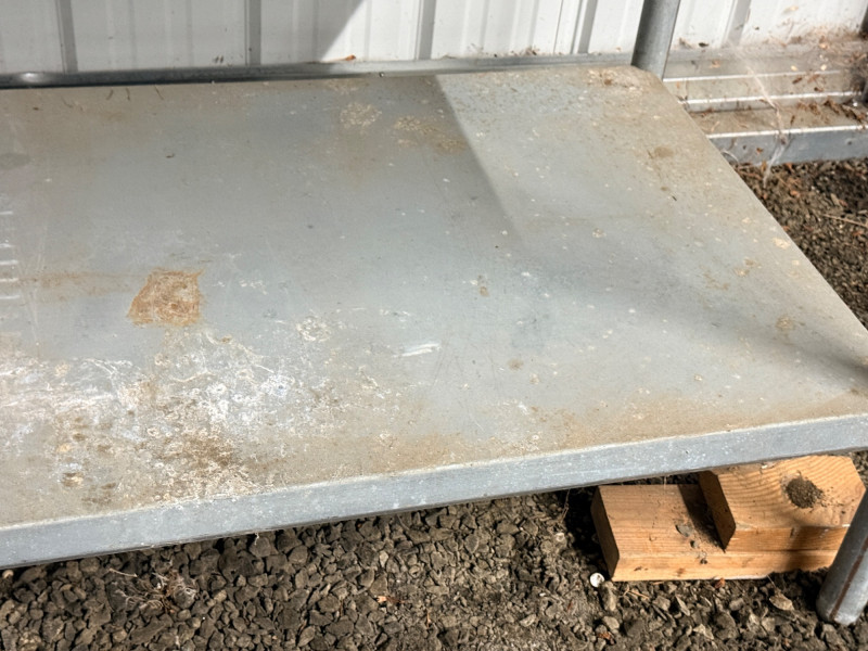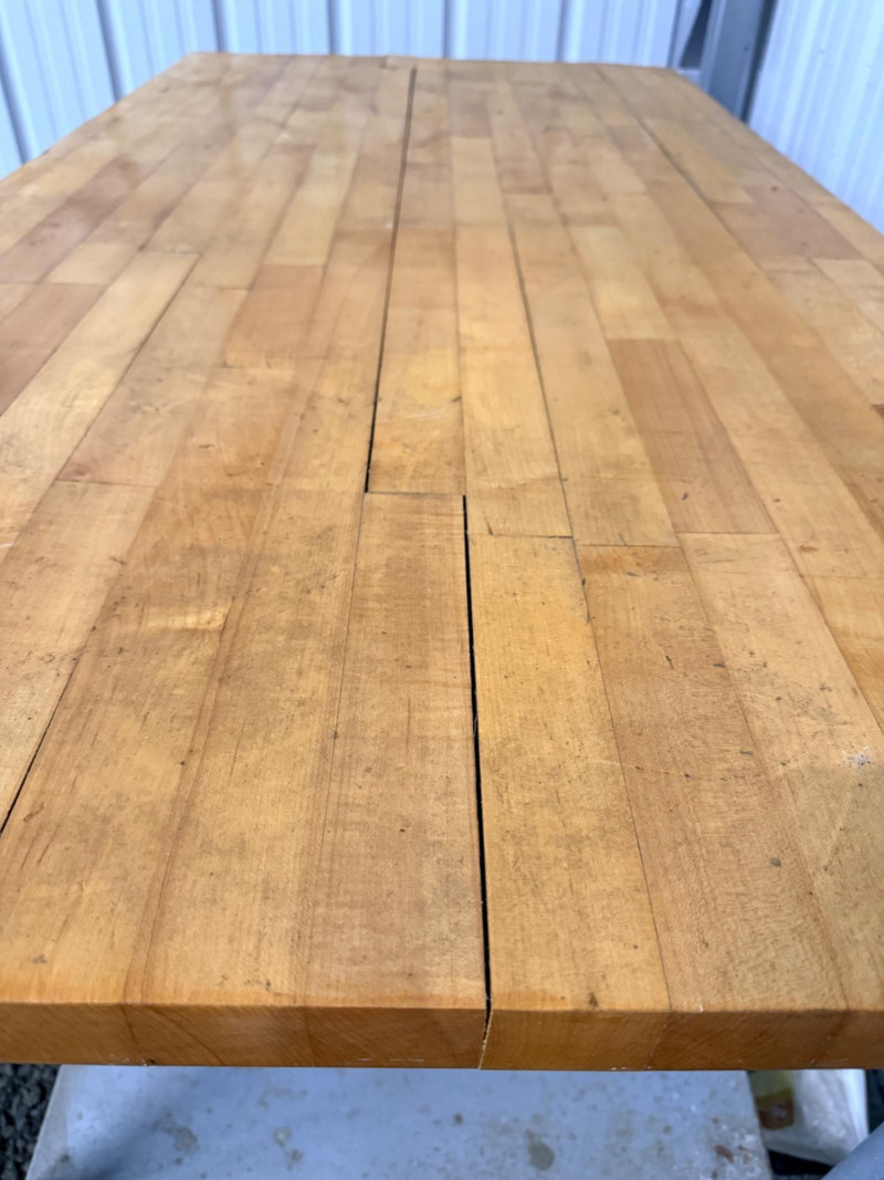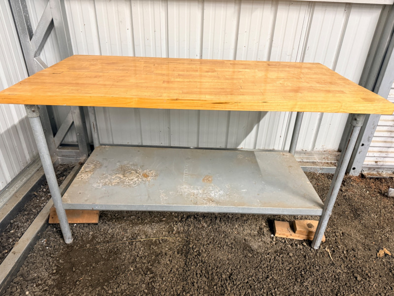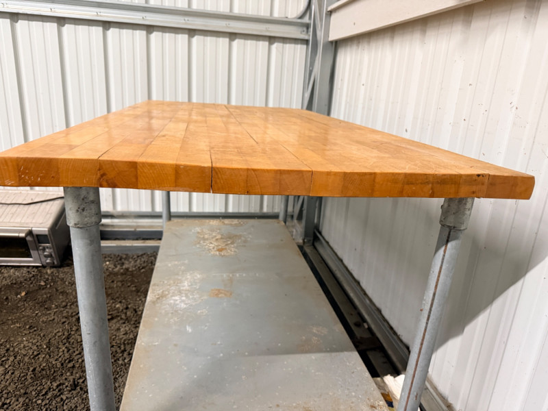 Butcher Block & Steel Prep Table Table measures 60“ x 31“ x 34“ with 1.5” butcher block top. Butcher block top has some splitting and shelf has corrosion. See pics.