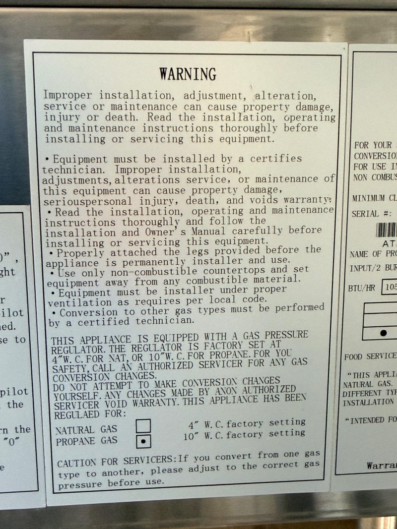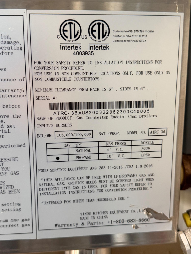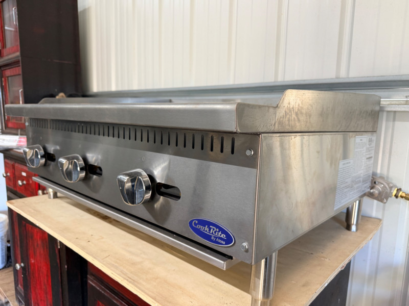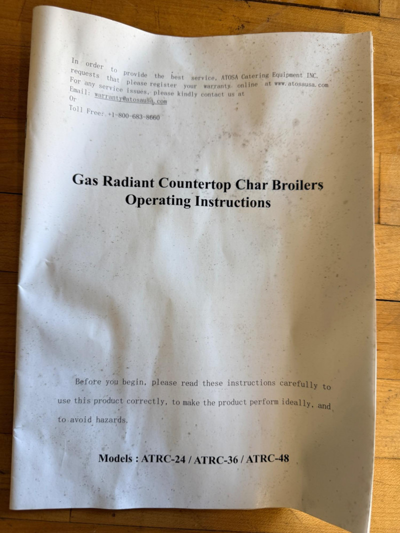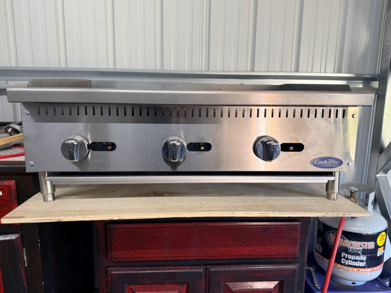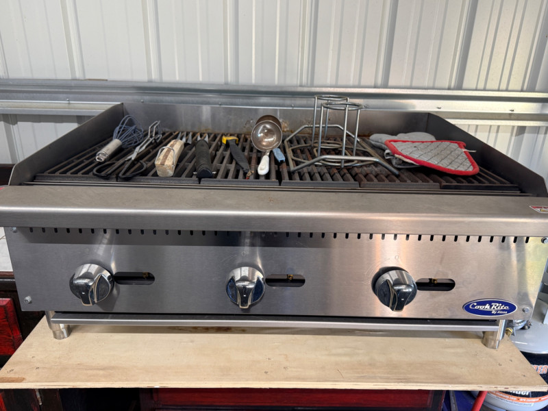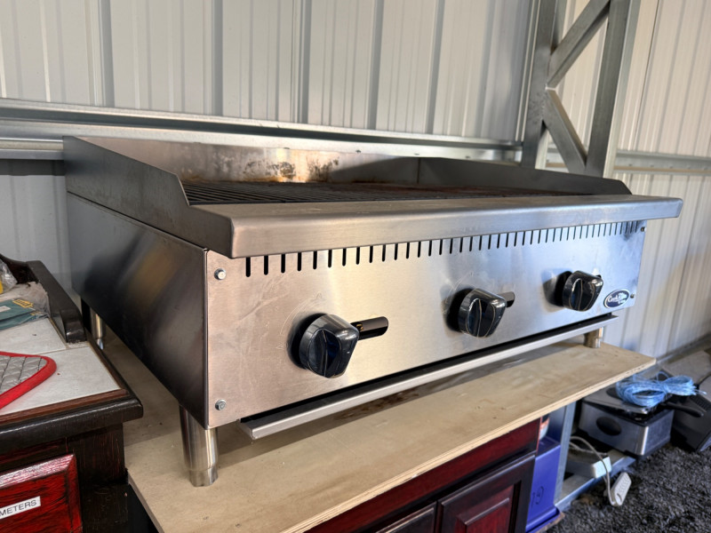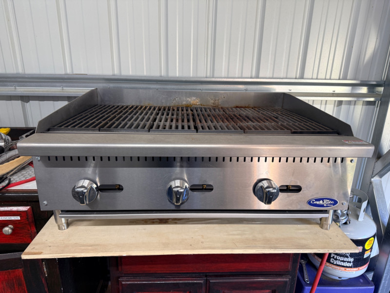 Commercial Gas Radiant Countertop Char Broiler - Cook Rite By Atosa 35.75“ x 28“x15.5” Stainless steel propane 3 burner char broiler. Untested. Propane tank included. Can burn natural gas too.
