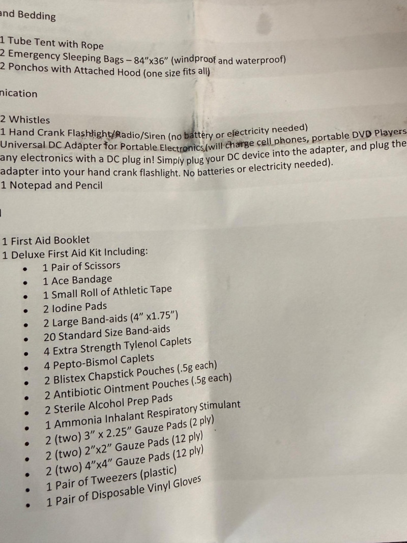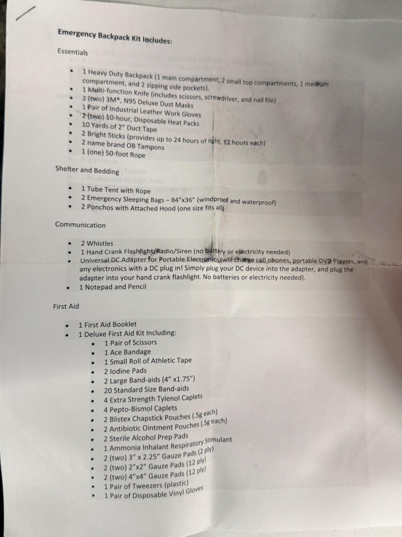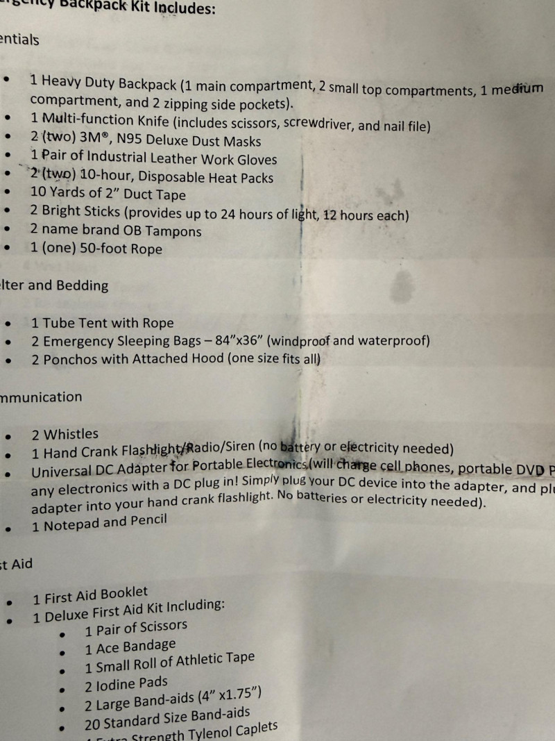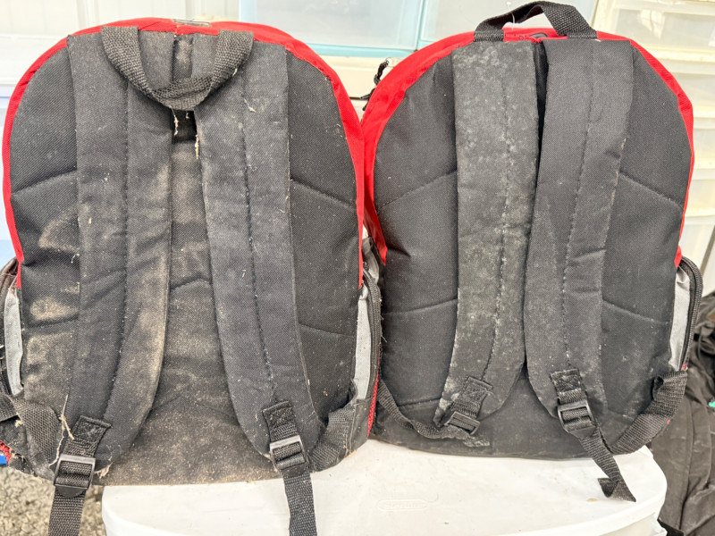 2 Bug Out Emergency Backpack Kits. Inventory wasn't verified, but they both look complete, minus toilet paper. Backpacks need mildew cleaning.