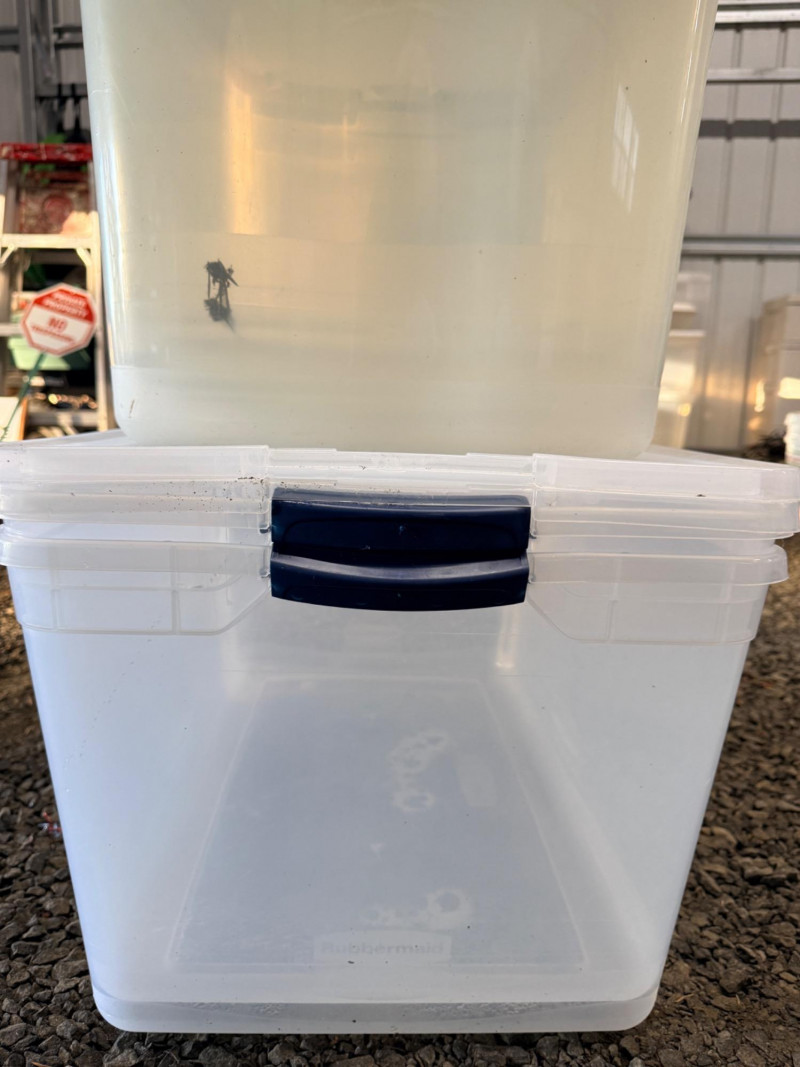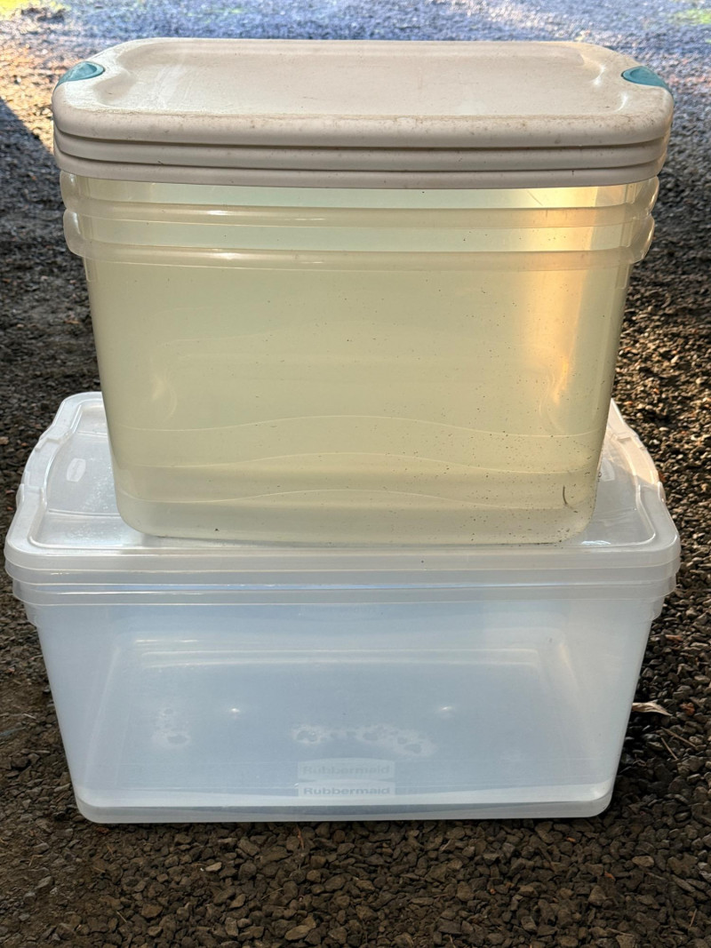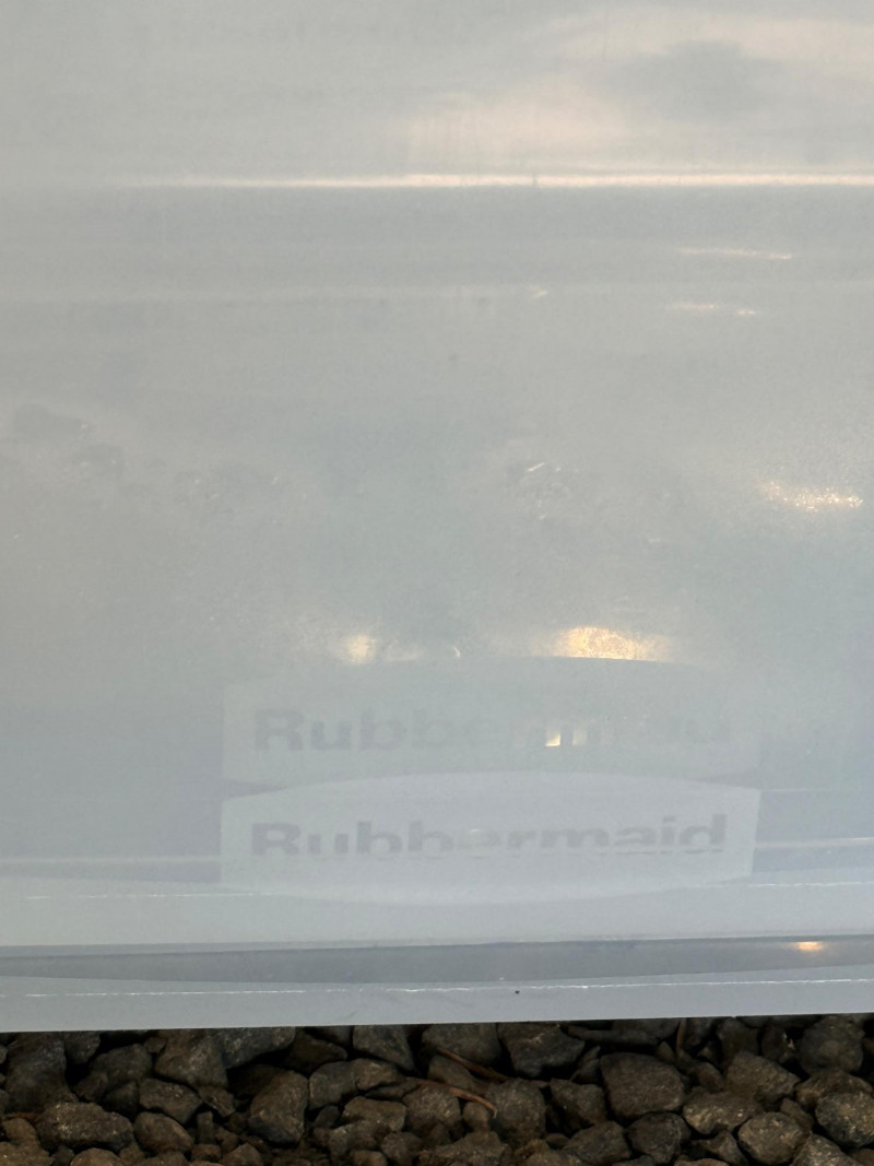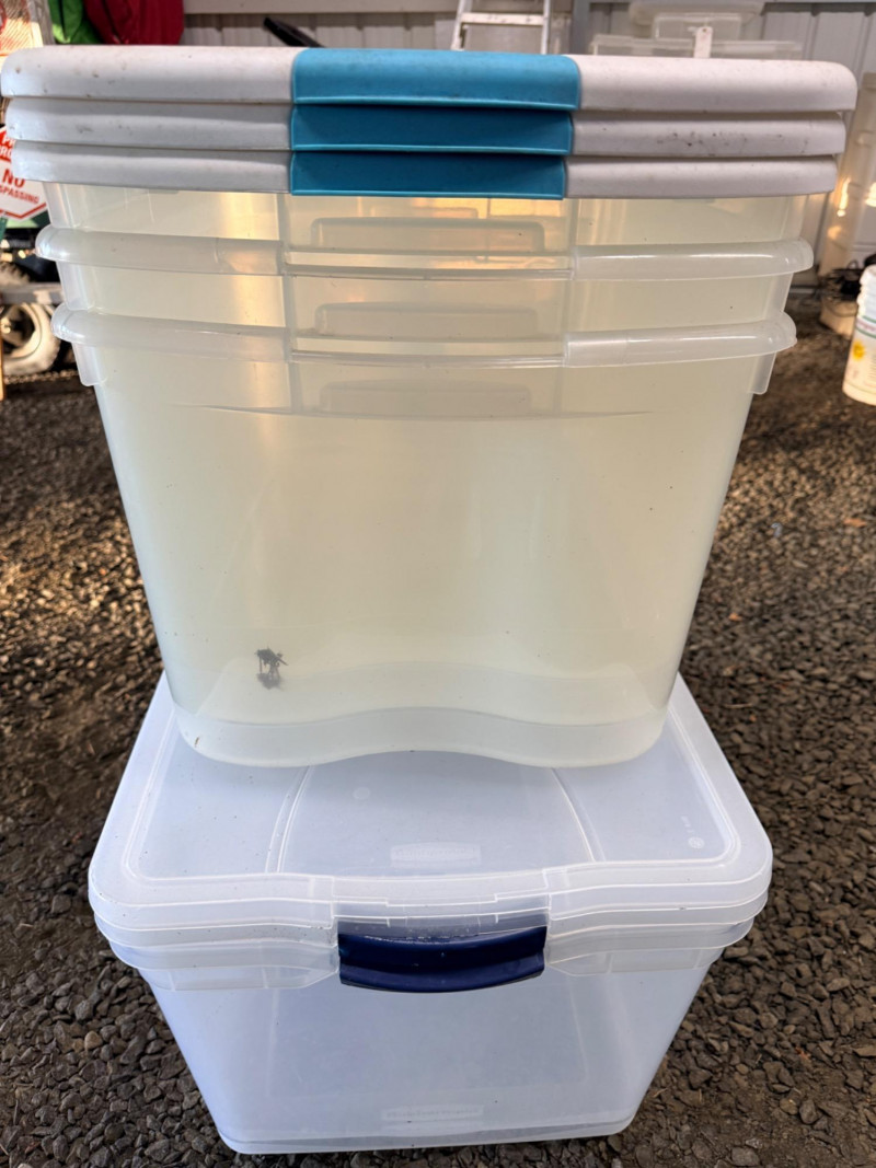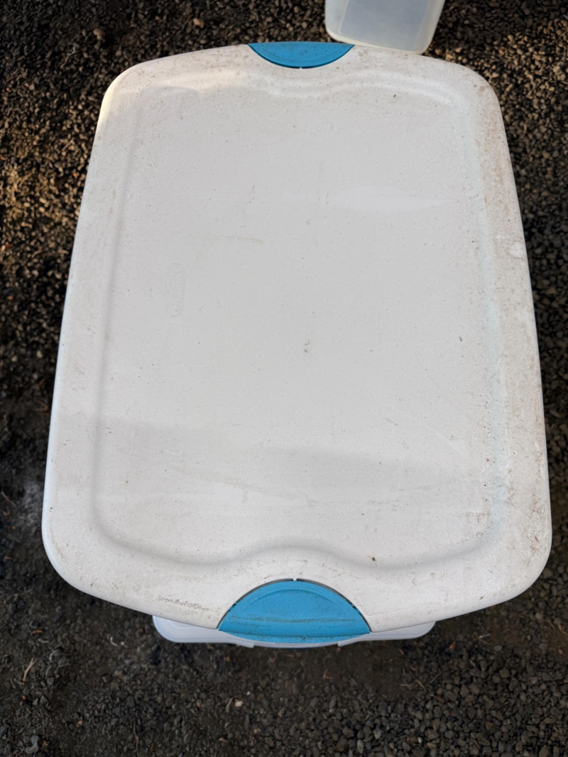 (5) Storage Totes 3 Sterilite totes with white and teal lids measure 24” x 17.5” x 13.5” tall. 2 Rubbermaid Clear totes measure 28.25” x 17.5” x 13.5” tall