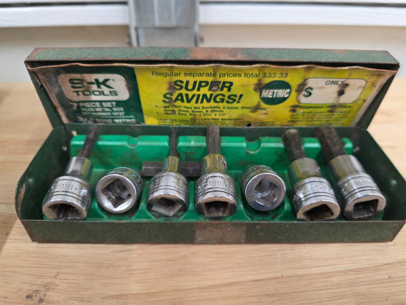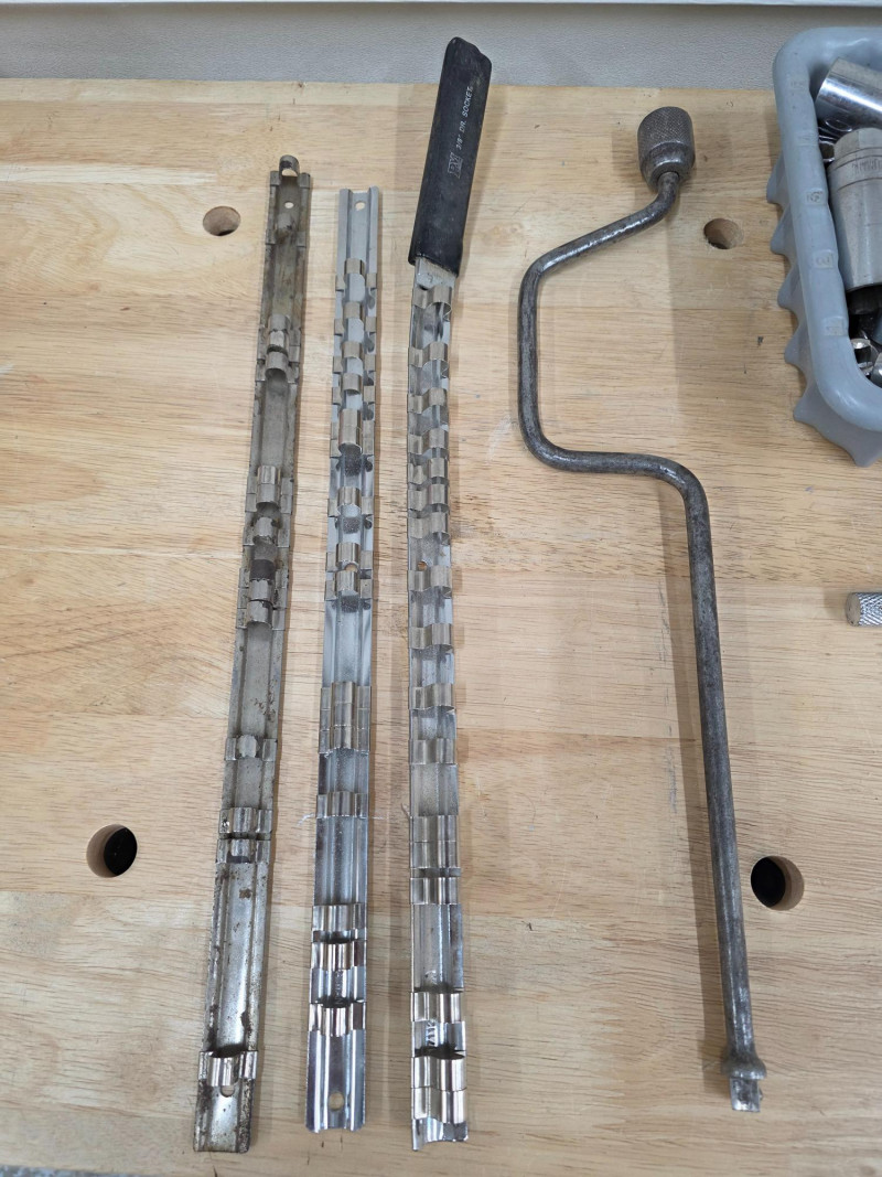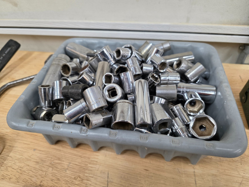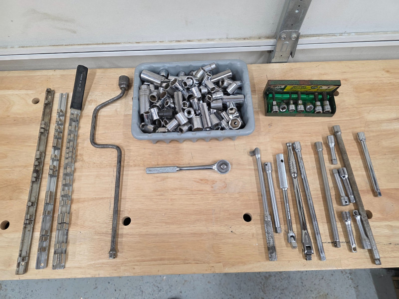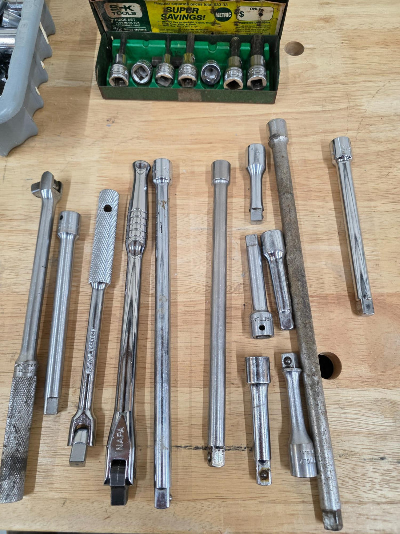 3/8" Drive Sockets, Ratchets, Extensions, & More! (1) 3/8" drive ratchets (13) 3/8" drive extensions (1) 3/8" drive speeder handle (3) 3/8" socket organizers (1) SK Tools 7-piece metric hex bit socket set Entire 8" x 11" bucket full of 3/8" drive SAE & metric sockets