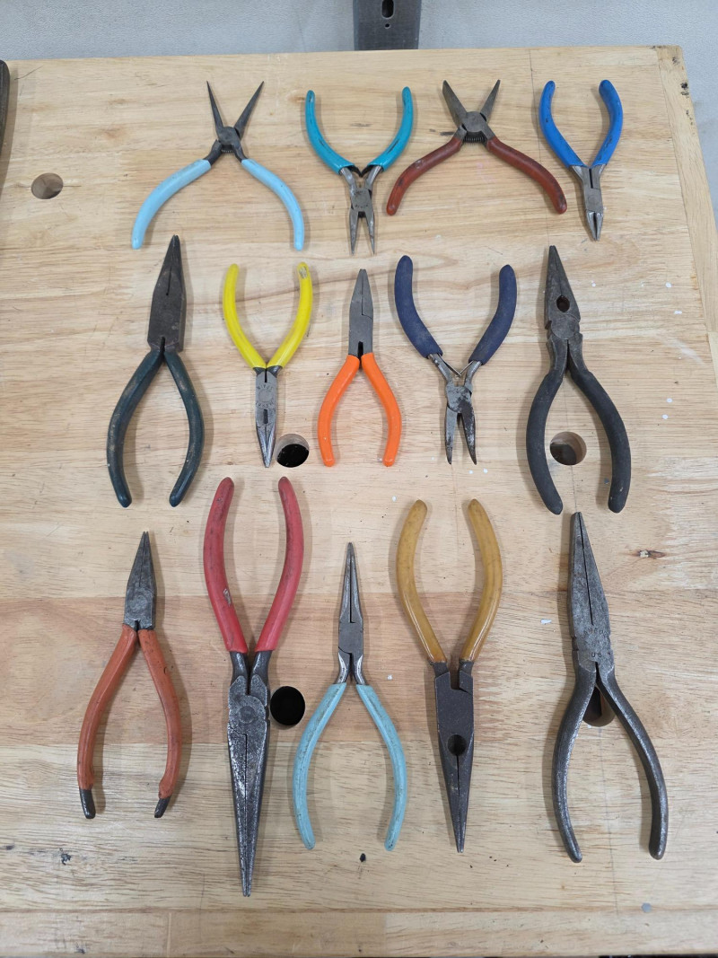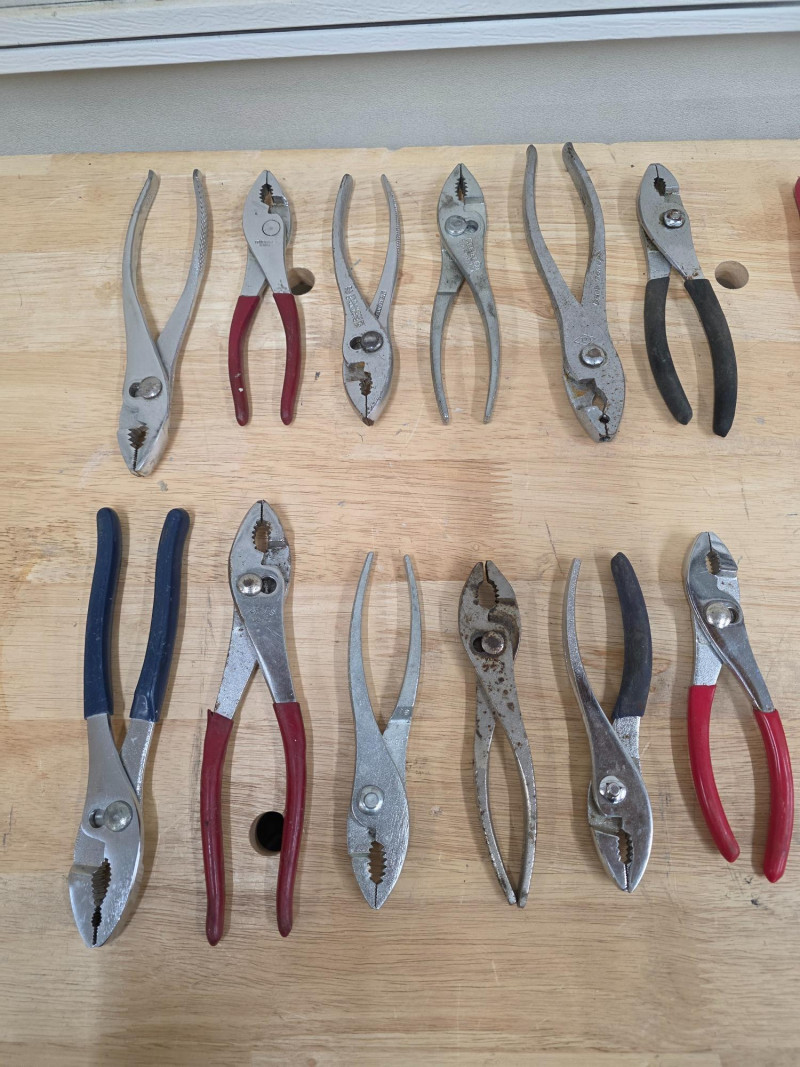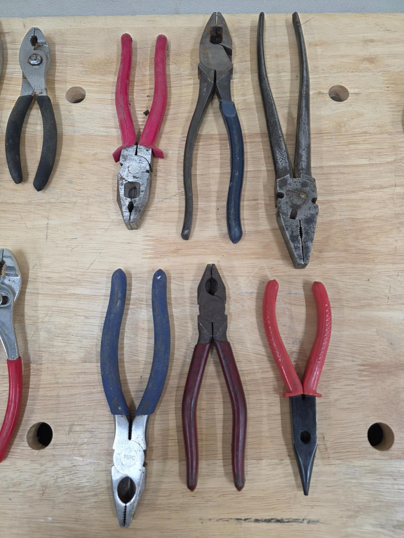 (32) Pliers: Slipjoint, Lineman's, Needle Nose (12) Slipjoint Pliers 6" - 8" (6) Lineman's Pliers 6" - 10.5" (14) Needle Nose Pliers 4.5" - 7.5" 32 sets of pliers in all!