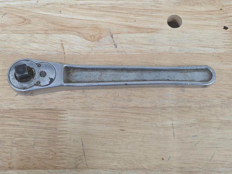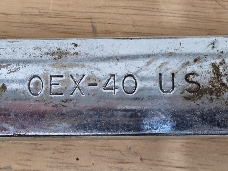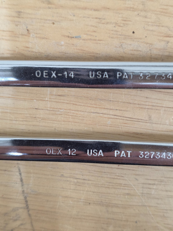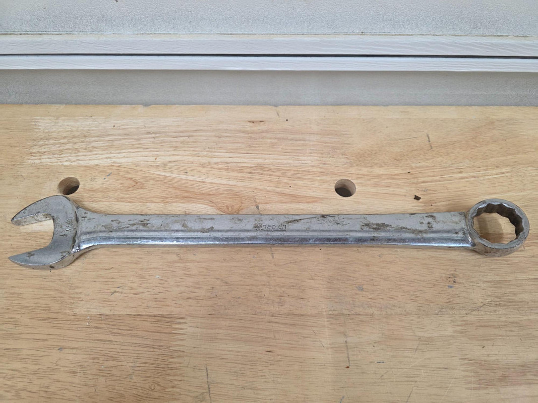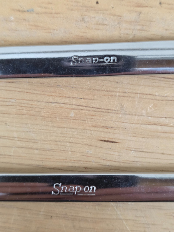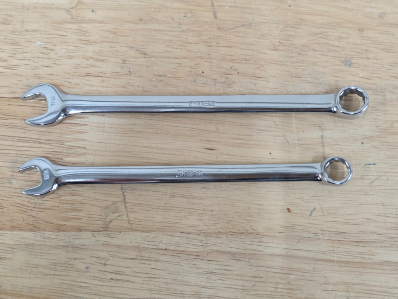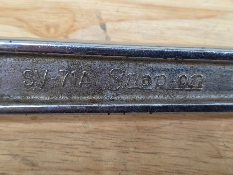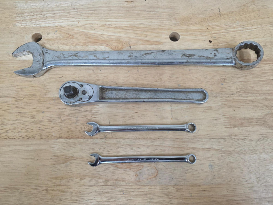 (4) Snap-On Hand Tools (1) Snap-On #OEX-40 is a 1-1/4" SAE combination wrench with an open end and a 12-point box end (1) Snap-On #SV-71A is a vintage 1/2" drive standard ratchet (1) Snap-On #OEX-14 is a 7/16" SAE 12-point flank drive combination wrench (1) Snap-On #OEX12 is a 3/8", 12-point SAE combination wrench with a standard handle and chrome finish 4 Snap-On tools in all!